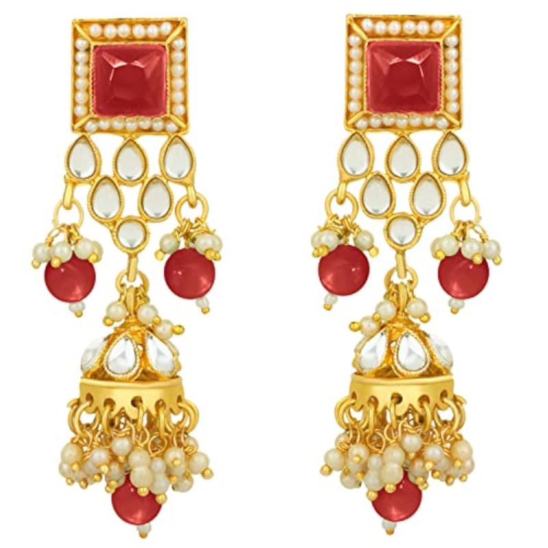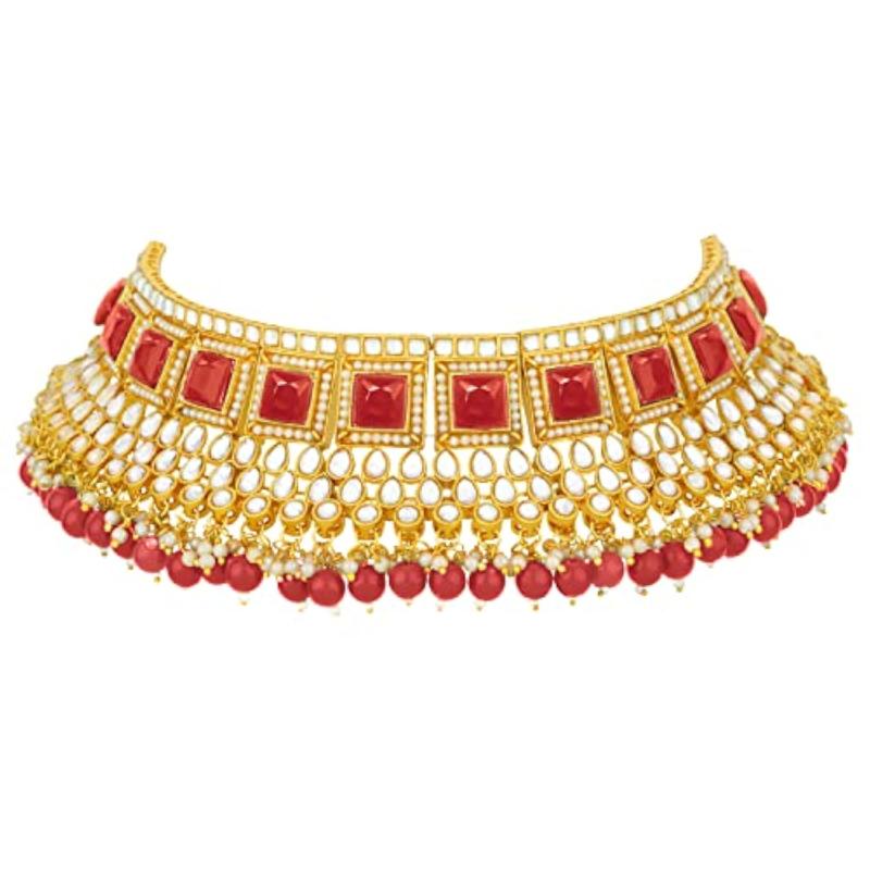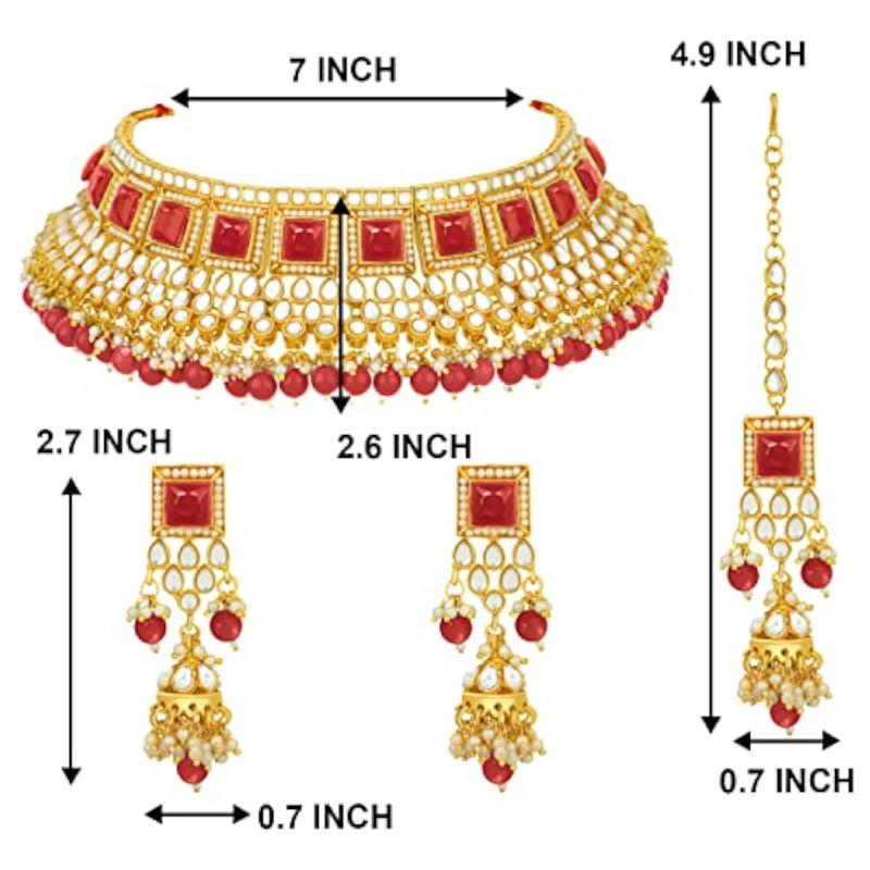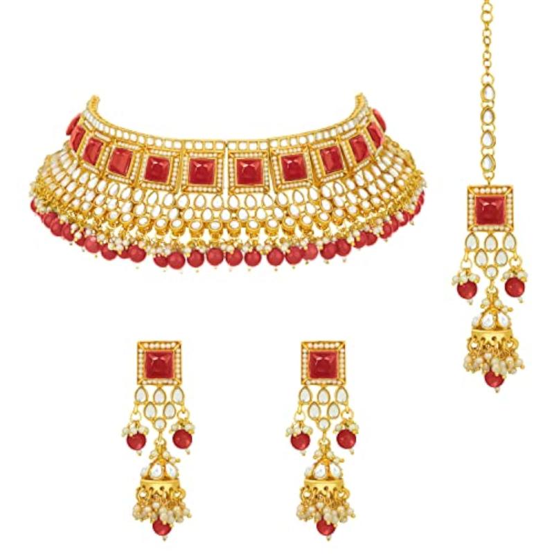 Elegant choker necklace with earrings and maang tikka set embellished with plated kundan and faux pearls.