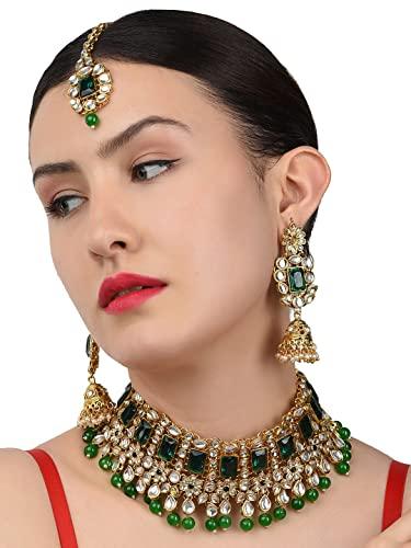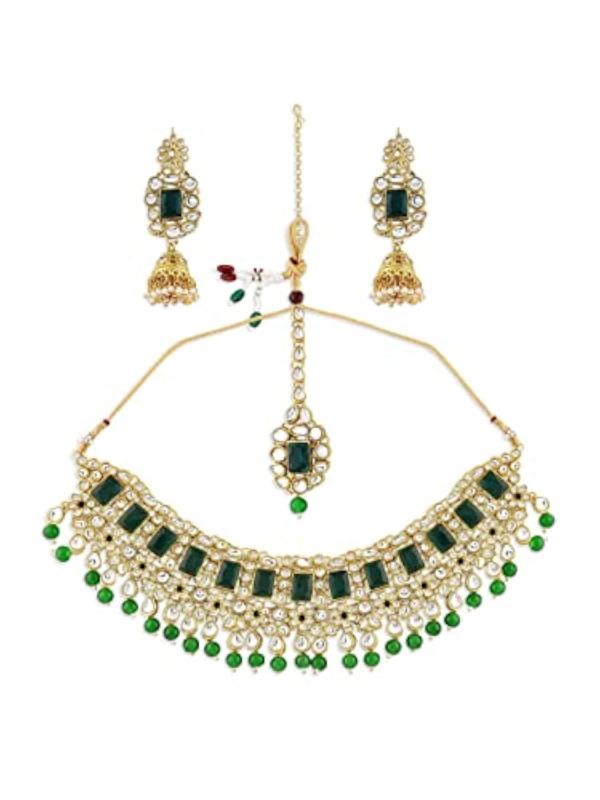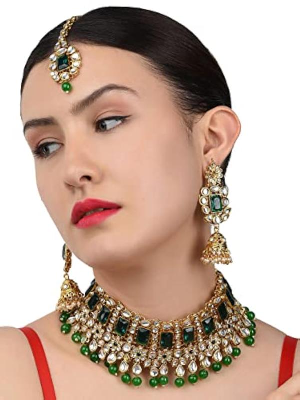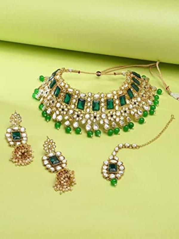 Elegant bridal choker necklace set with traditional Kundan and green beads design. Perfect for weddings and special occasions.