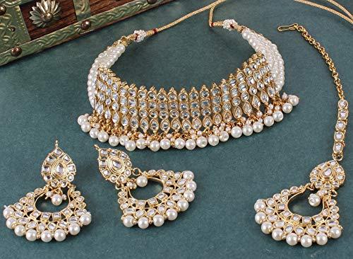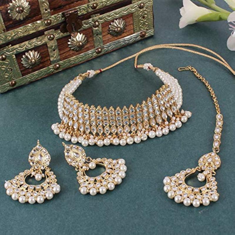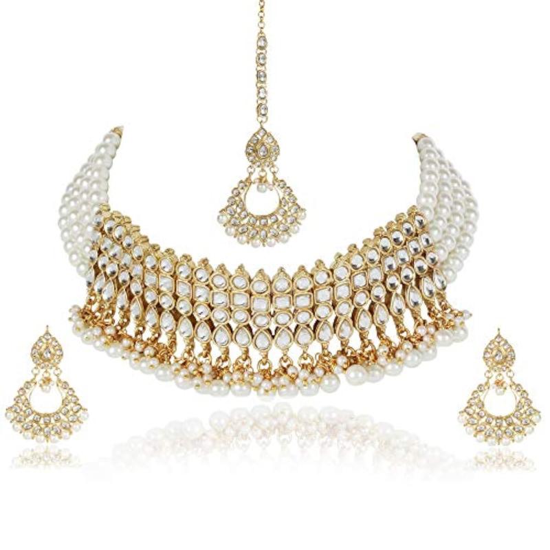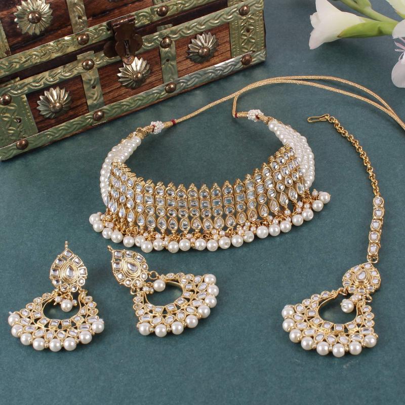 Elegant Kundan Pearl Choker Necklace Set perfect for weddings. Exudes traditional charm.