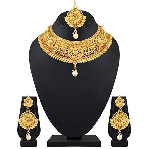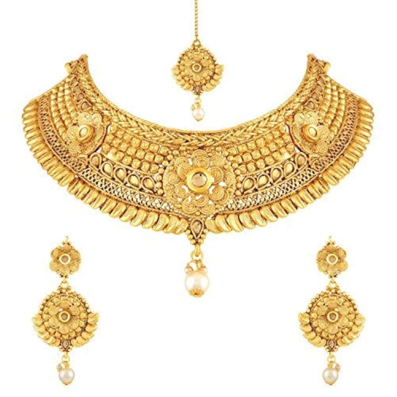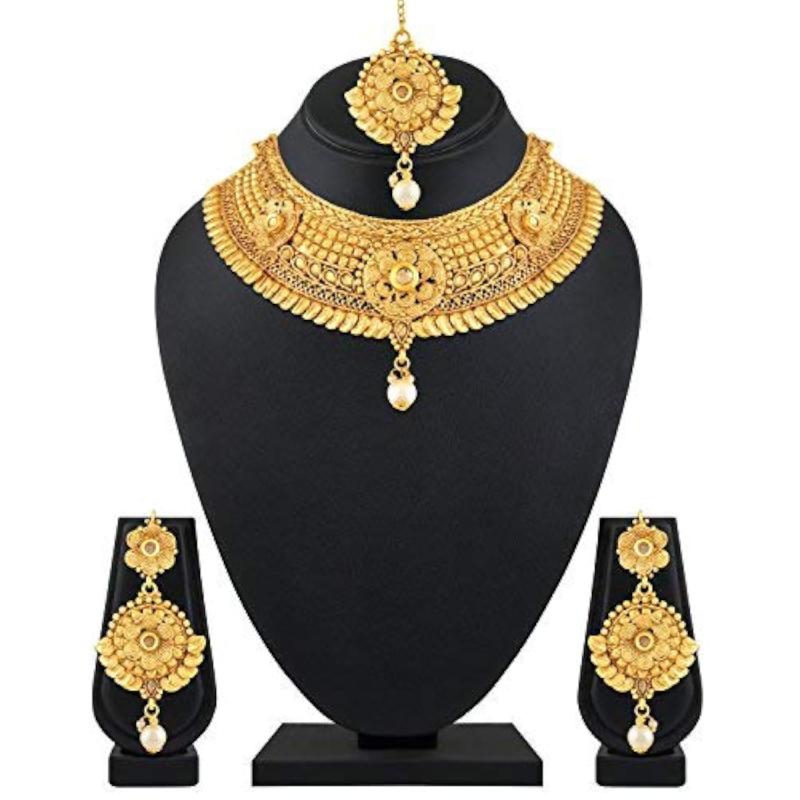 Elegant and traditional Kundan plated choker style necklace set with matching Mangtikka. Perfect for weddings and special occasions.
