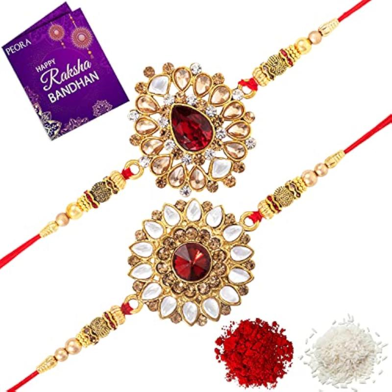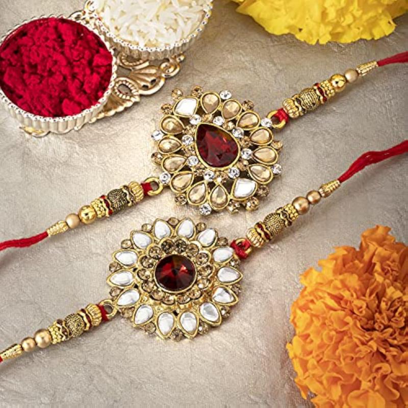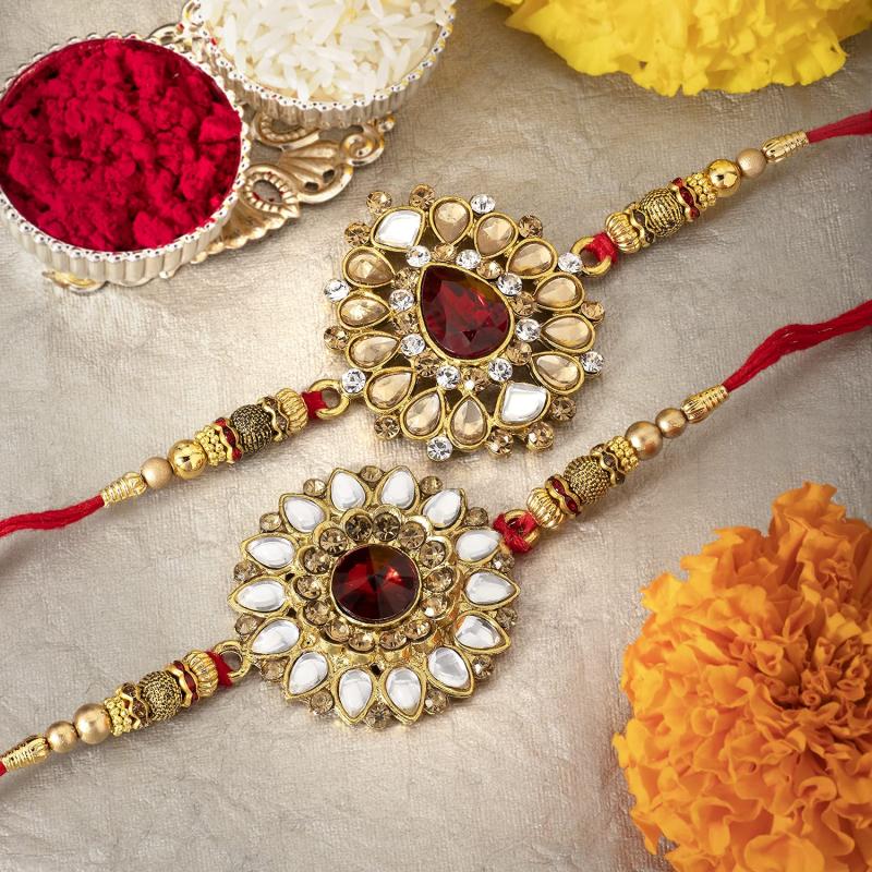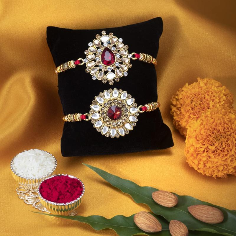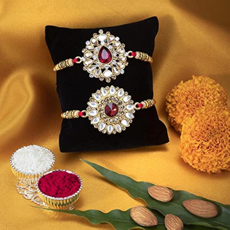 Celebrate Raksha Bandhan with this beautiful Kundan stone rakhi set for your brother. The set includes 2 rakhis, a Raksha Bandhan greeting card, and roli chawal for the auspicious occasion.