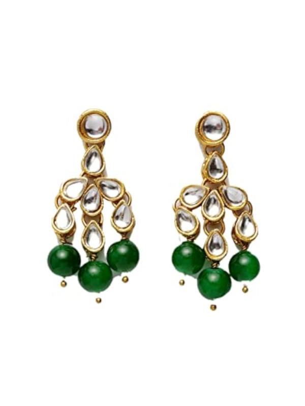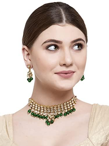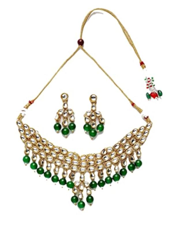 Elegant jewellery set featuring kundan studded design with gold-plated finish, perfect for formal and festive occasions.