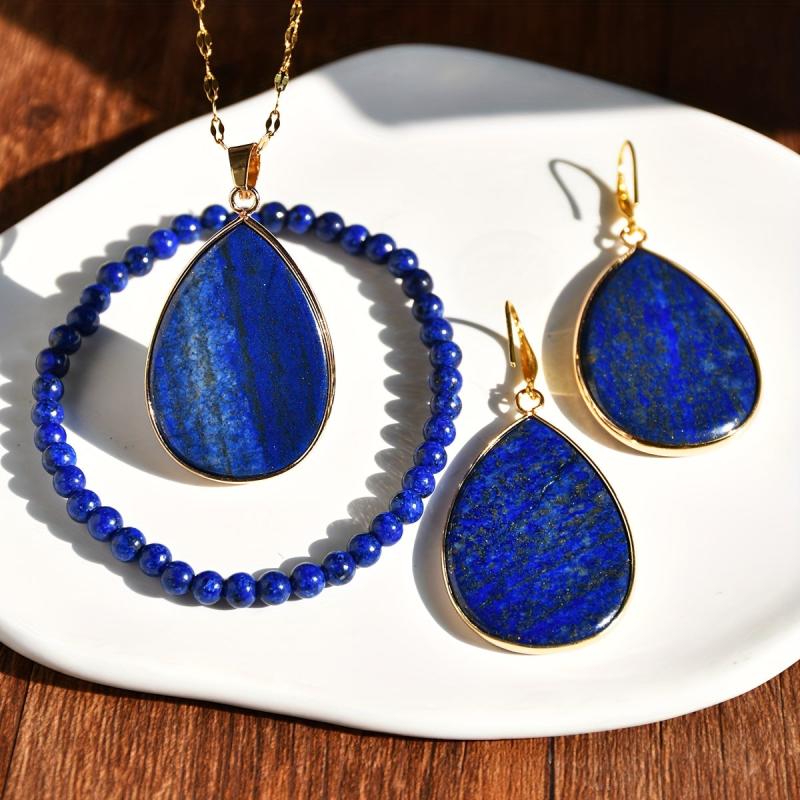 This set includes 4pcs of lapis lazuli dangle earrings and necklace, featuring teardrop crystals with a golden tone. Perfect for daily wear, parties, and makes an ideal gift for Mother's Day.