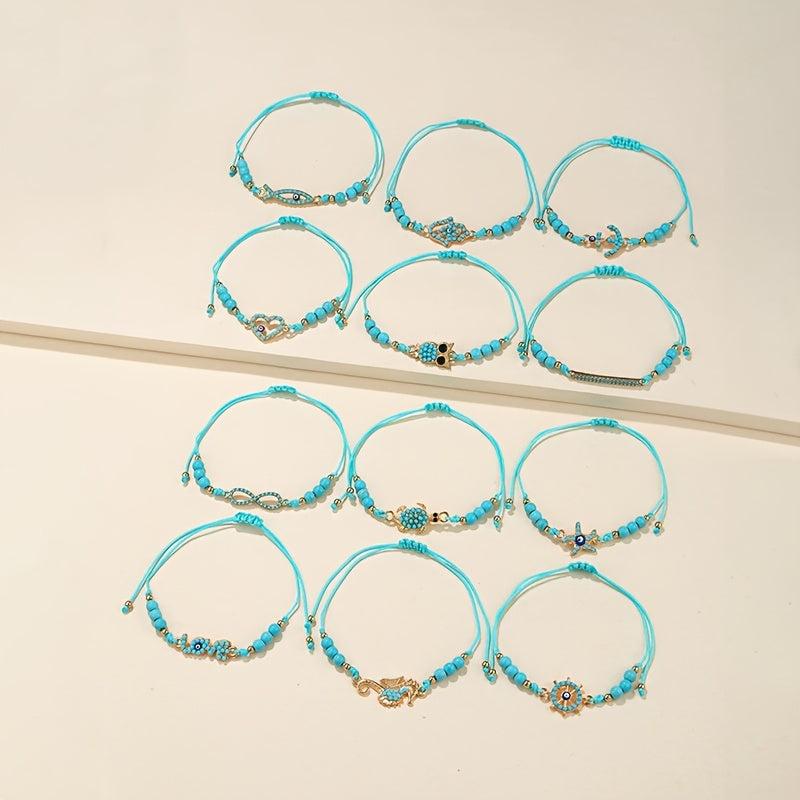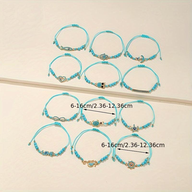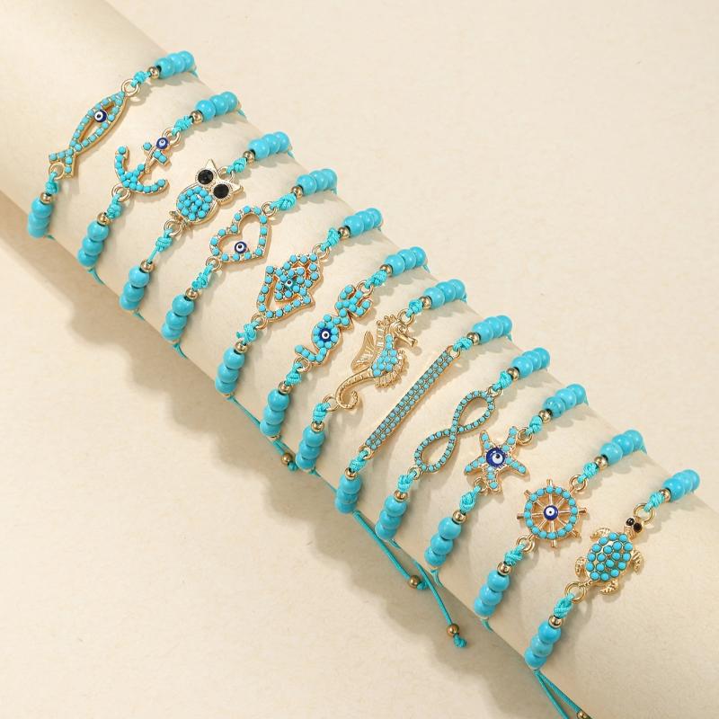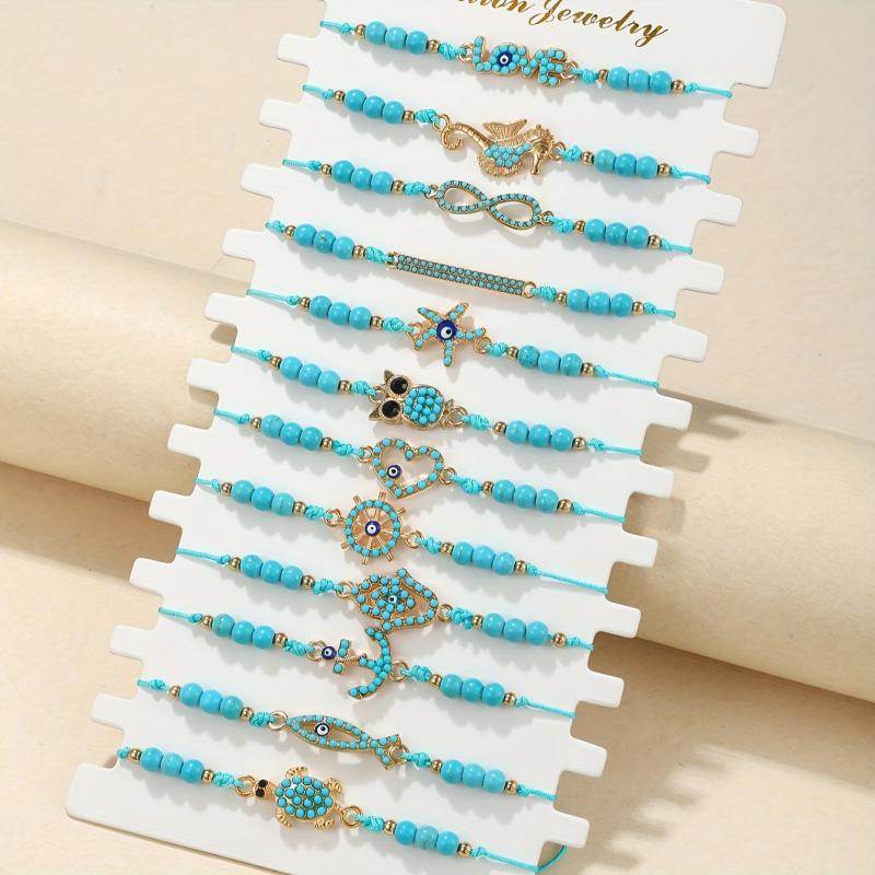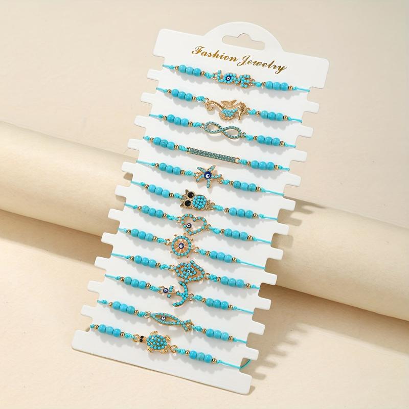 Elegantly crafted set of 12pcs bracelets featuring demon eye inlaid lapis lazuli stones. Includes a charming sea turtle and infinity love element pendant bracelet.