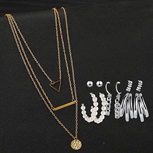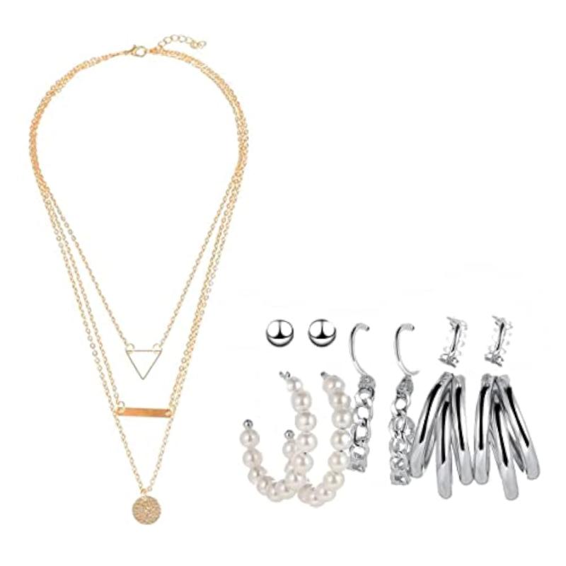 Elegant combo of a plated layered necklace and a set of 6 contemporary studs and hoop earrings. Perfect for adding a touch of sophistication to any outfit.