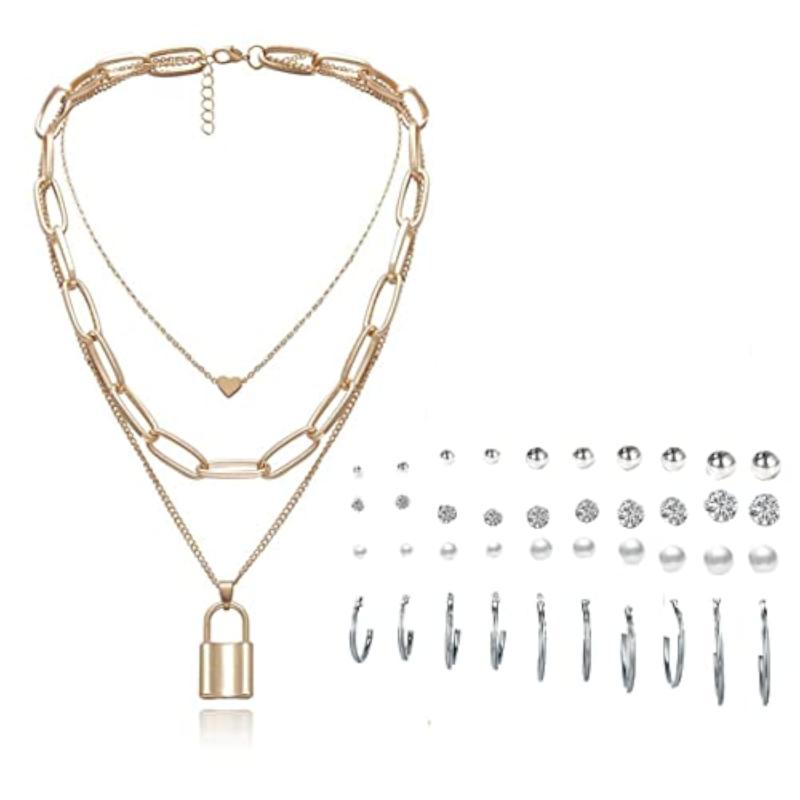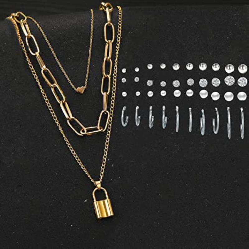 Layered Necklace & Silver Studs Hoop Earrings Set Combo