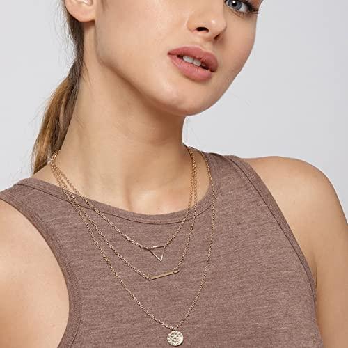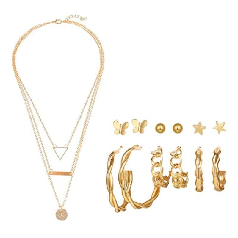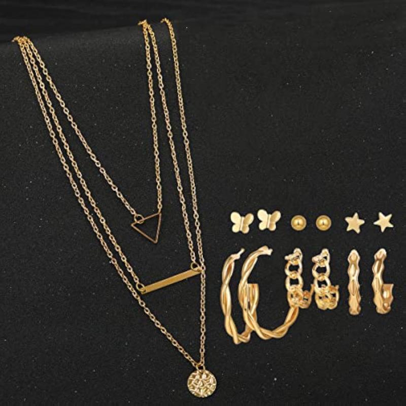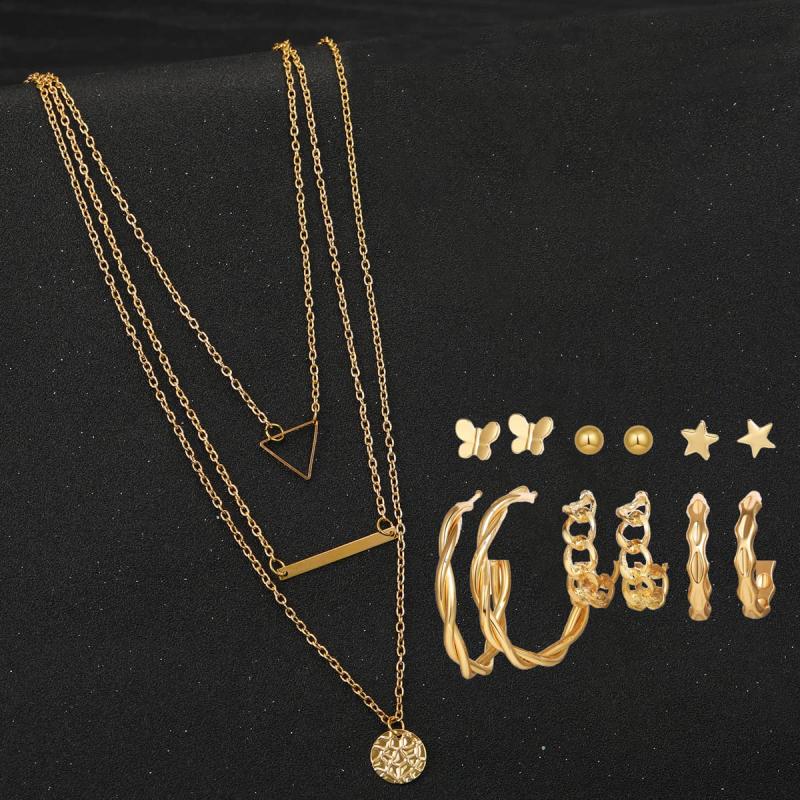 Elevate your style with this trendy combo set featuring a plated layered necklace and a set of 6 contemporary studs and hoop earrings.