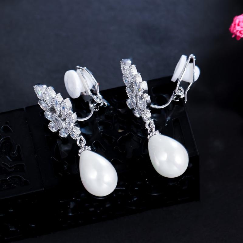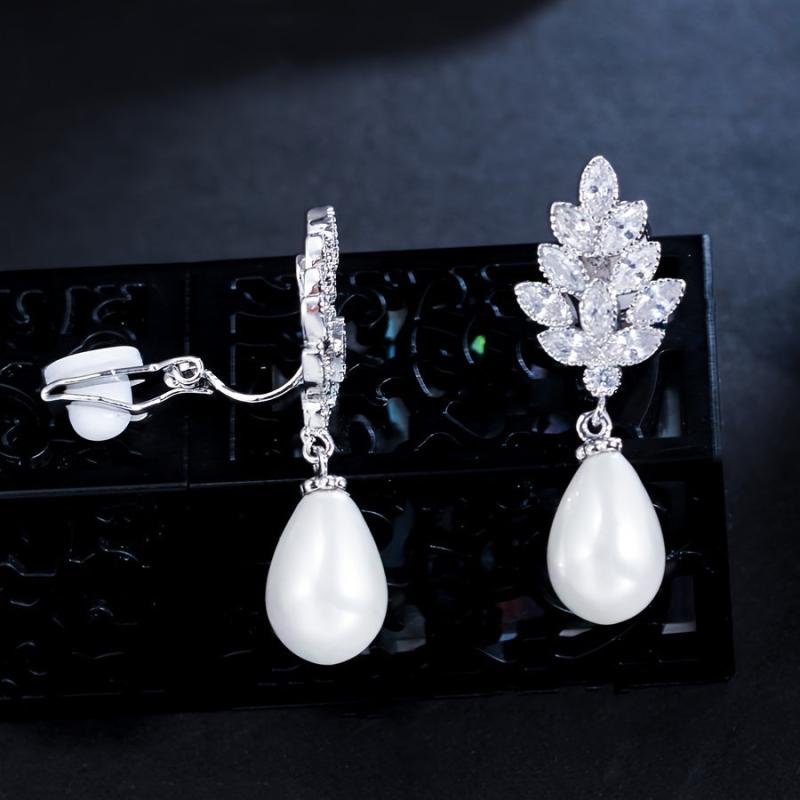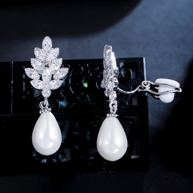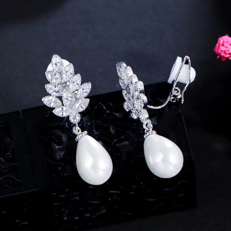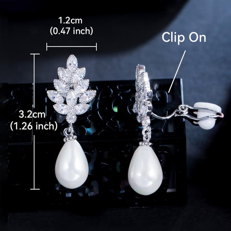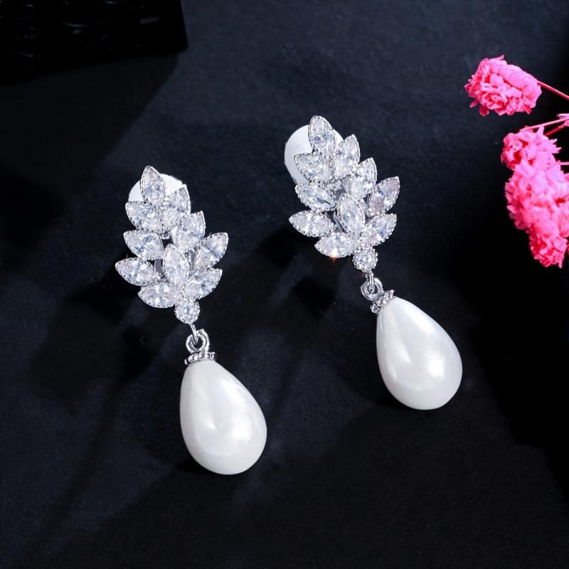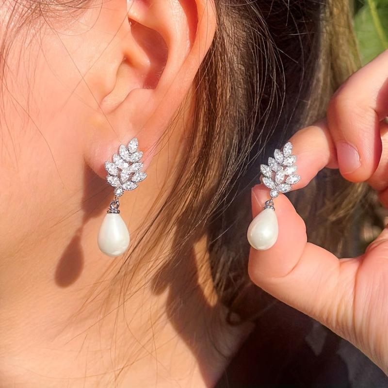 Add a touch of elegance to your outfit with these leaf-shaped faux pearl stud earrings. Perfect for weddings, banquets, parties, and holiday themes. Silver plated with synthetic cubic zirconia pearls.