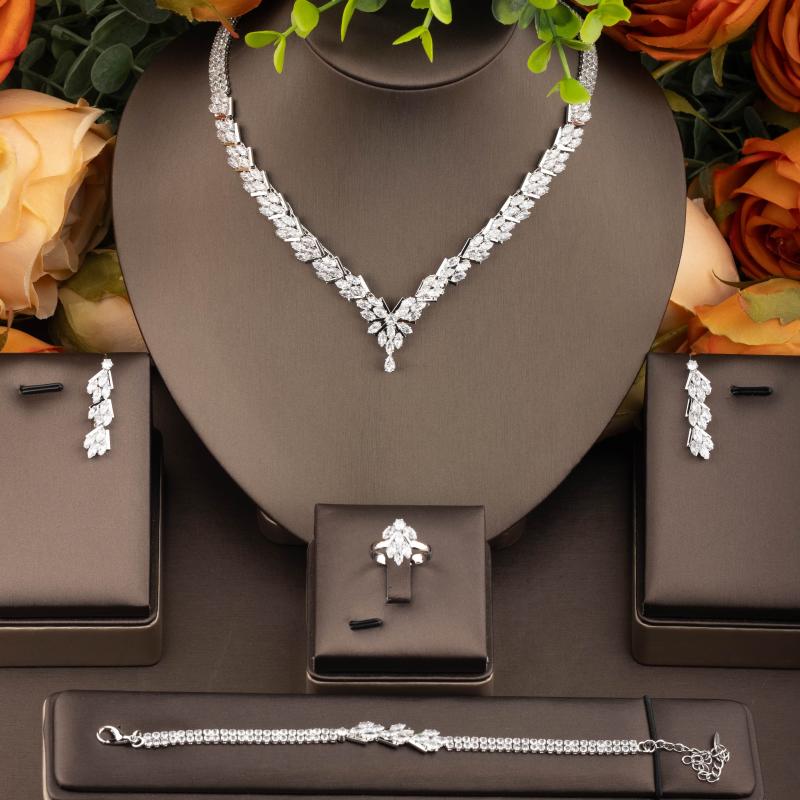 Complete your wedding look with this elegant cubic zirconia leaf shaped jewelry set. Perfect for weddings and formal events.