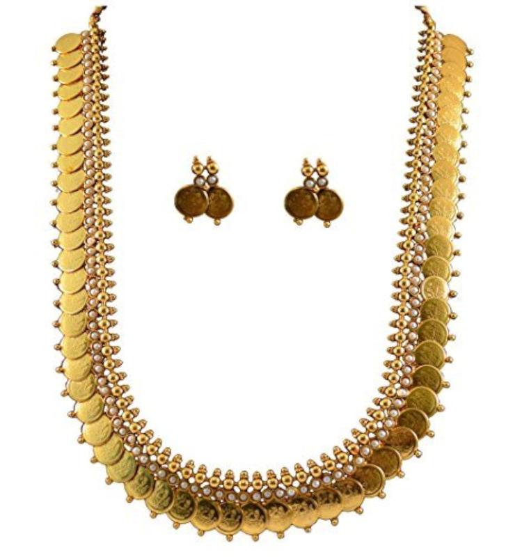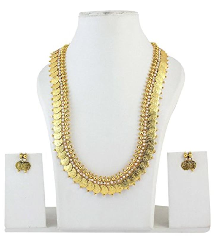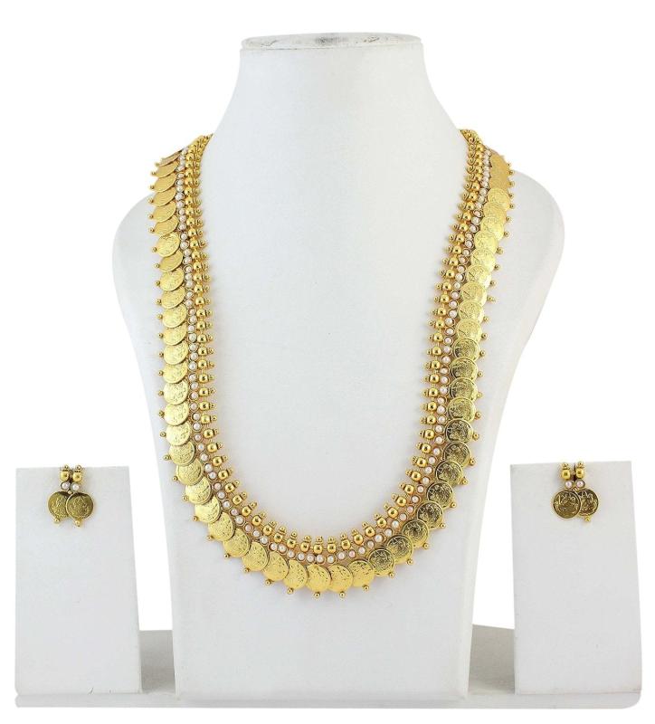 Exquisite traditional necklace set with earrings featuring long Maharani pearl temple coin design, perfect for women.