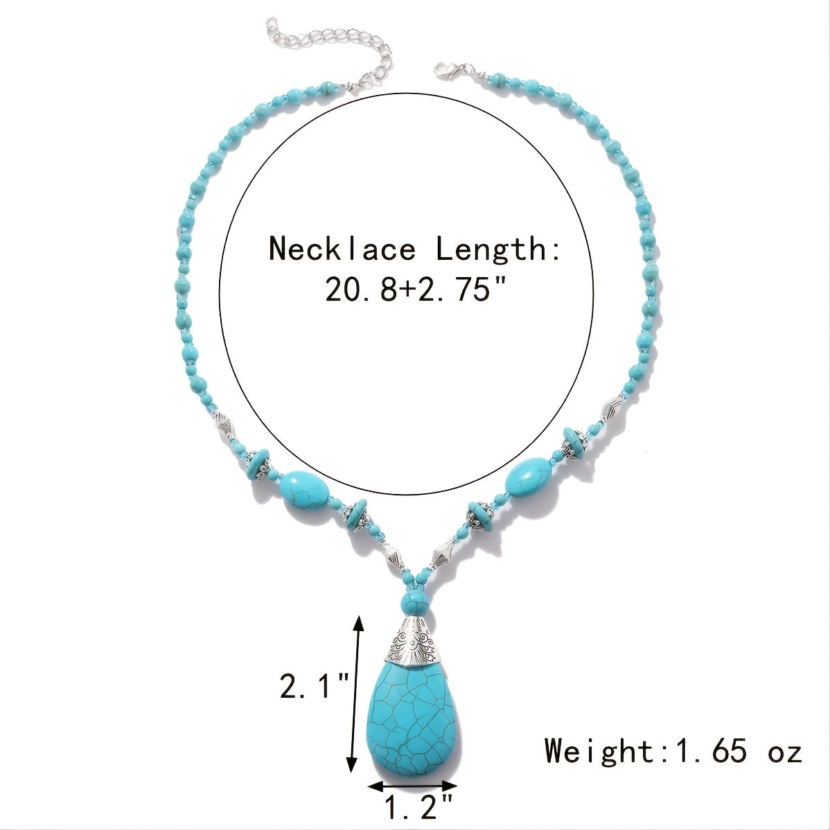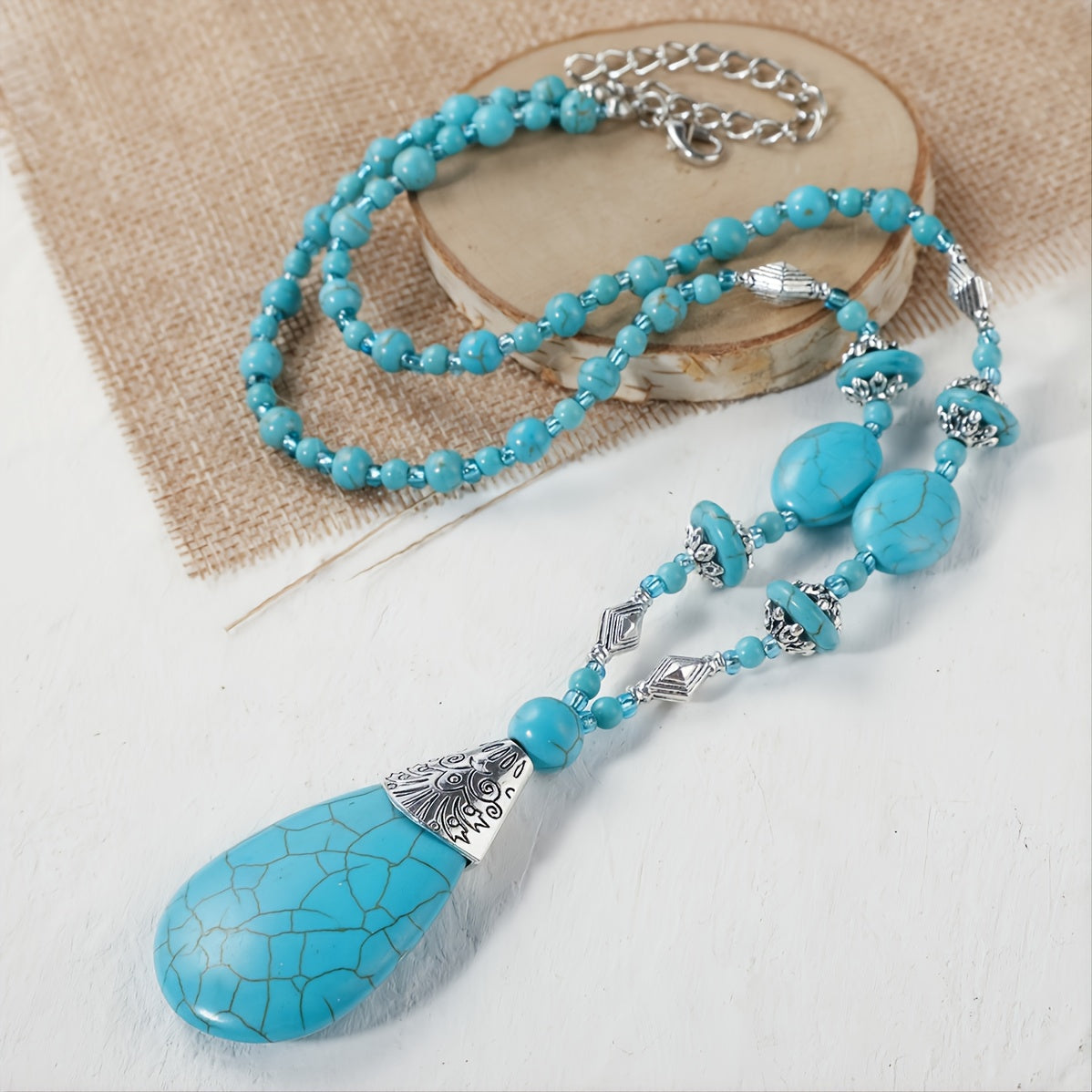 Embrace your ethnic style with this long teardrop shaped natural turquoise pendant necklace. A unique and eye-catching accessory.