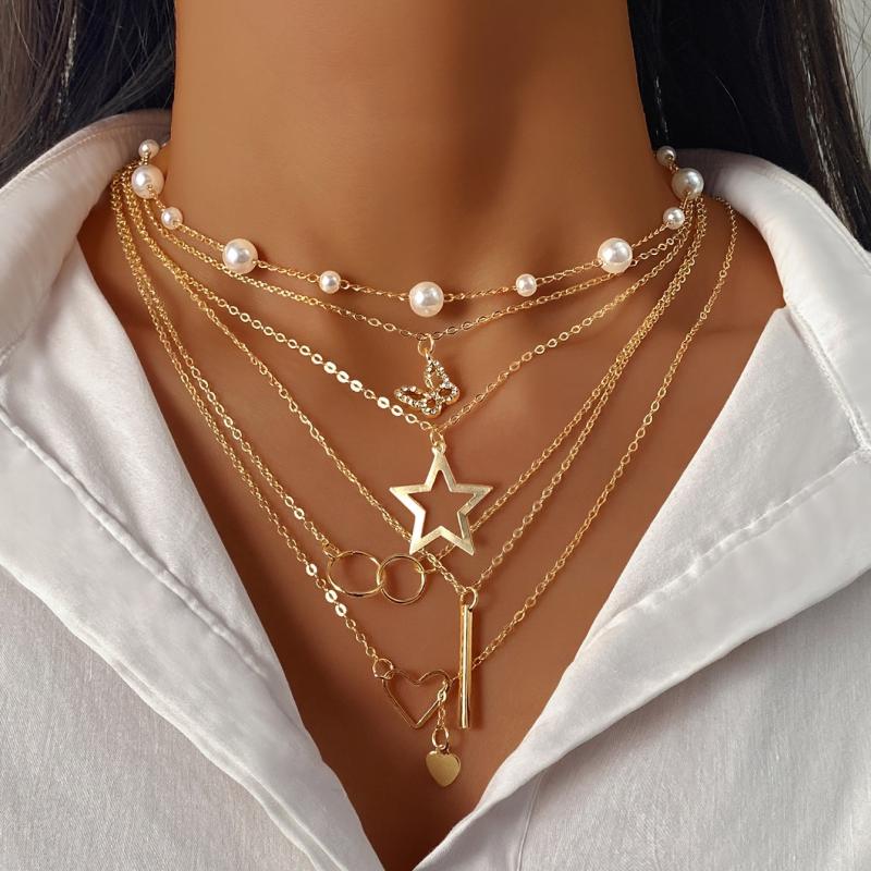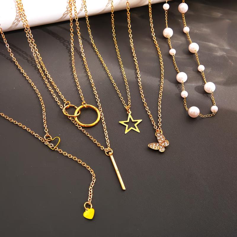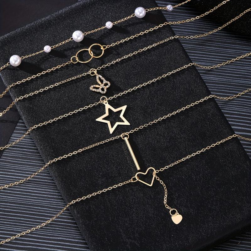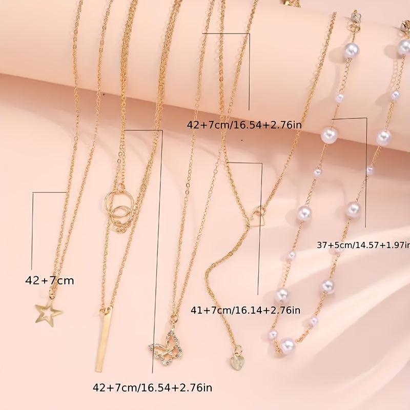 This necklace set features 5pcs of zinc alloy pendants including love, butterfly, star, and faux pearl. Perfect for daily wear or gifting, this versatile jewelry set is ideal for layering.