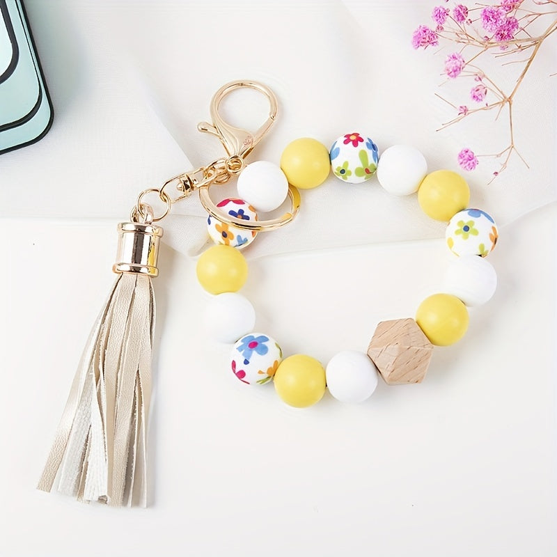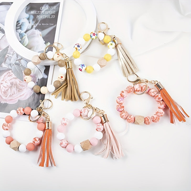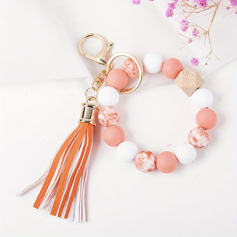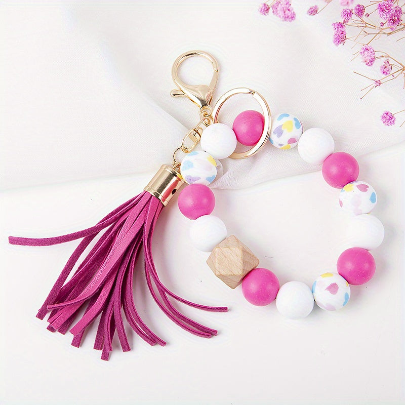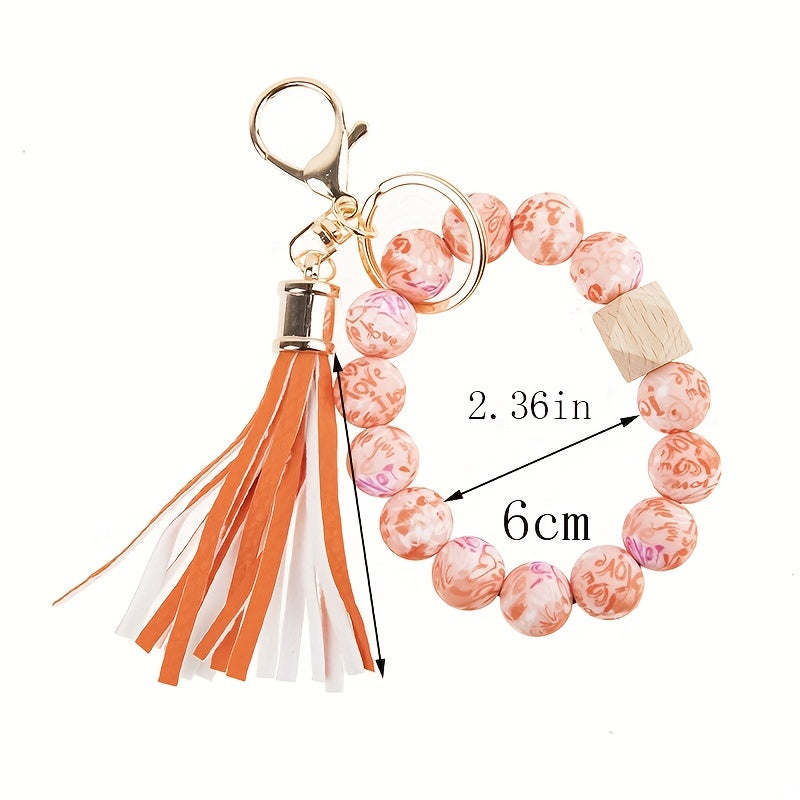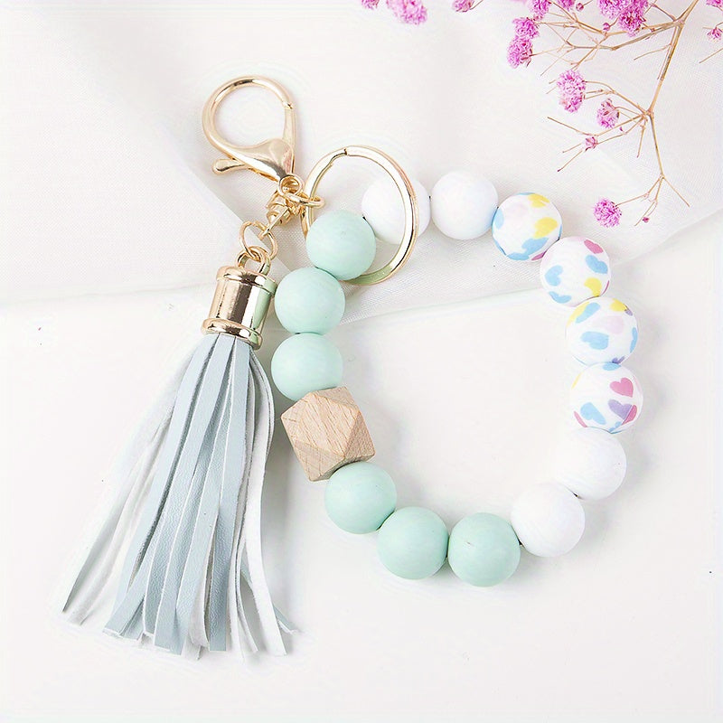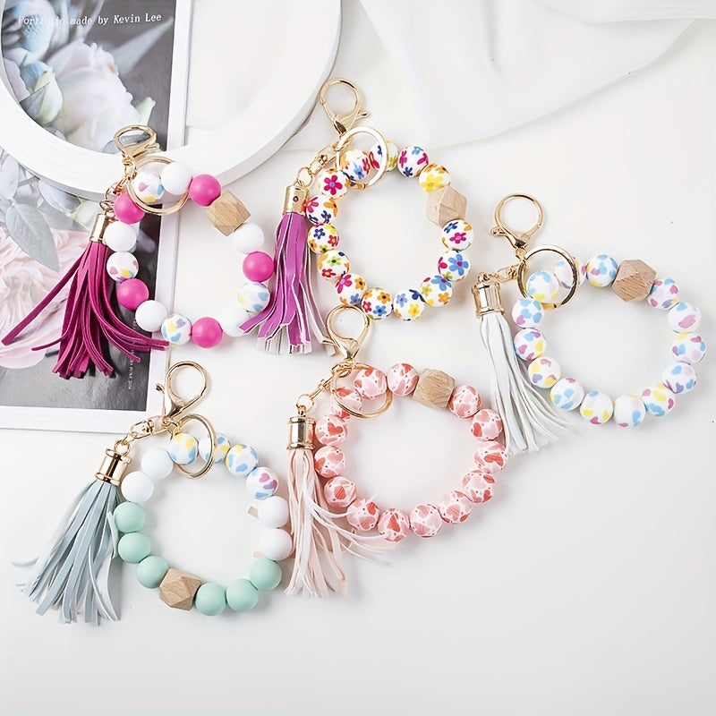 Keep your keys stylishly secure with this silicone beaded bracelet keychain featuring love heart and flower prints. Perfect as a keyring or a fashion accessory.