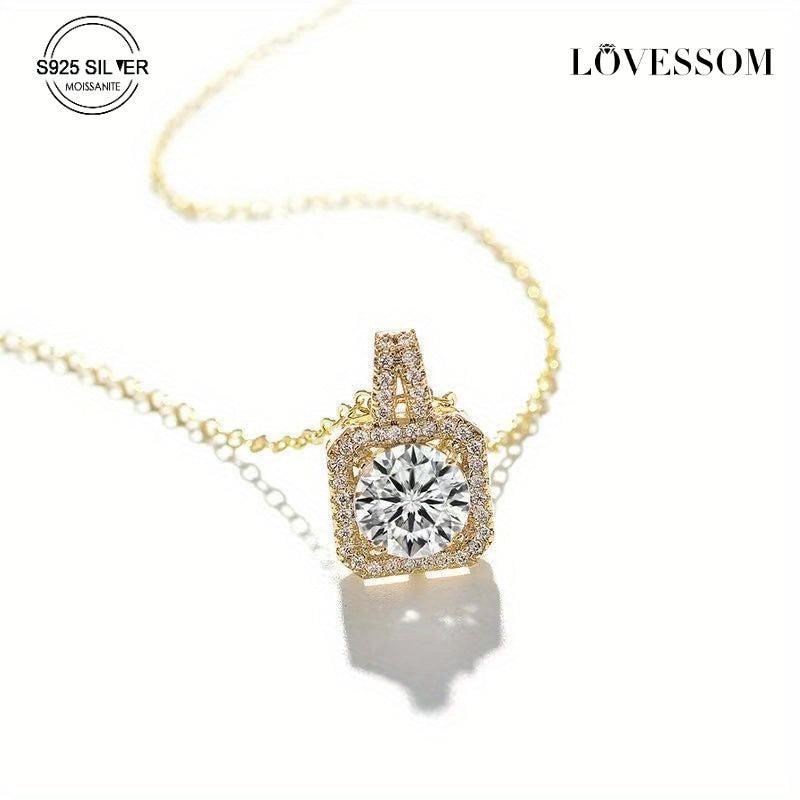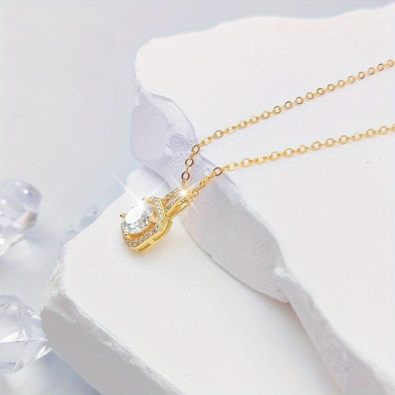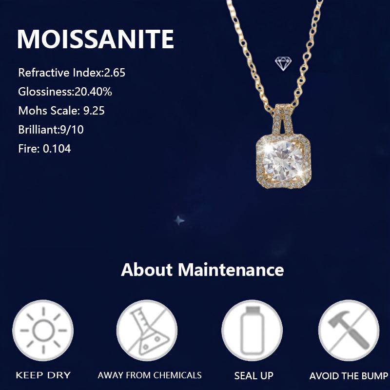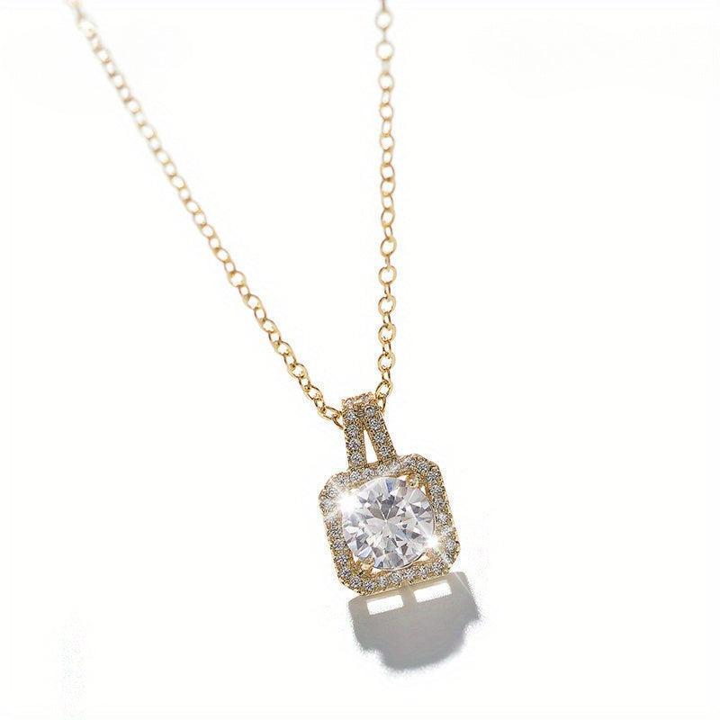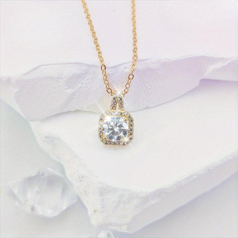 Elegant pendant necklace featuring a shimmering 1ct or 2ct Moissanite stone in an 18K golden plated setting. Perfect accessory for Mardi Gras parties, weddings, or as an all-season gift. Comes in a beautiful box.