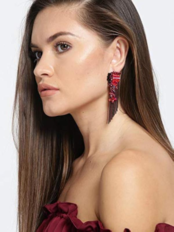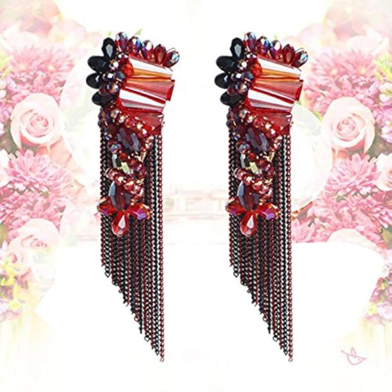 Add a touch of glamour with these chain-drop tassel earrings that feature sparkling colorful accents. Perfect for a stylish and chic look.