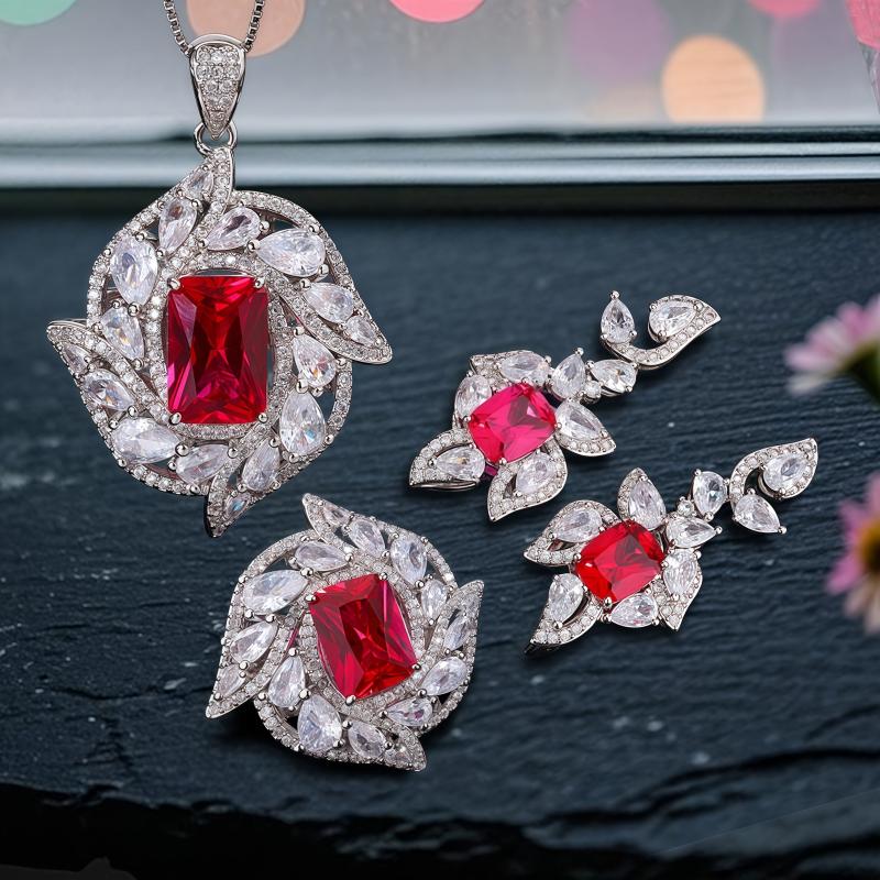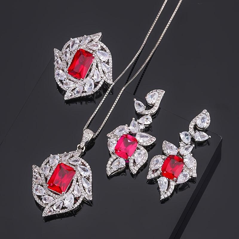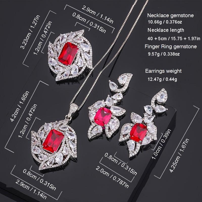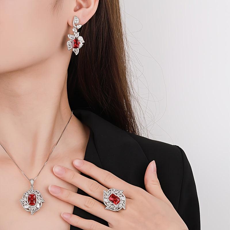 This elegant jewelry set features a necklace, earrings, and an adjustable ring all inlaid with synthetic zirconia and adorned with a maple leaf design. Perfect for everyday wear or as a special gift for weddings or Mother's Day.
