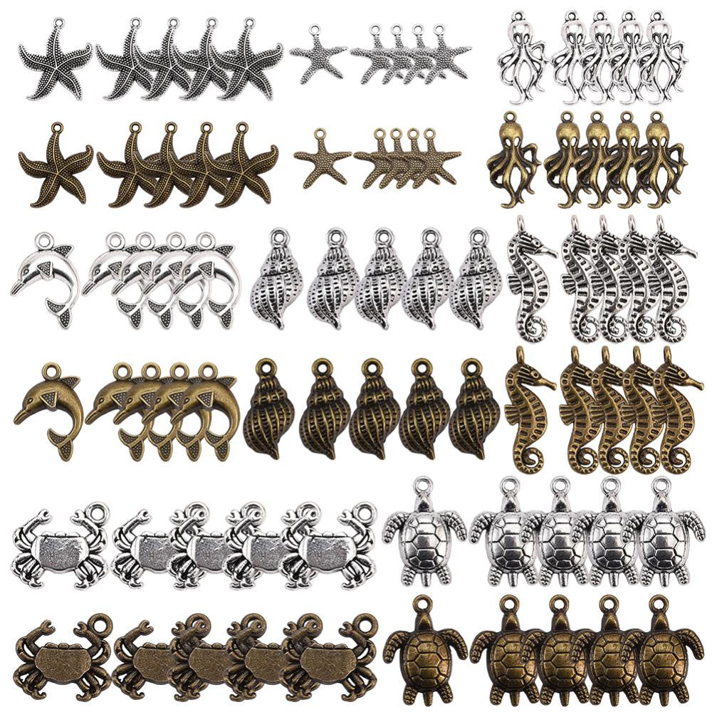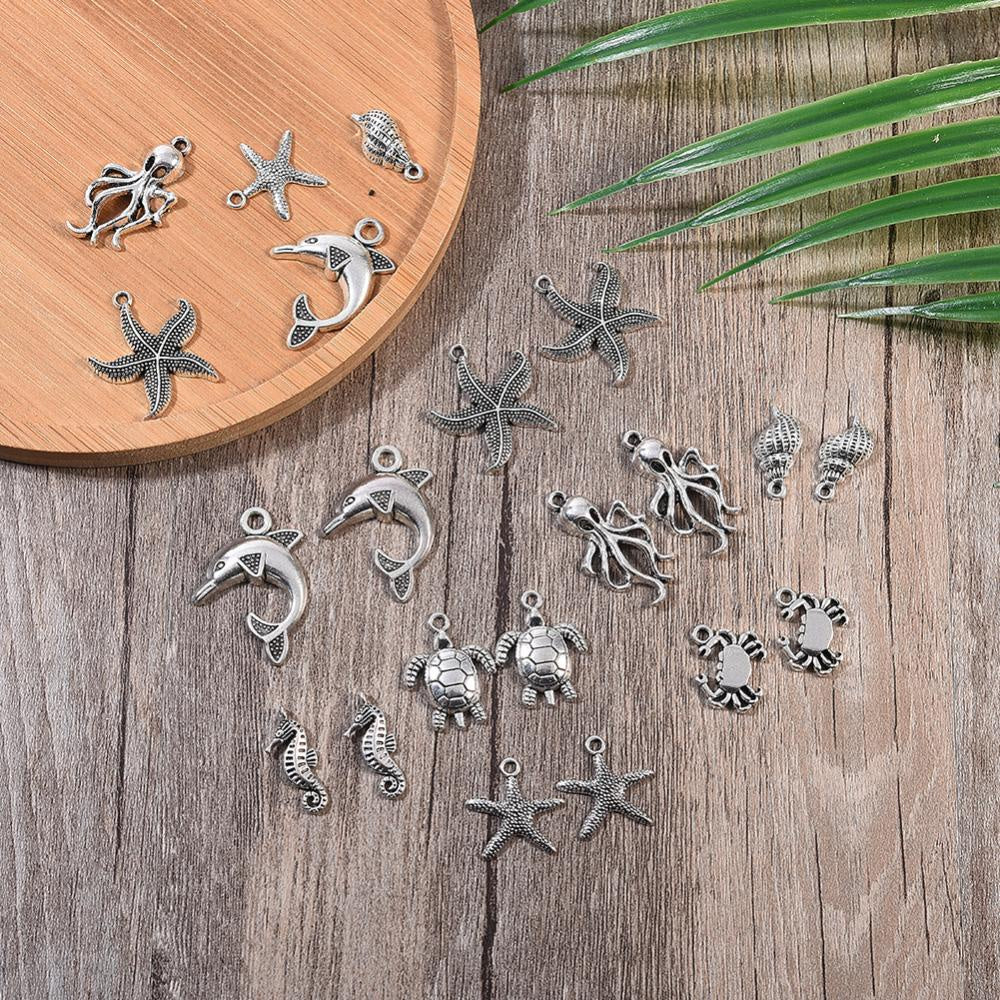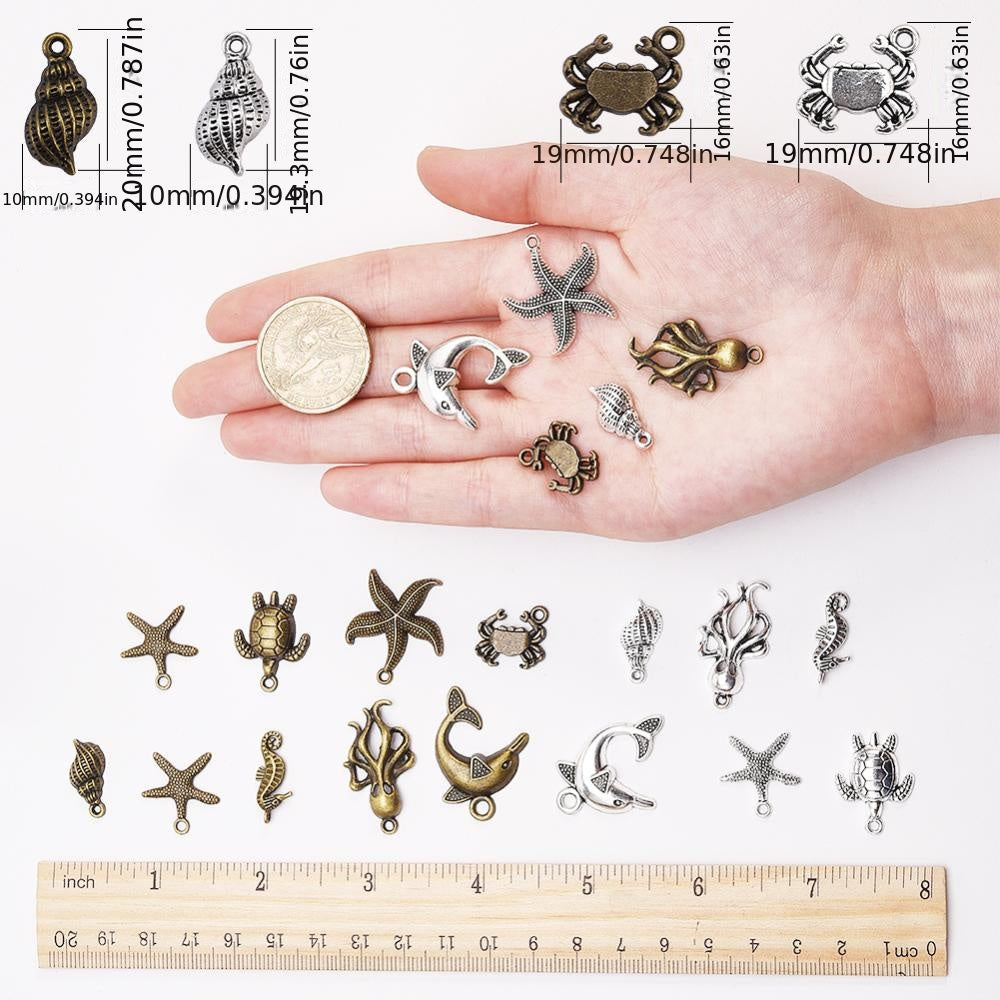 Create stunning DIY jewelry with this set of marine life charms including starfish, sea turtle, conch, octopus, crab, and dolphin pendants. Perfect for ocean-themed designs.