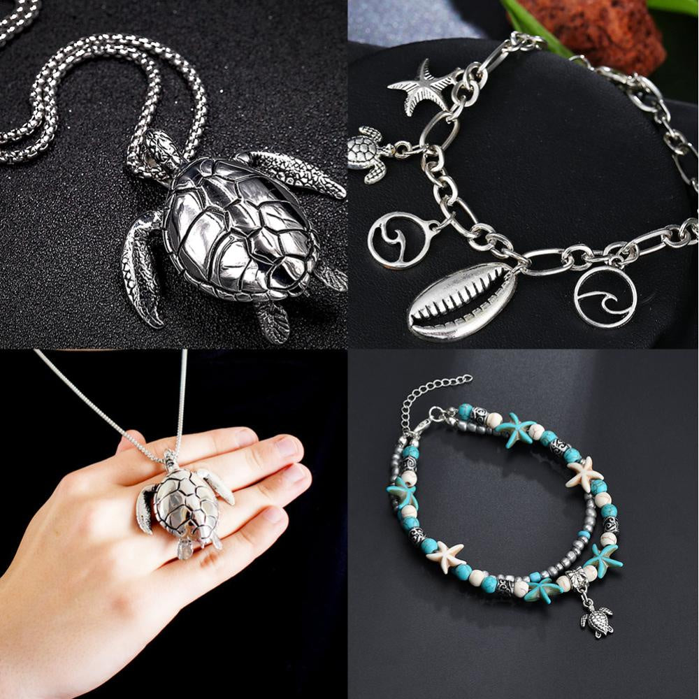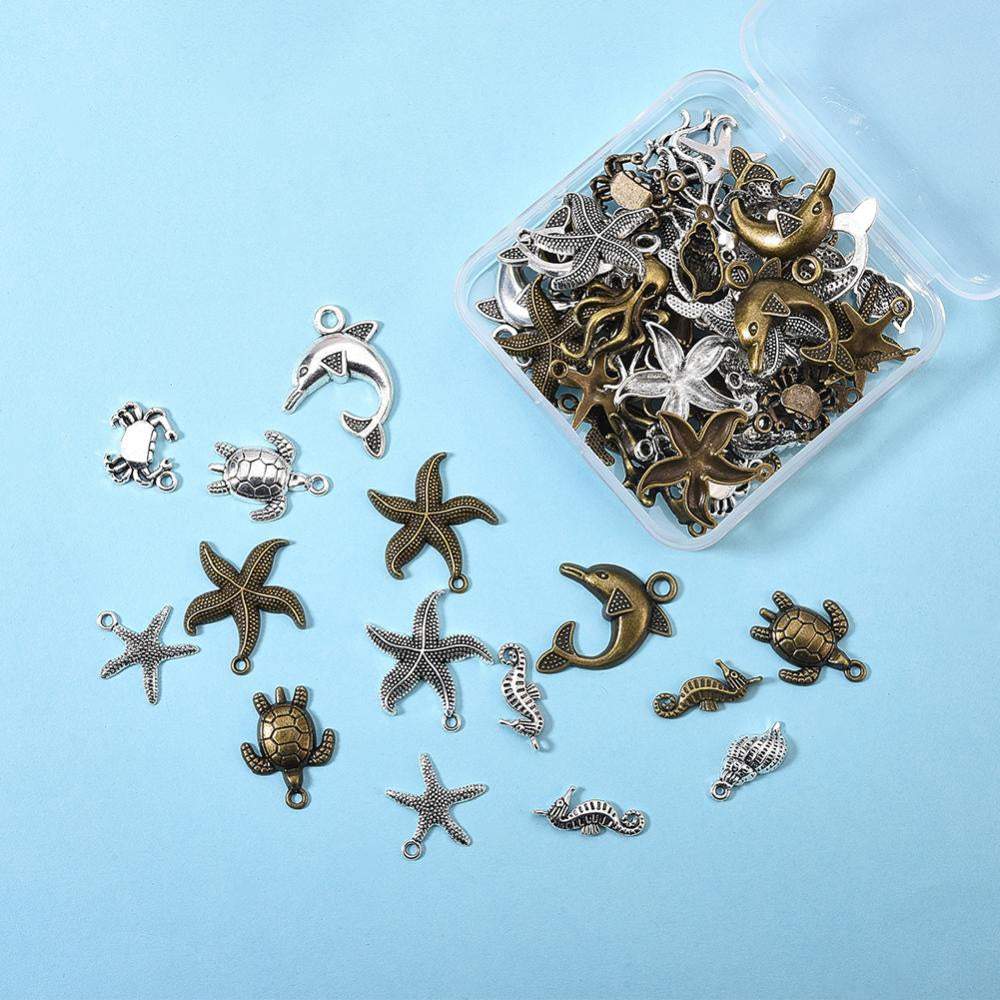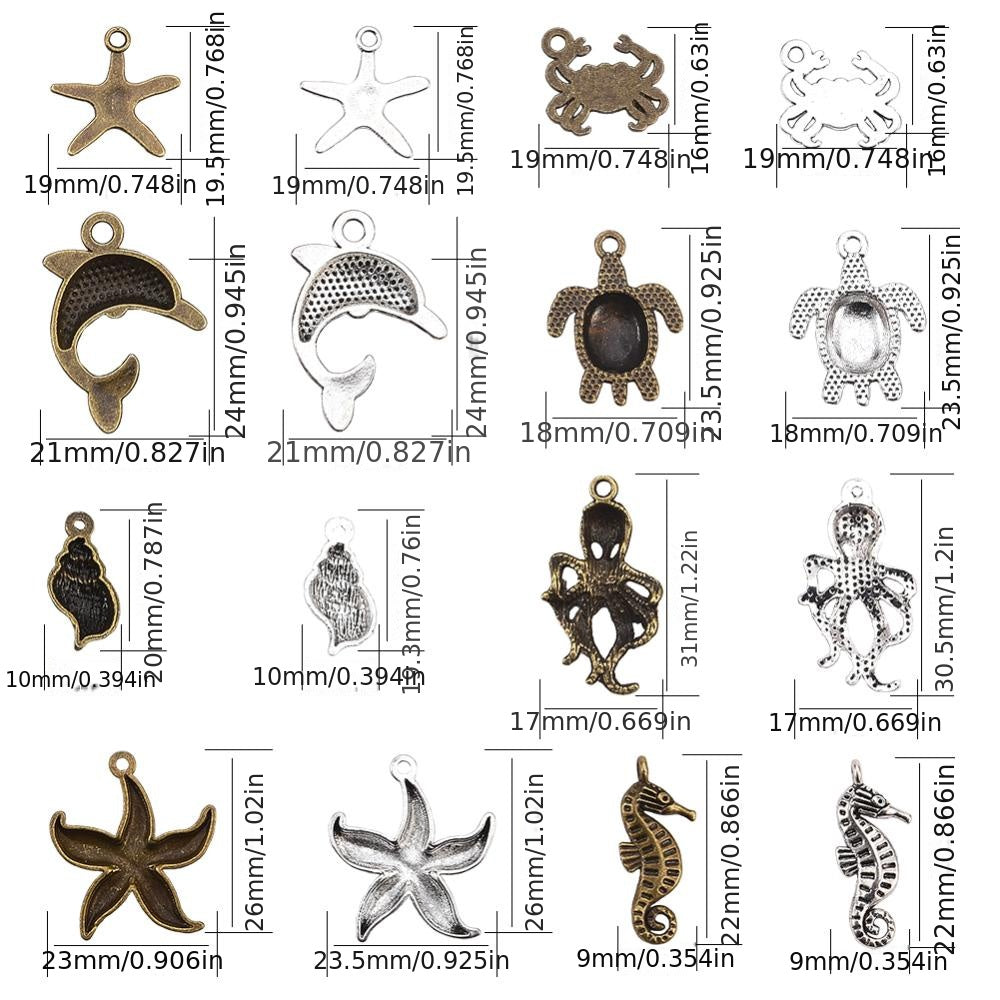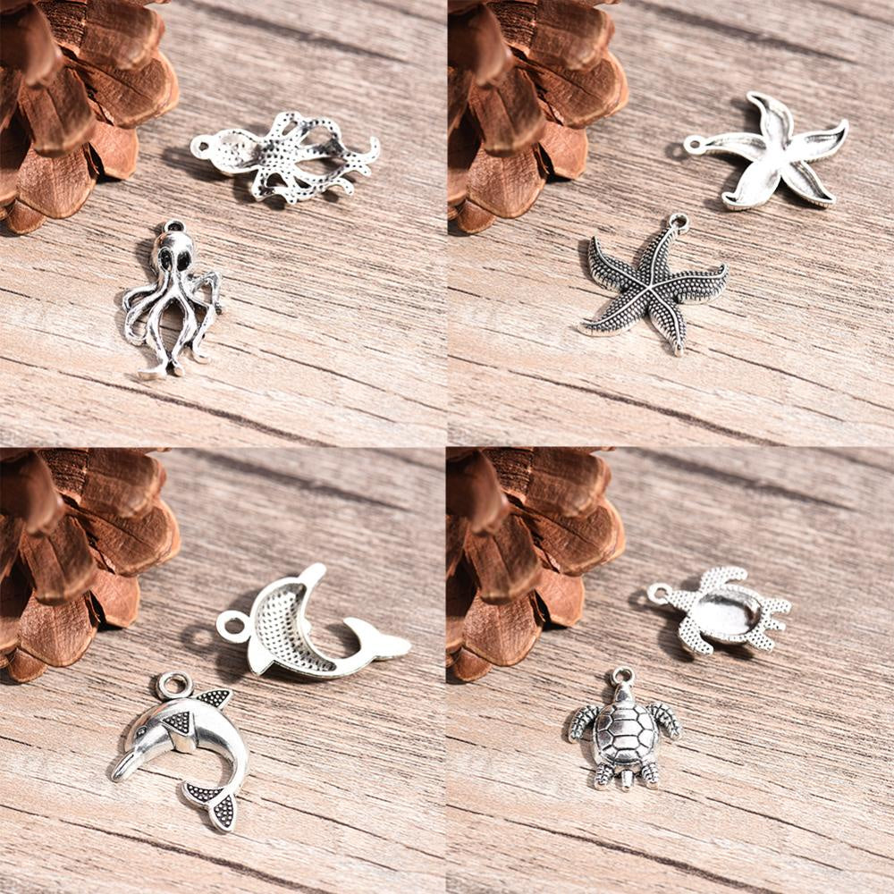 Create stunning DIY jewelry with this set of marine life charms including starfish, sea turtle, conch, octopus, crab, and dolphin pendants. Perfect for ocean-themed designs.
