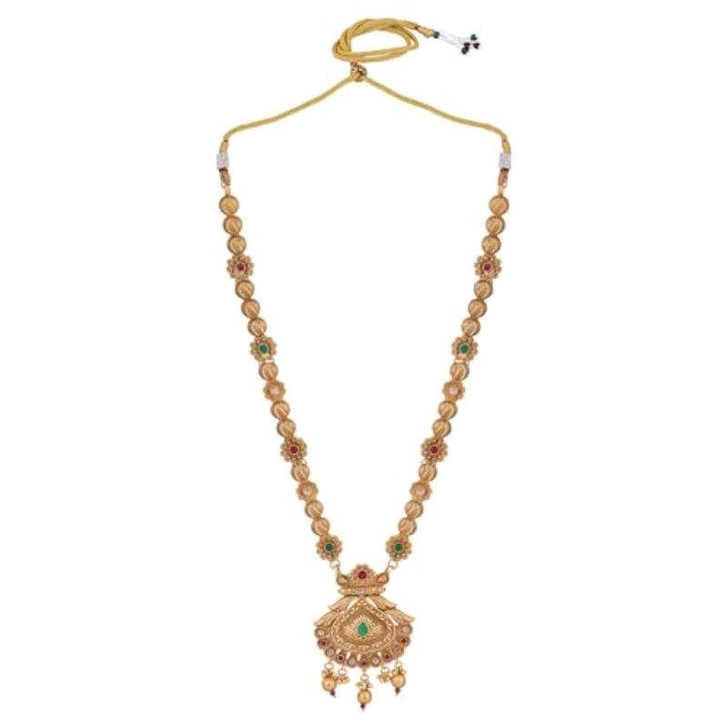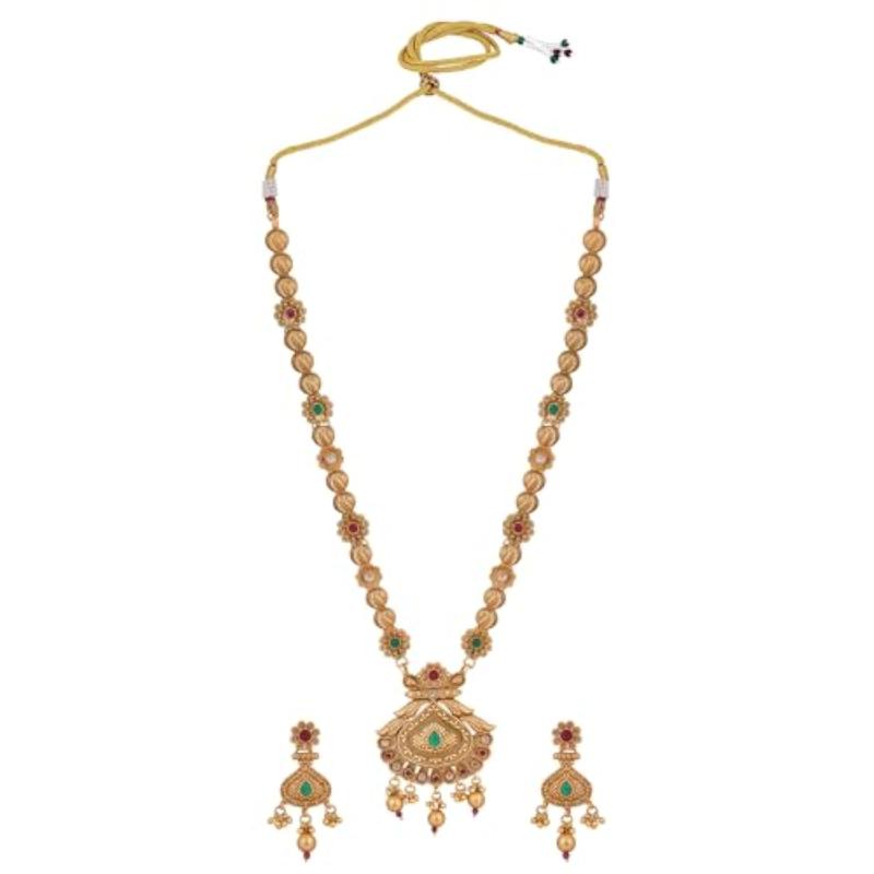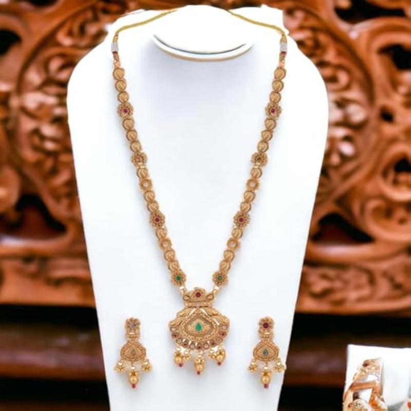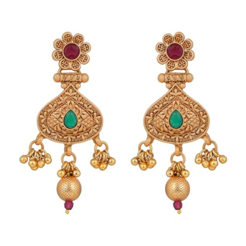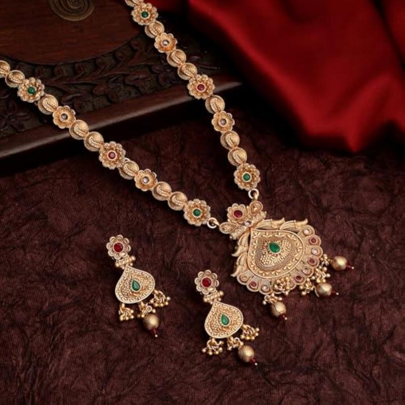 Elegant antique-inspired necklace set with ruby red stones and pearls. Includes dangle earrings for a complete look.