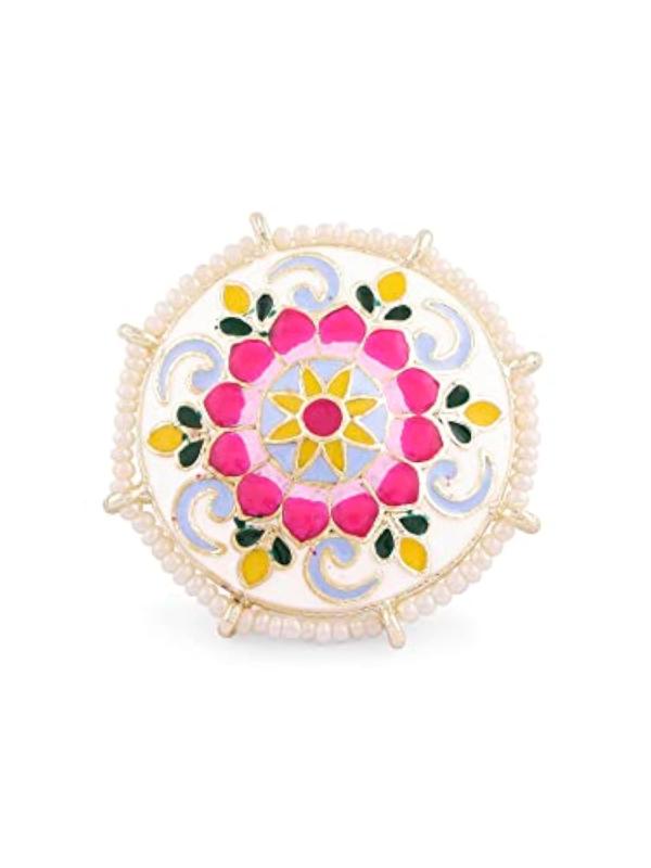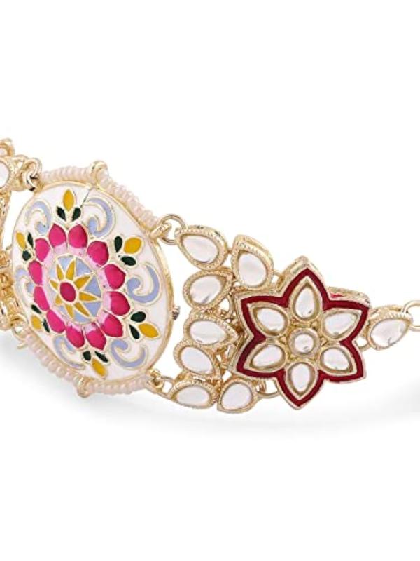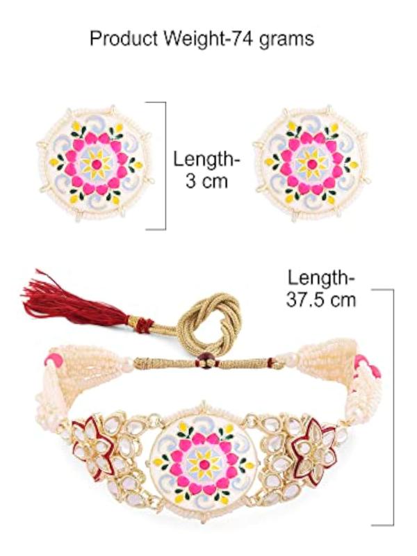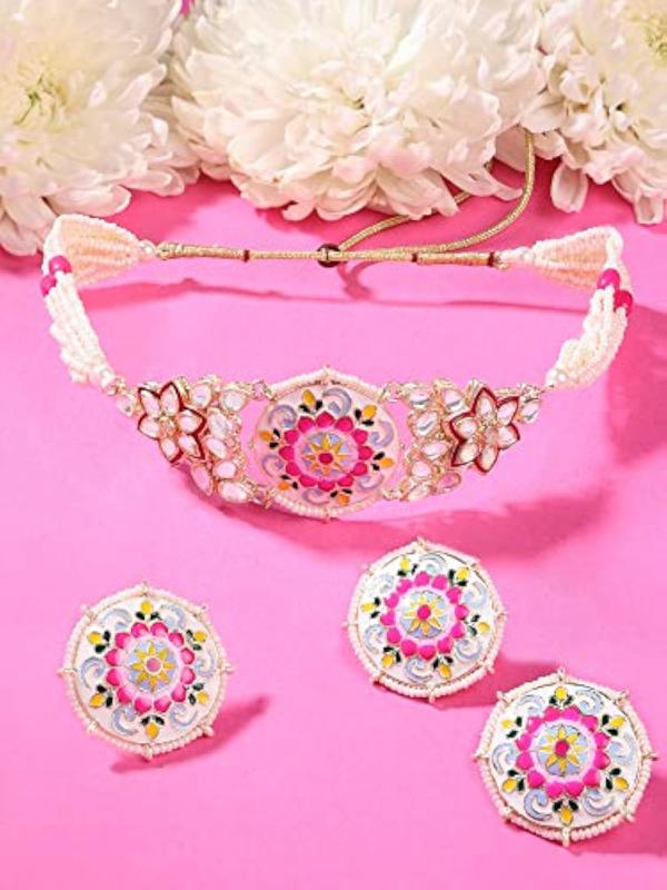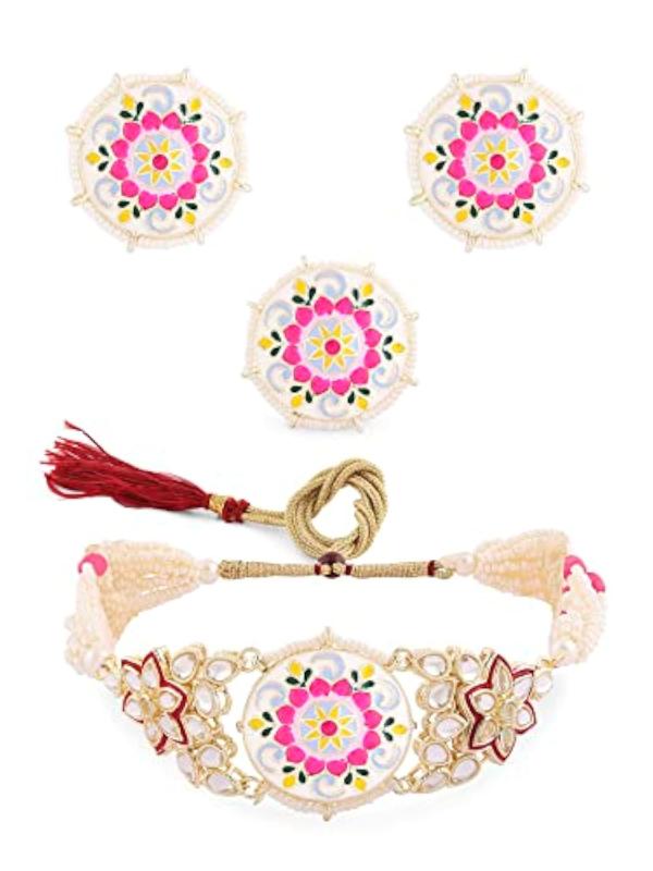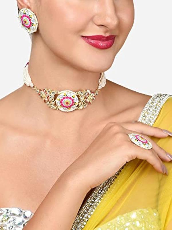 Elegant and vibrant Meenakari strand choker necklace, earring, and ring set perfect for women.