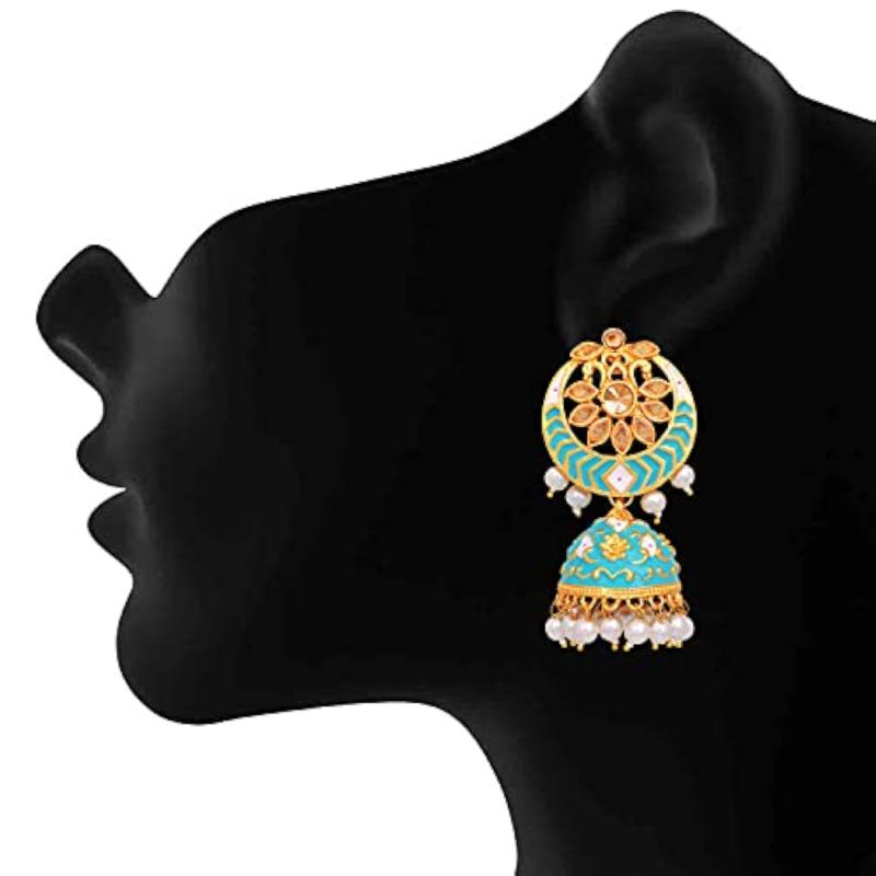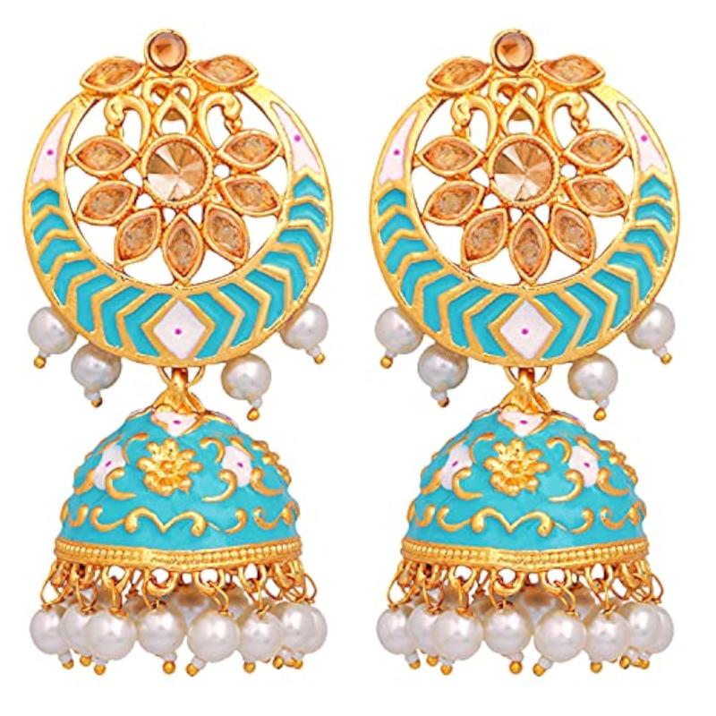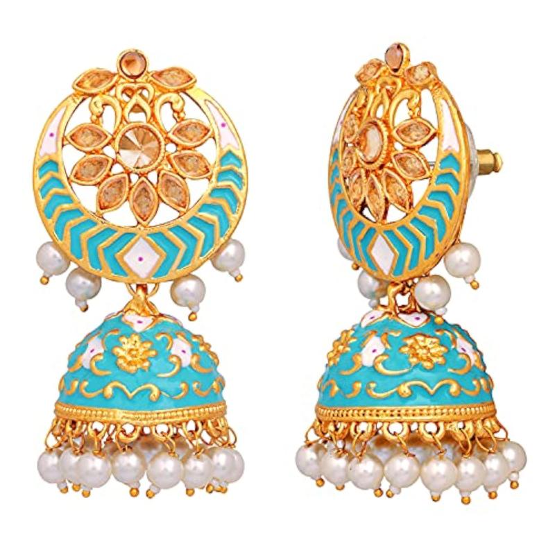 Stunning jhumki earrings featuring meenakari work and artificial pearls. Perfect for adding a touch of elegance to any outfit.