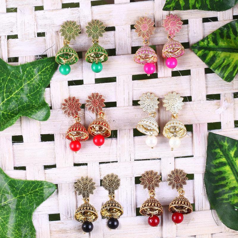 These stunning jhumka earrings are perfect for adding a touch of traditional charm to any outfit. Features red, green, yellow kundans and pearls with a South Indian temple design.