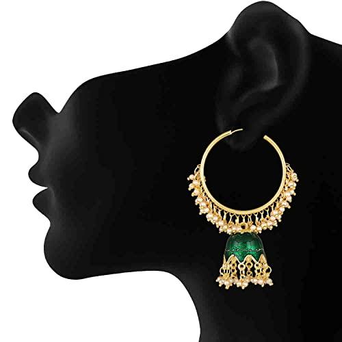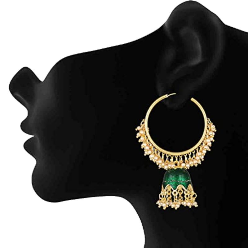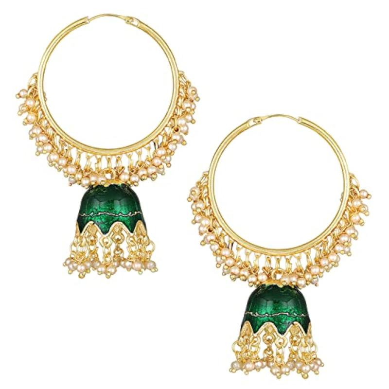 Stunning Meenakari work enamelled jhumki earrings with artificial pearls for a traditional look.