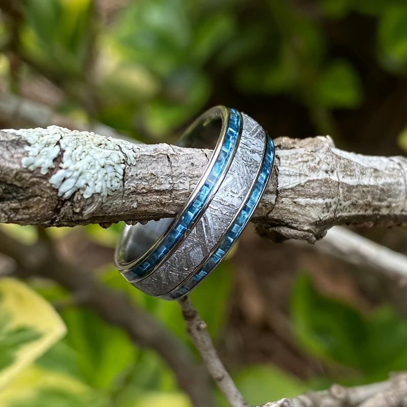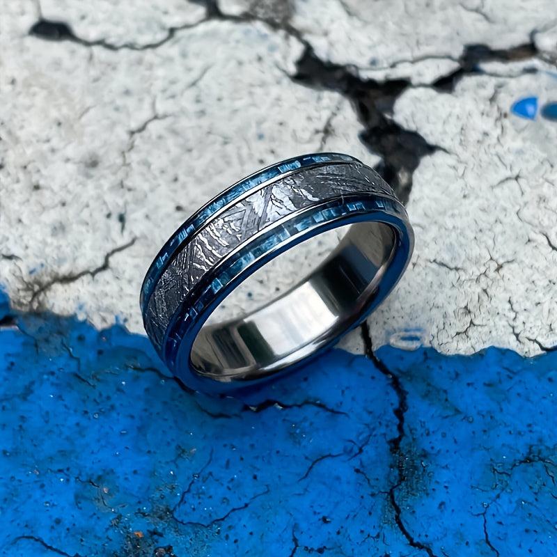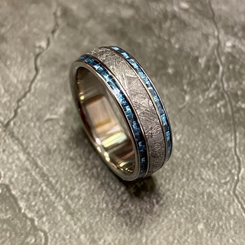 This fashionable men's ring features a dual slot design with a meteorite and carbon fiber inlay, made of high-quality 316L stainless steel. Perfect for wedding, engagement, or as a gift for him on Valentine's Day.