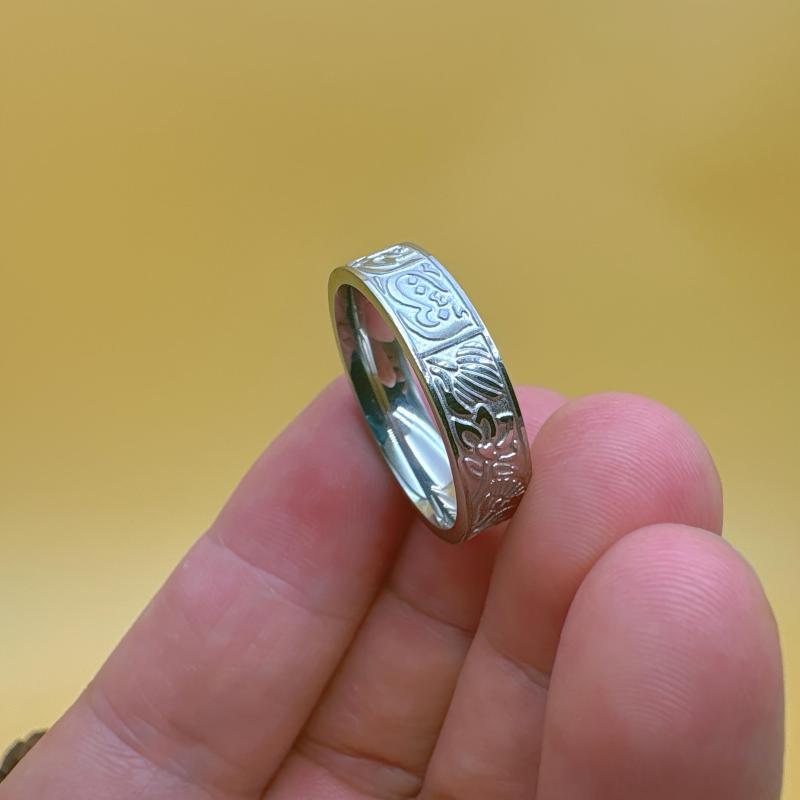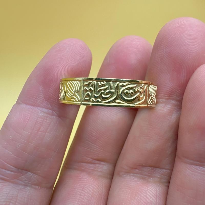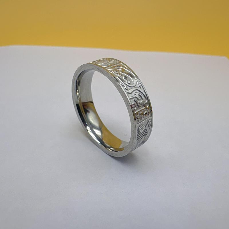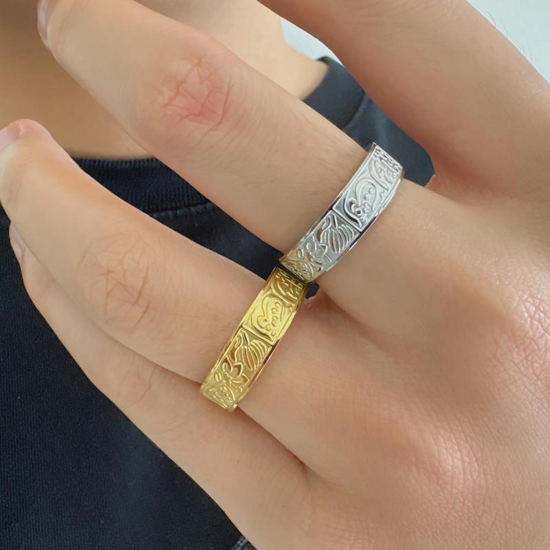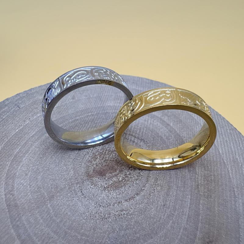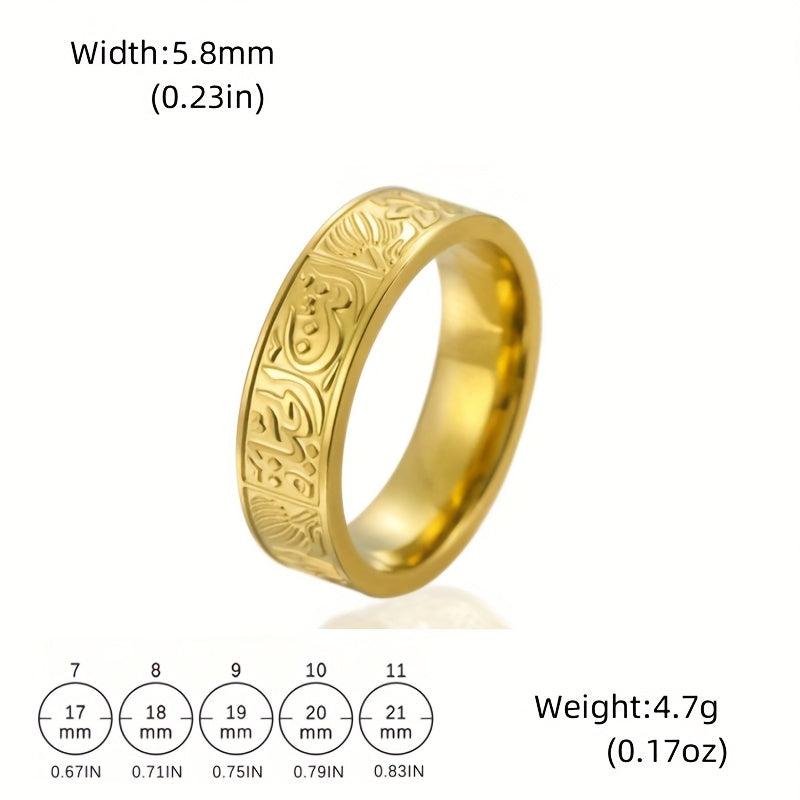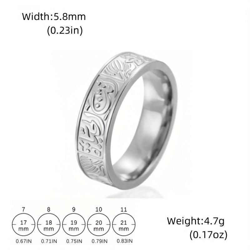 This vintage ring features Arabic calligraphy and lotus pattern engraving. Made of corrosion-resistant stainless steel.