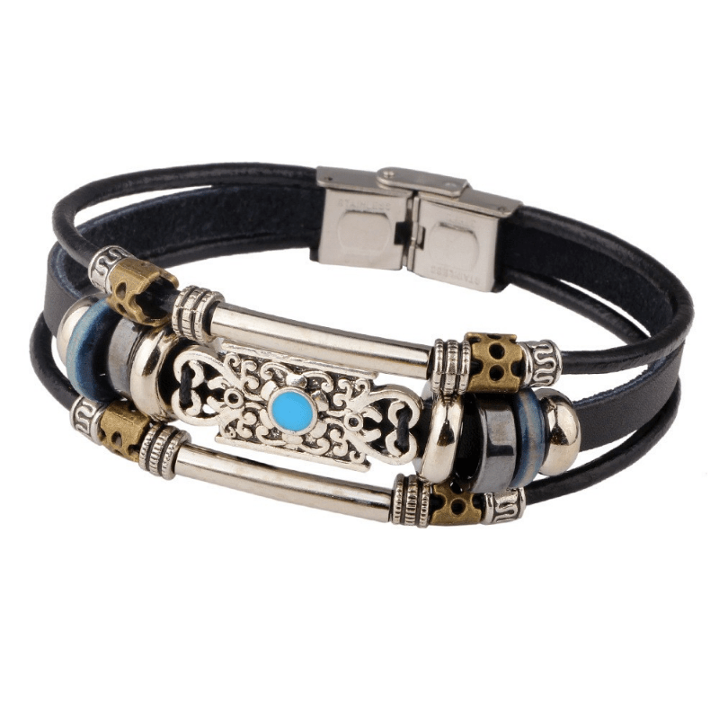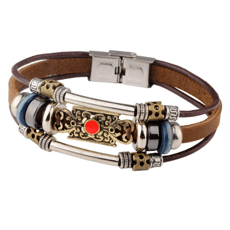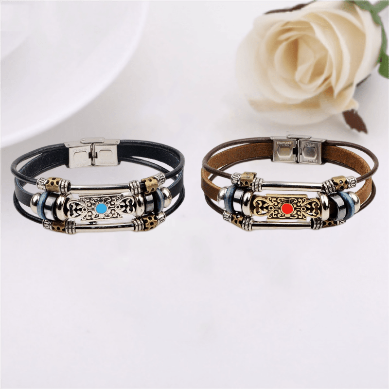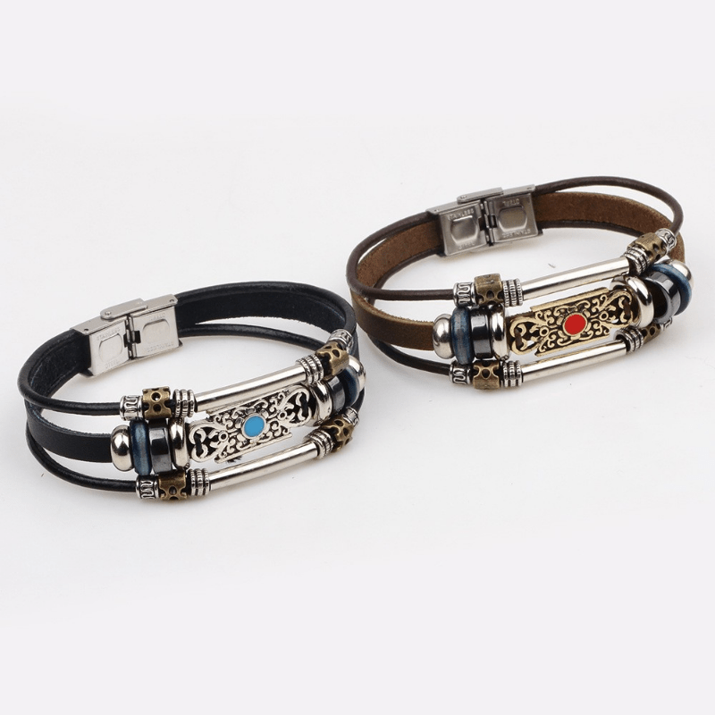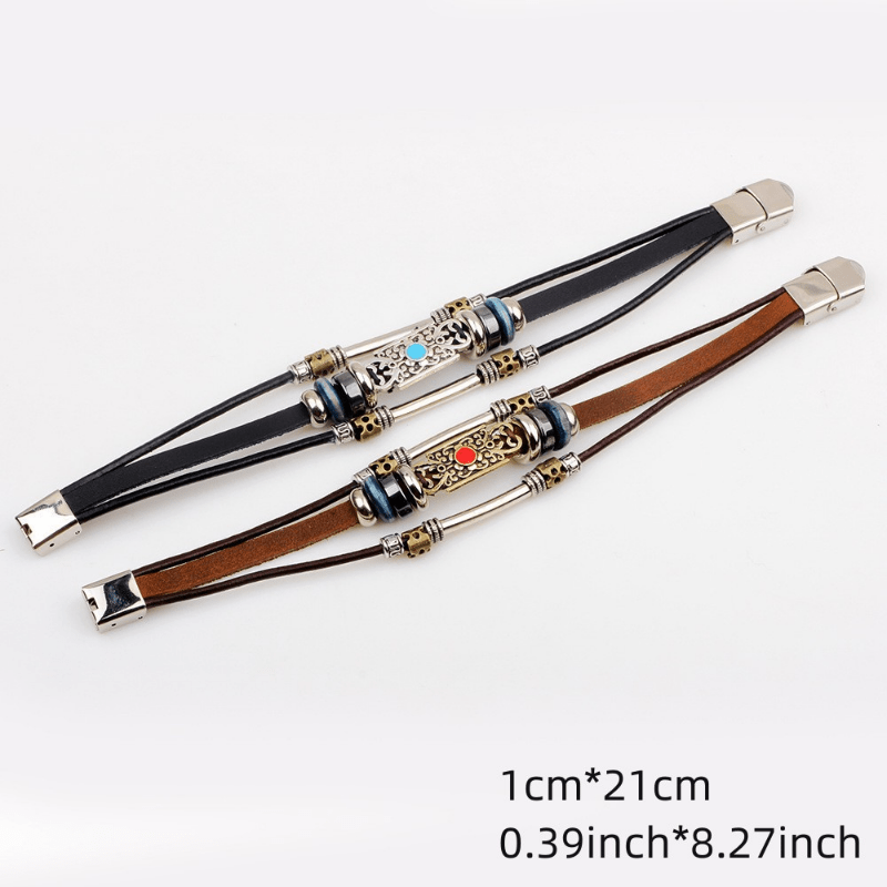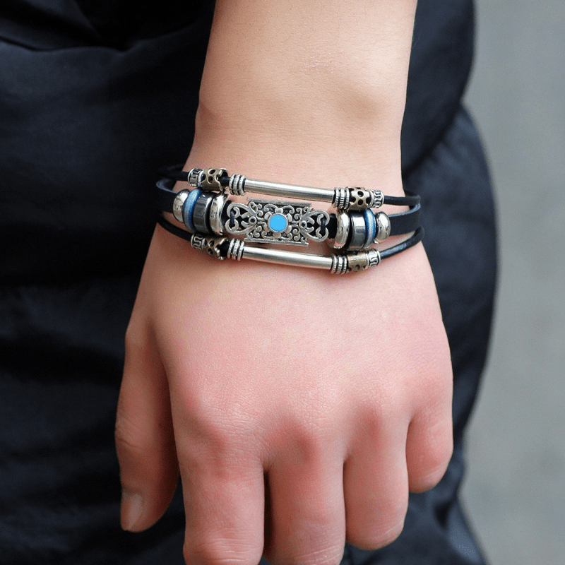 Add a touch of creativity to your style with this retro-inspired men's beaded bracelet featuring multiple layers of leather. Perfect for a casual yet stylish look.