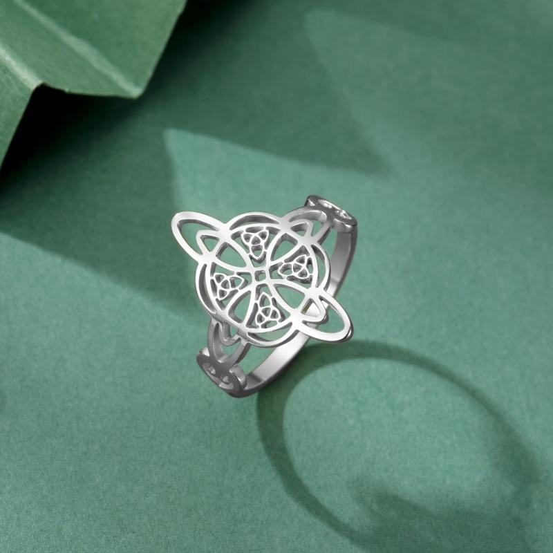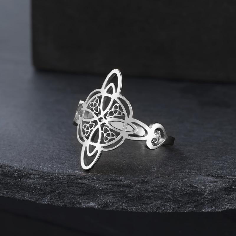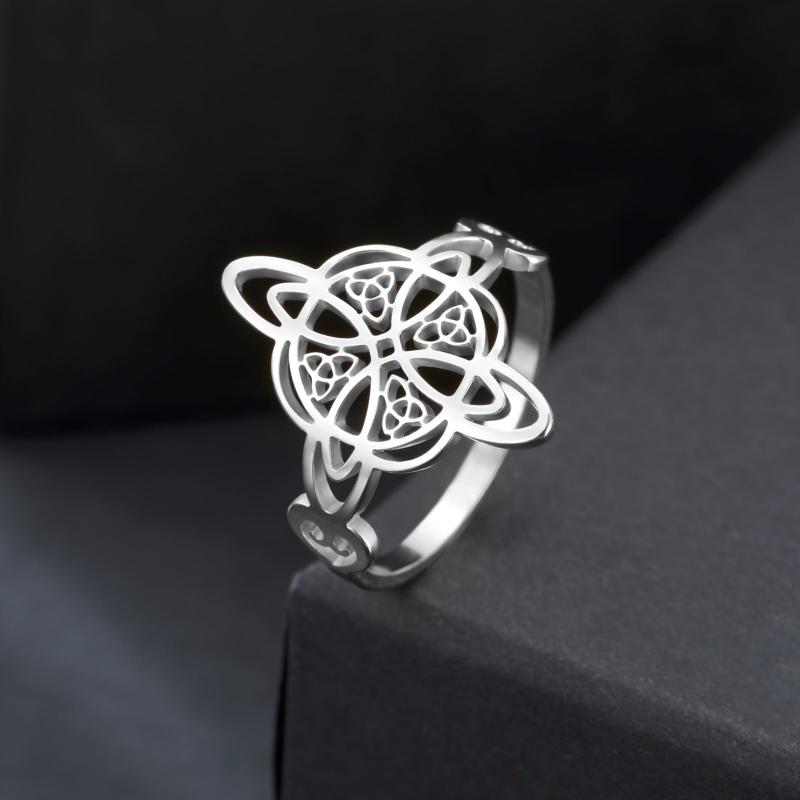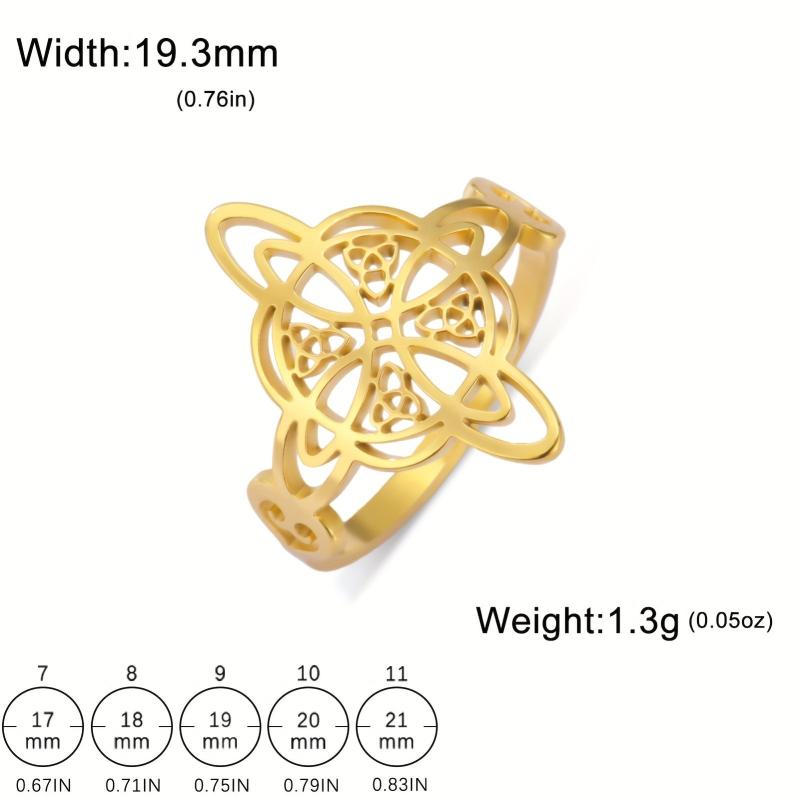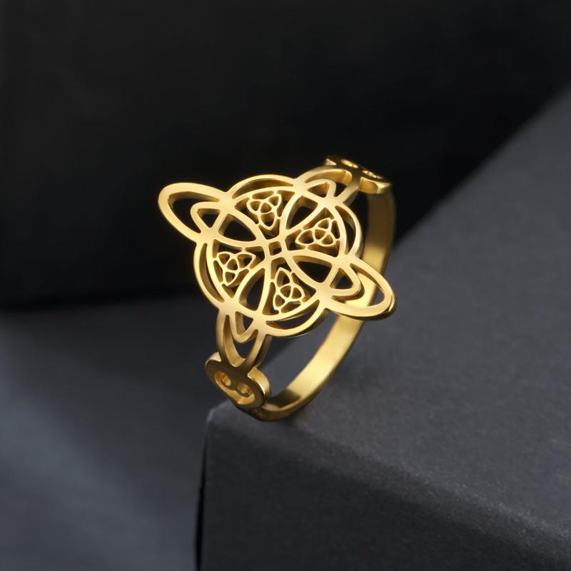 This vintage Celtic knot ring is made of high-quality stainless steel with an 18K gold plating. It is a unisex piece suitable for weddings, engagements, and as a birthday gift with Wiccan knot inspiration.