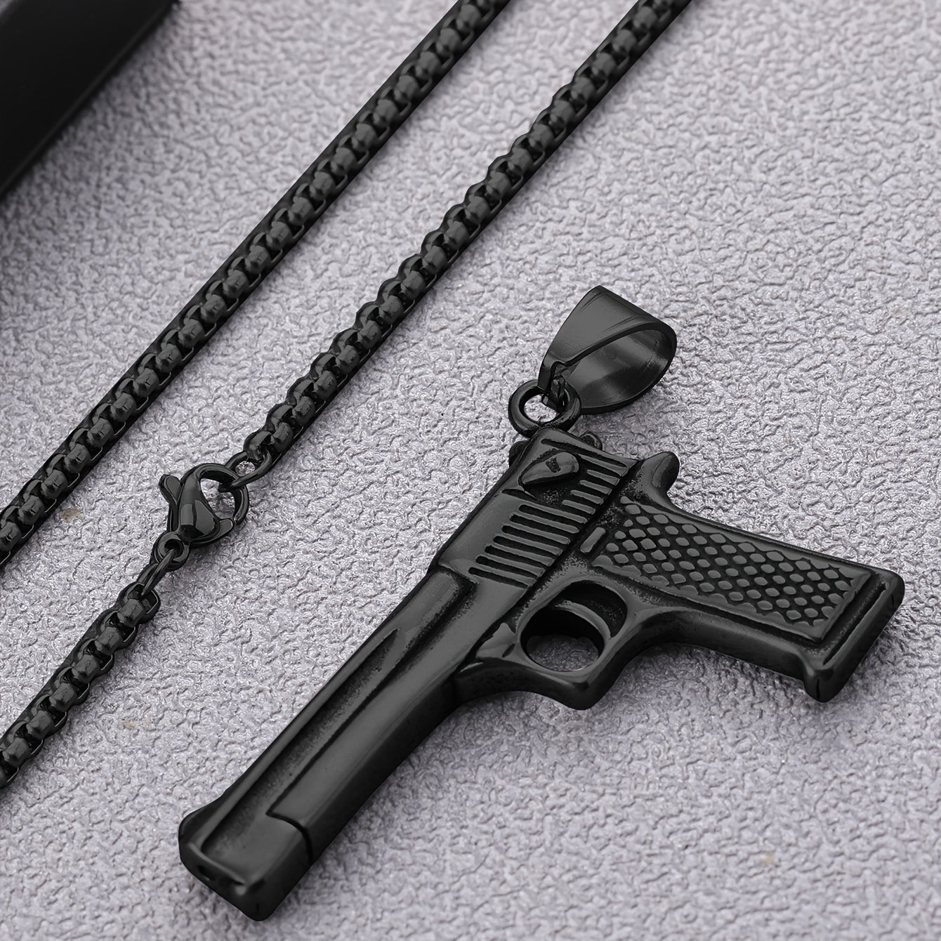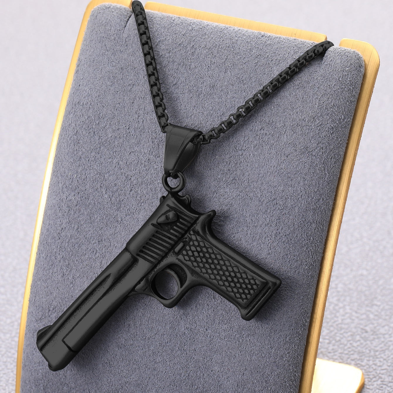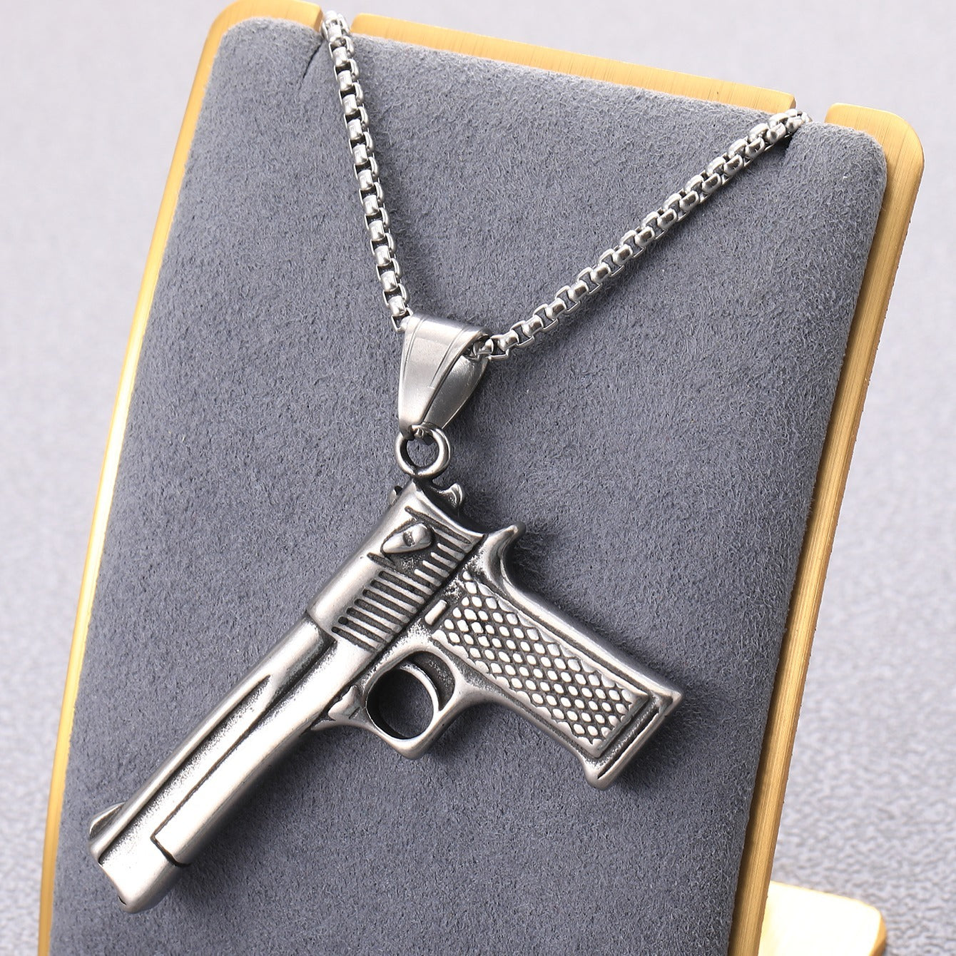 Make a bold statement with this punk style gun charm pendant necklace. Crafted from stainless steel, this necklace is perfect for adding a touch of edgy style to any outfit.