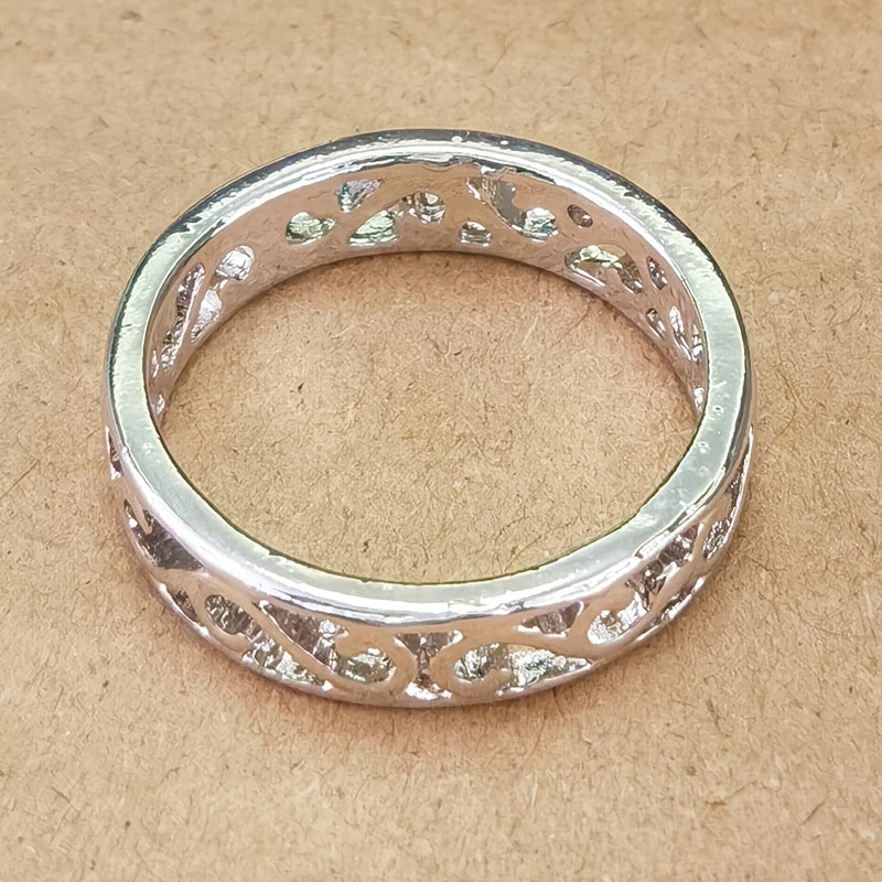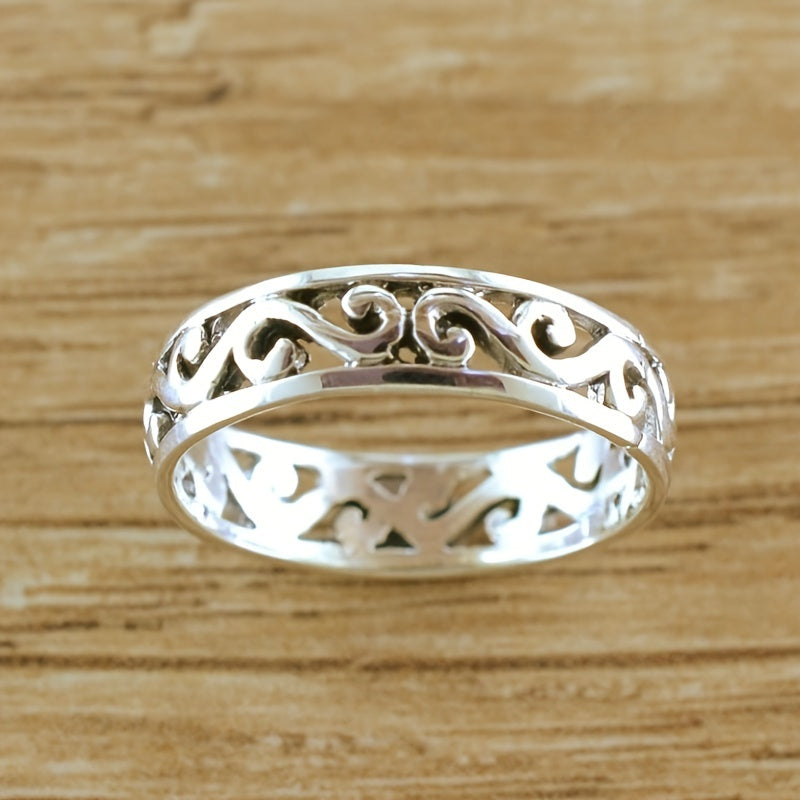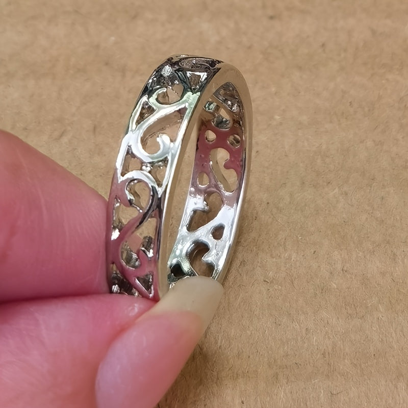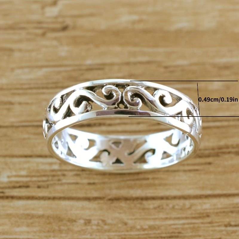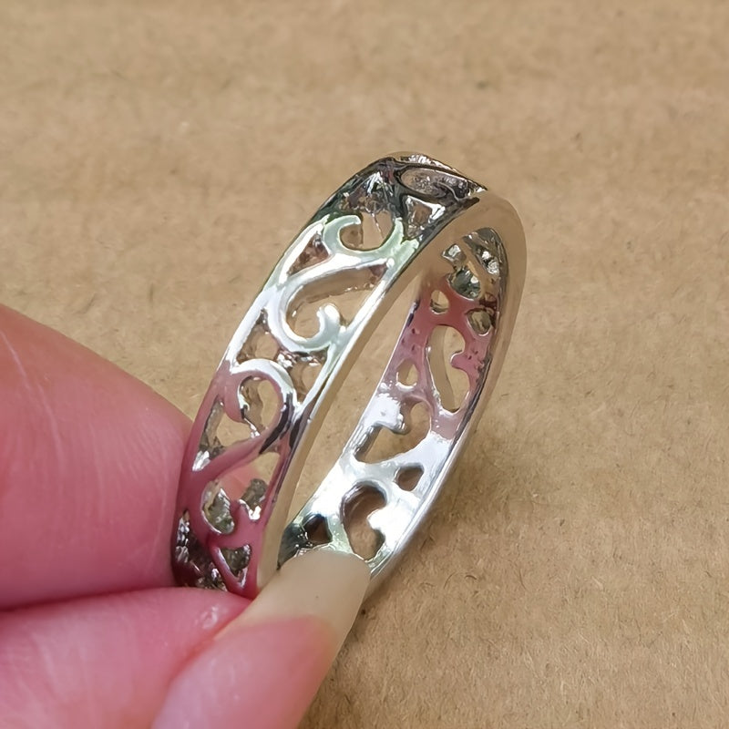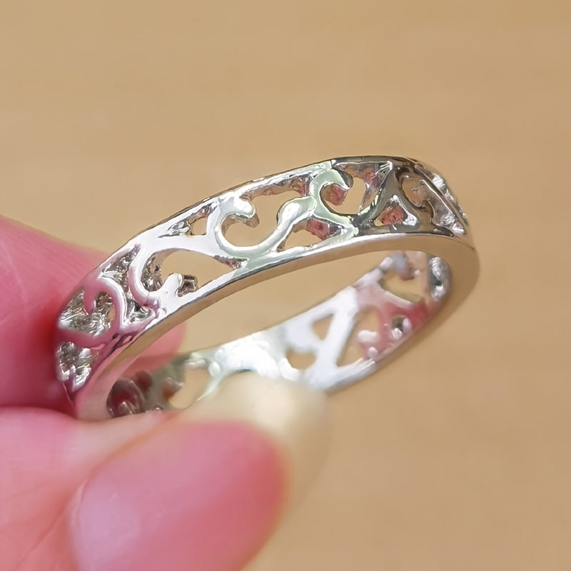 This stylish silver ring features a unique hollow design with a geometric pattern for a modern and casual look.