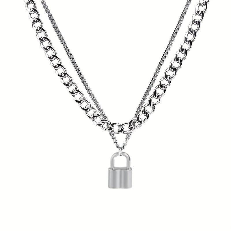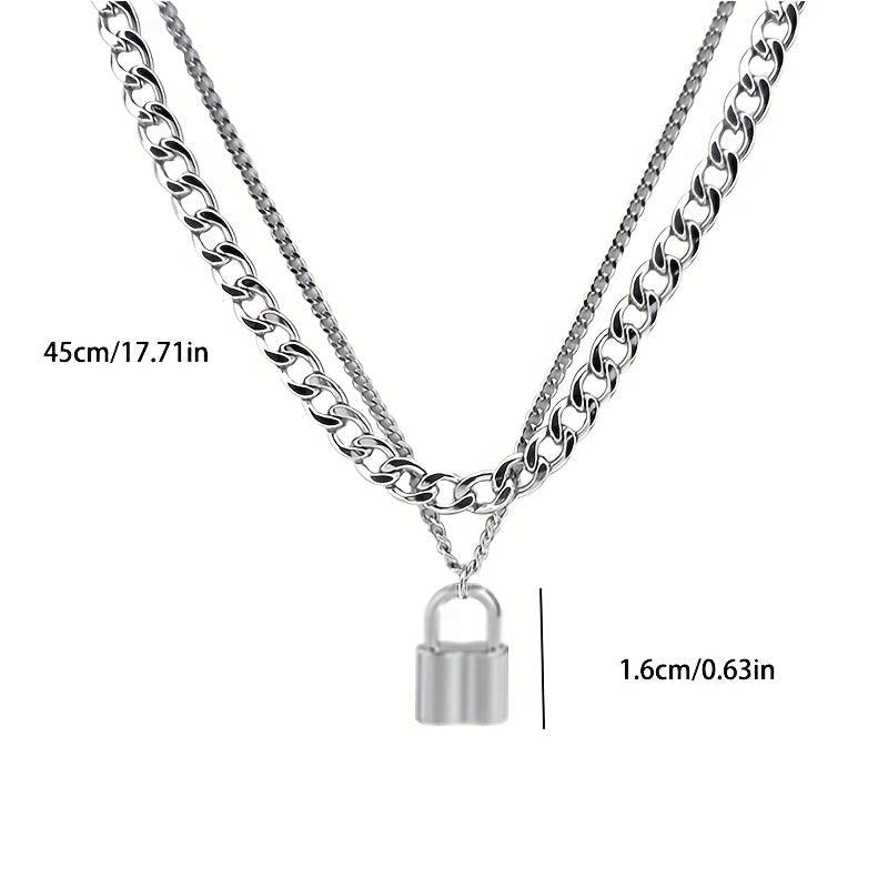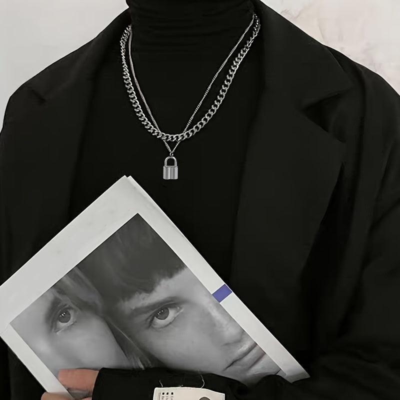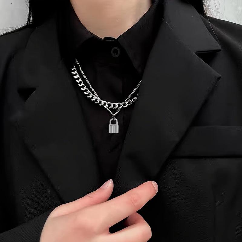 Stylish blazer & shirt combo with double layer lock necklace. Durable iron chain featuring zinc alloy pendant. Suitable for casual or formal occasions.