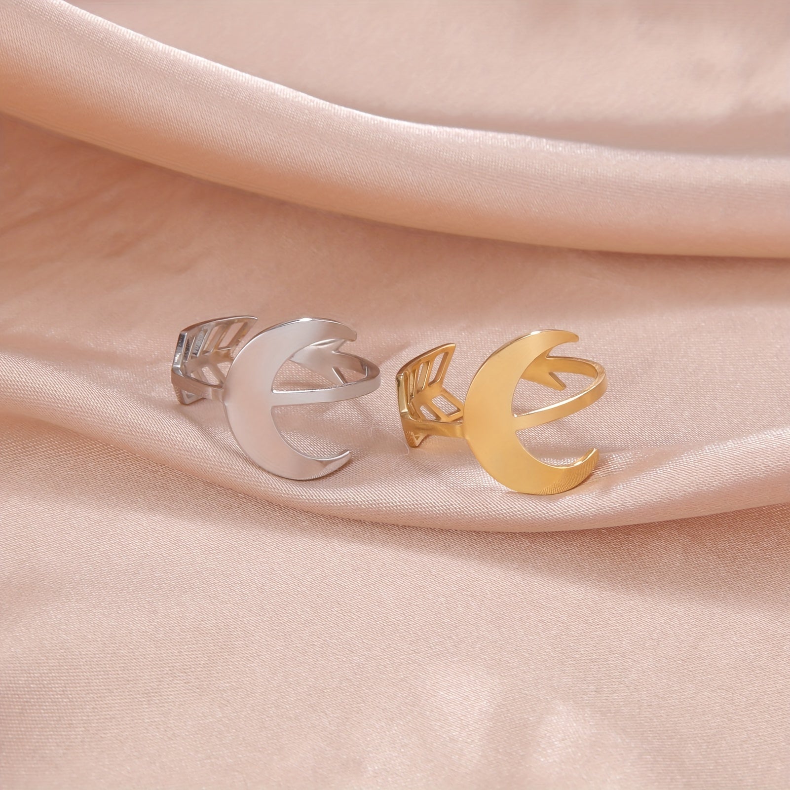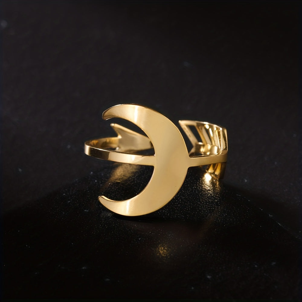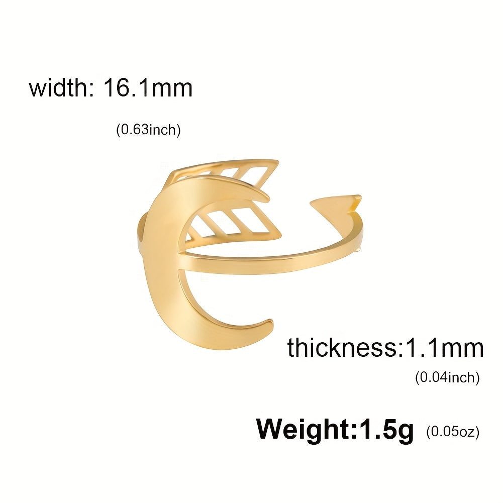 This stylish stainless steel ring features a moon and arrow design. It is adjustable to fit most sizes, making it a versatile piece of jewelry for any occasion.