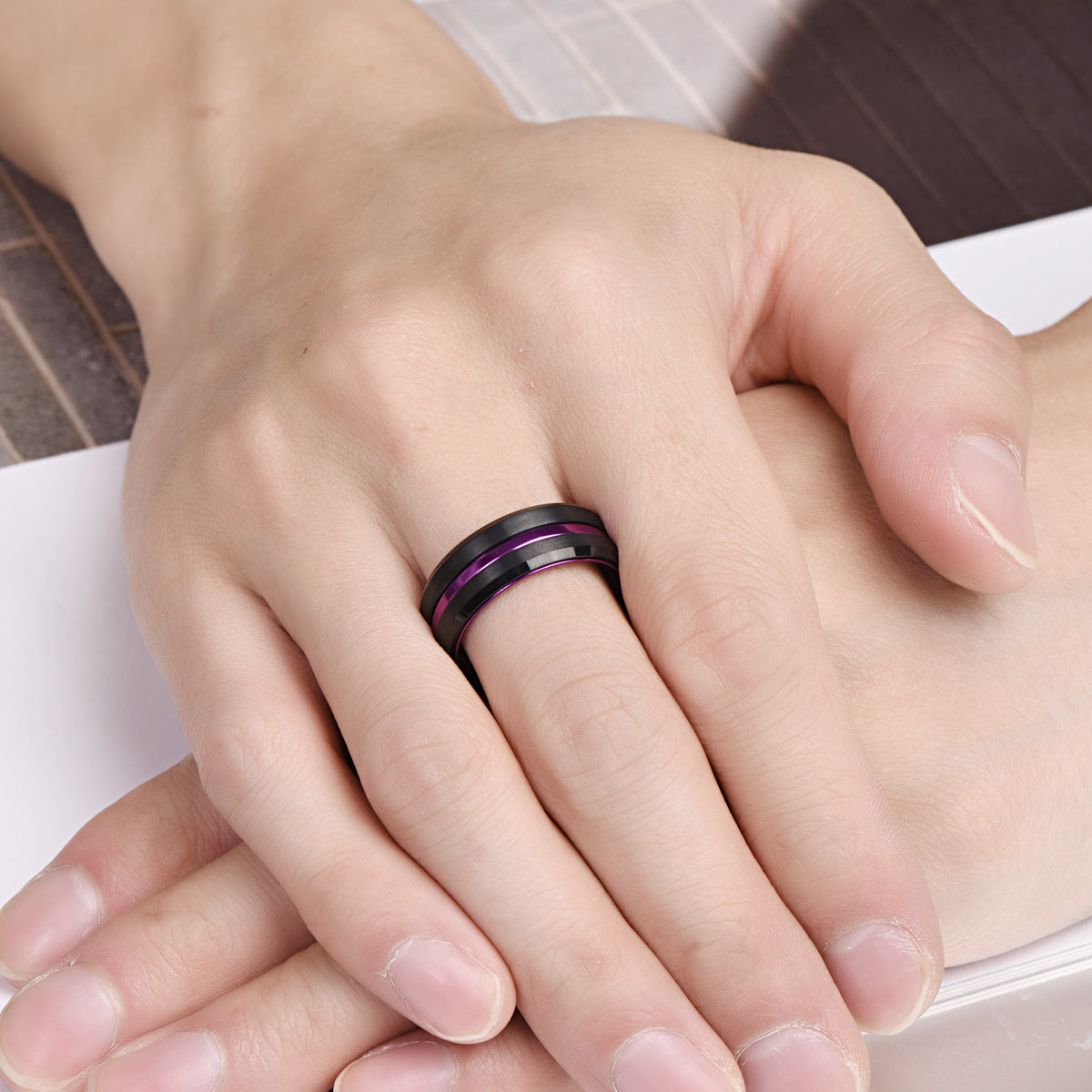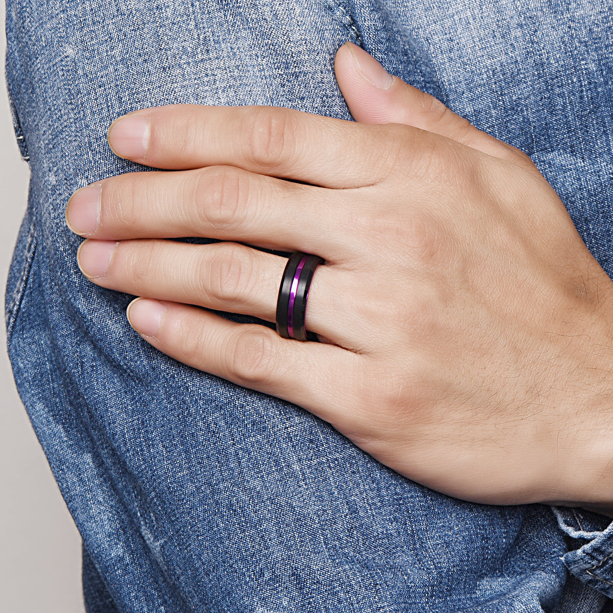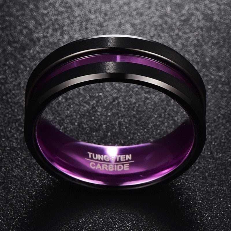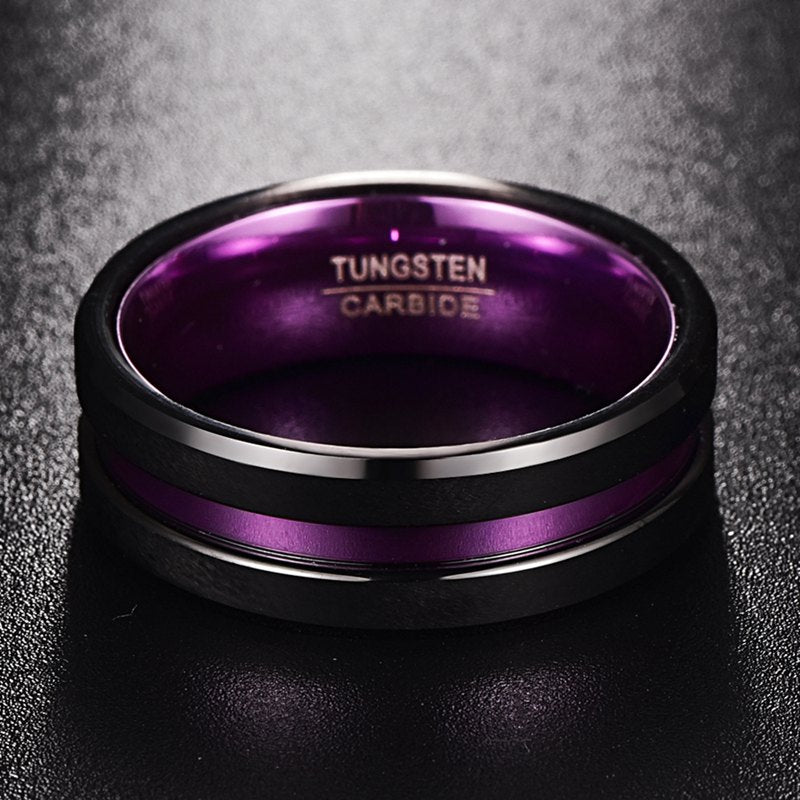 This men's tungsten ring features a flat design with a single groove and a purple inner circle. It is a stylish and modern accessory for everyday wear.