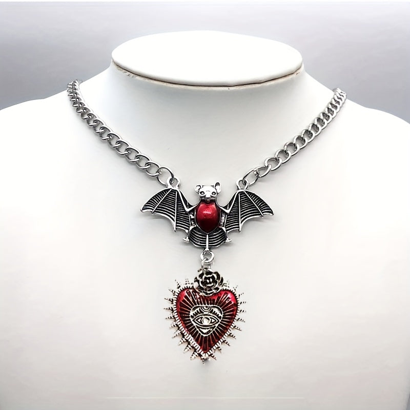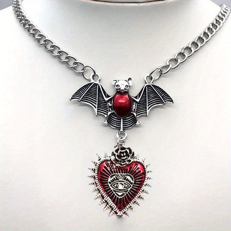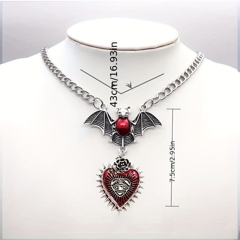 This masculine heart pendant necklace features a gothic design with a red bat and devil eye. It's a stylish party jewelry gift suitable for men, women, or friends.
