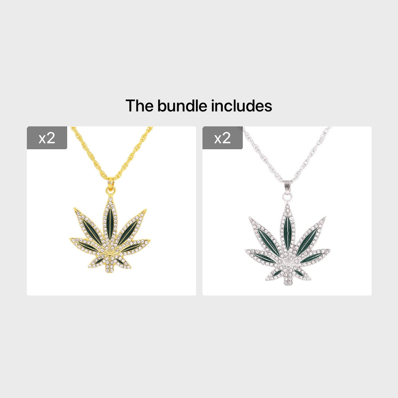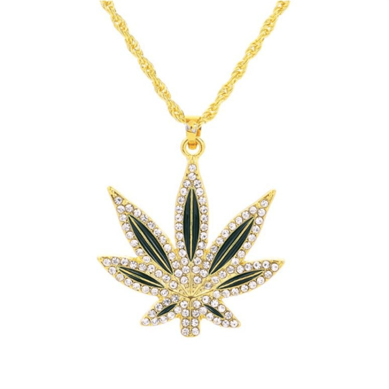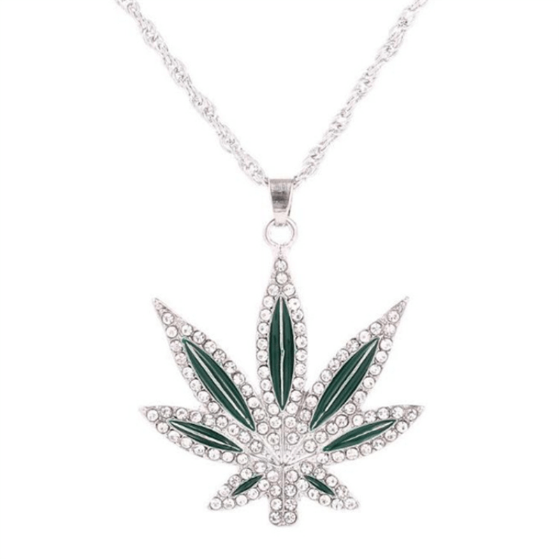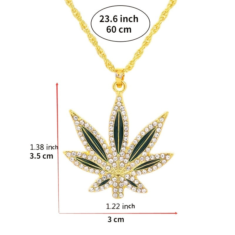 This bling out pendant necklace features a weed leaf design with rhinestones for a stylish look.