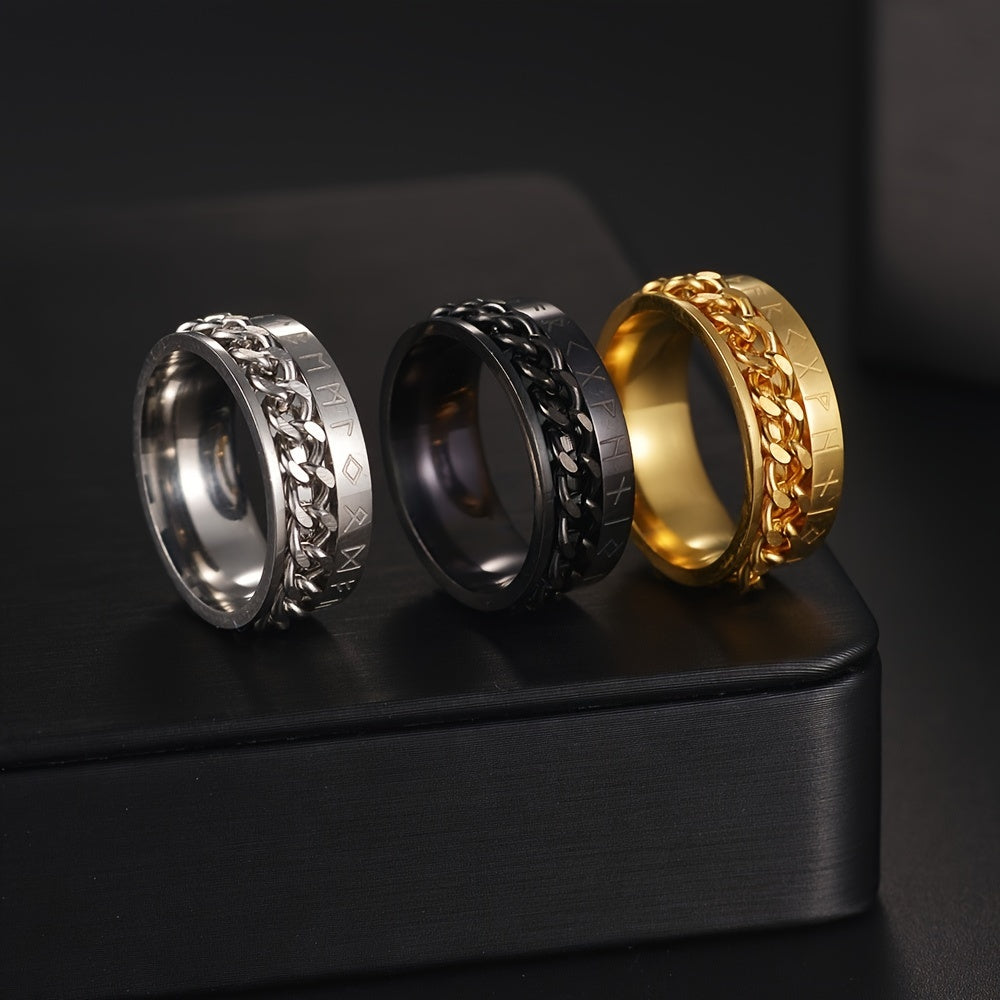 This stainless steel ring features a rotating chain with Viking pattern design. The ring is 8mm wide and 0.31 inches in size.