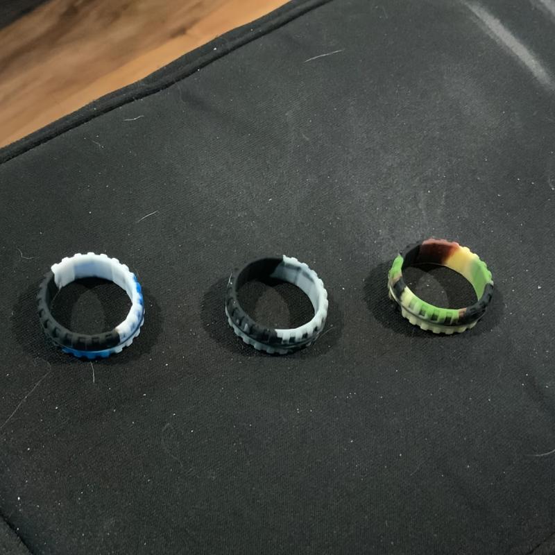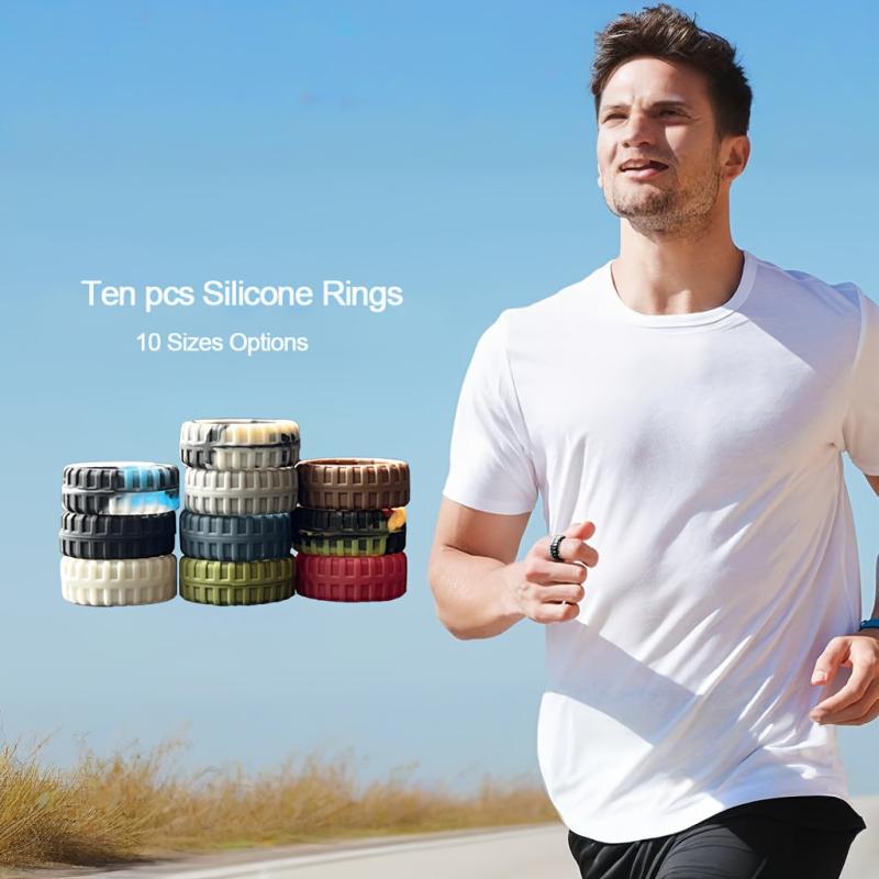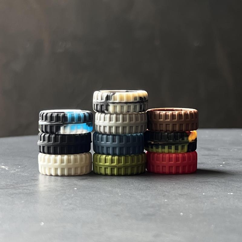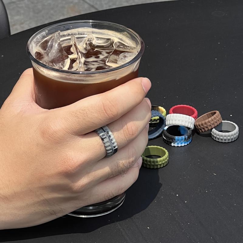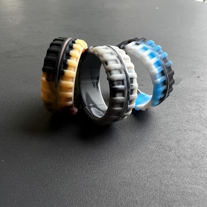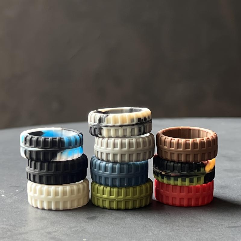 This set of durable rubber wedding rings is perfect for active men. The tire pattern design adds a stylish touch to the brown camouflage color. Made from high-quality silicone, these rings are comfortable to wear and ideal for any outdoor or sports activities.