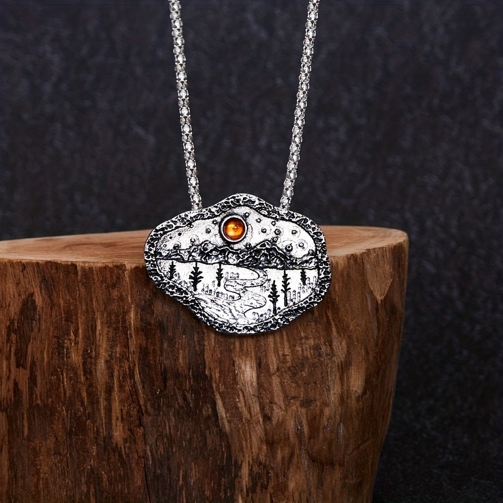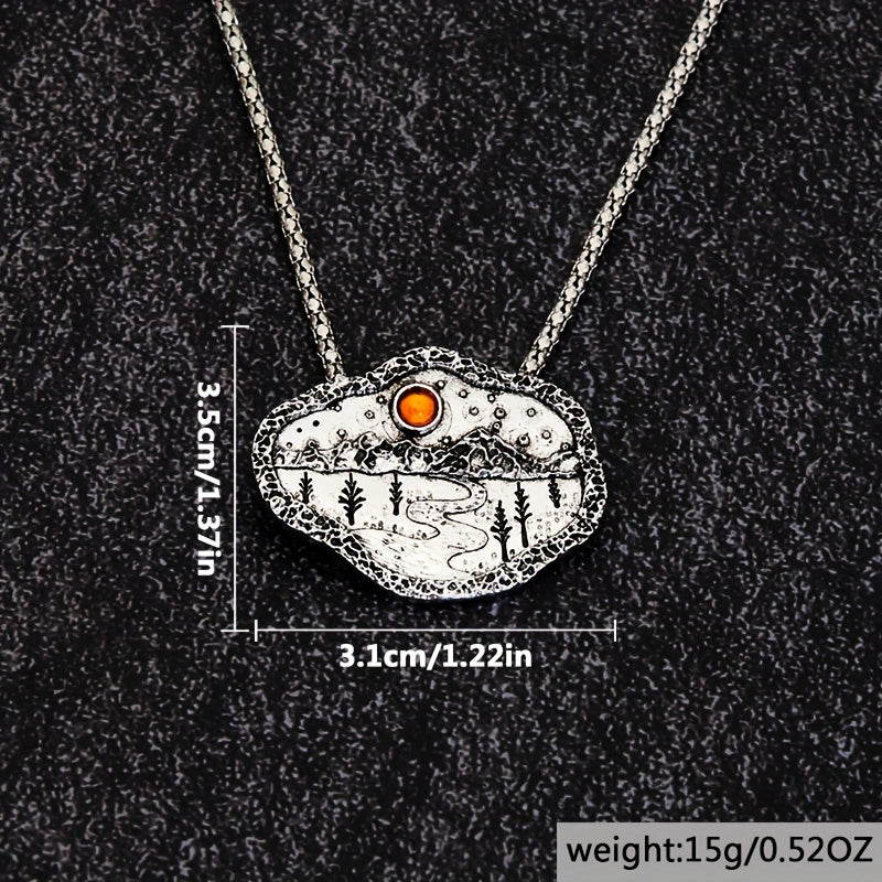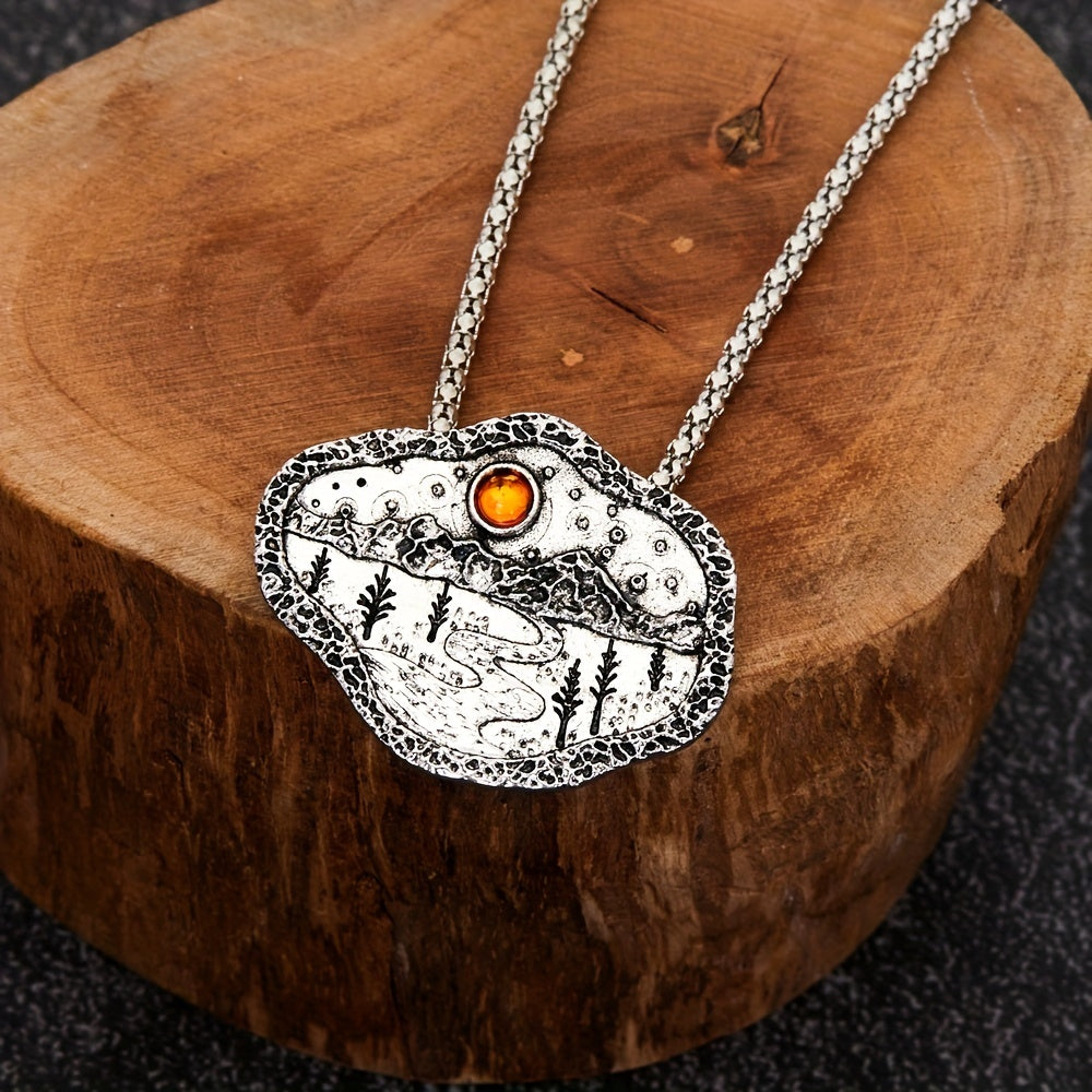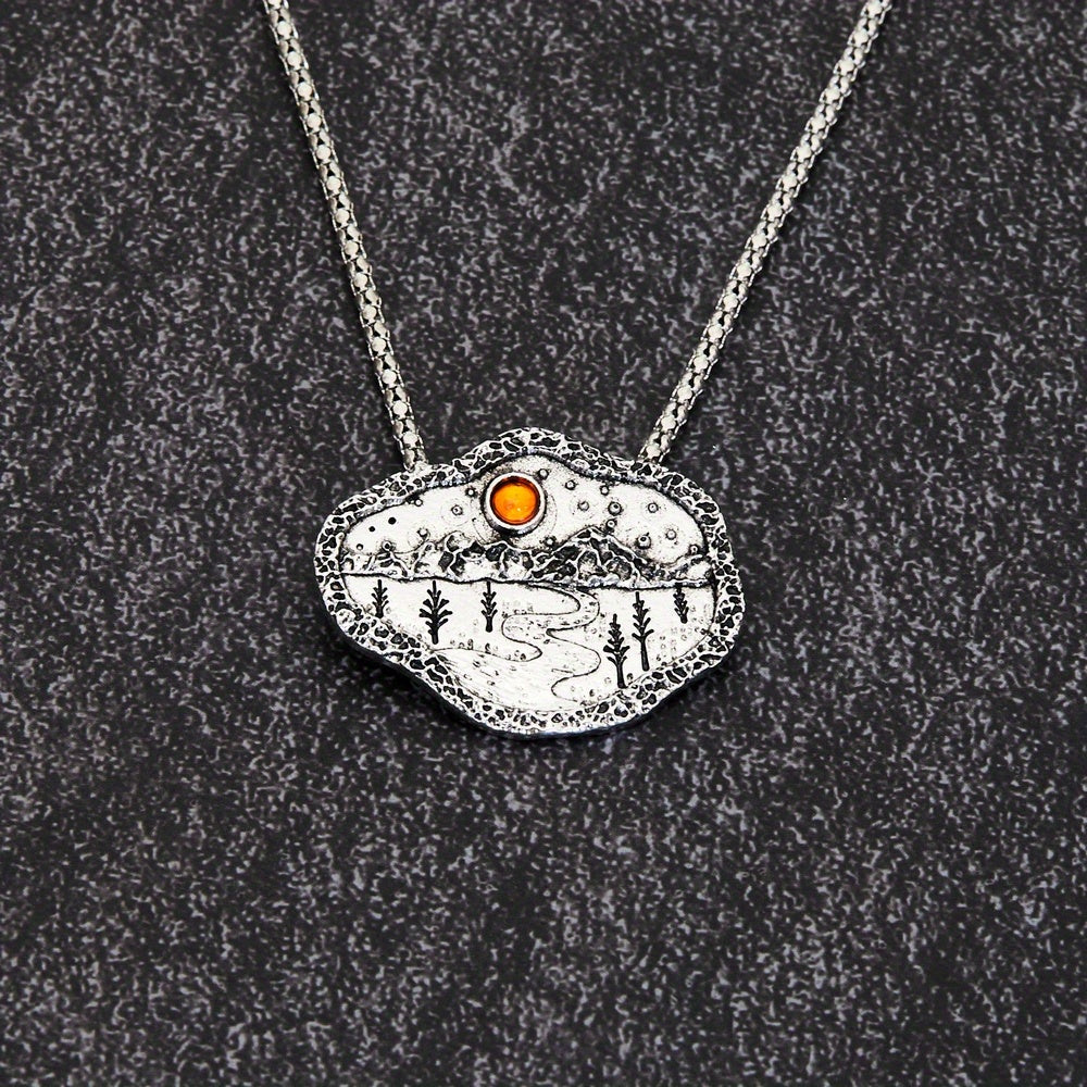 Embrace nature with this stunning silver pendant featuring a forest, river, and mountain design with a ruby inlay. Perfect for gothic or bohemian styles.