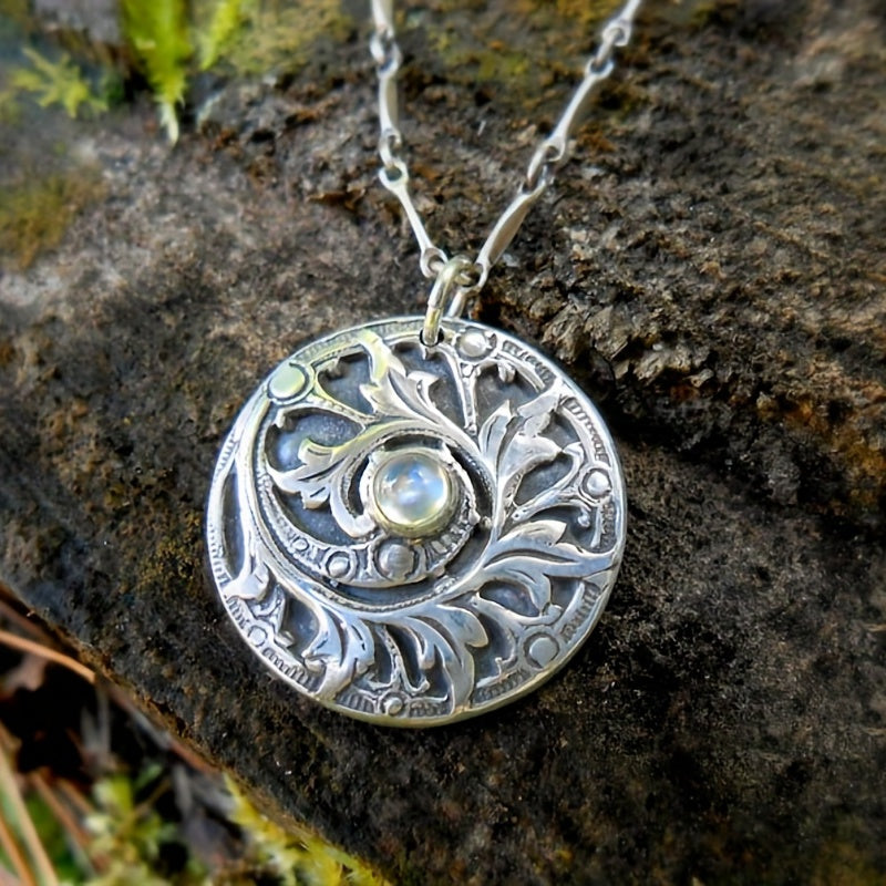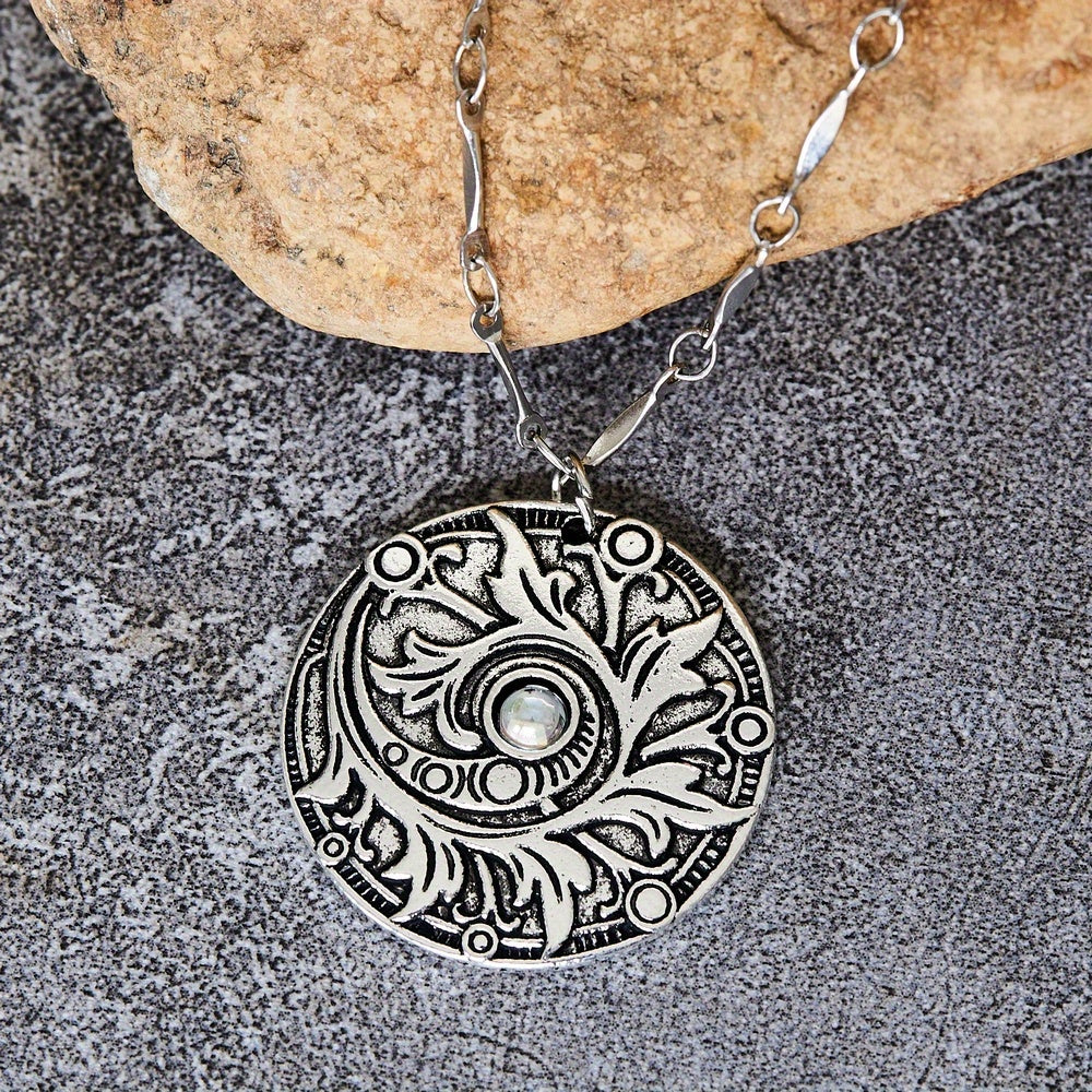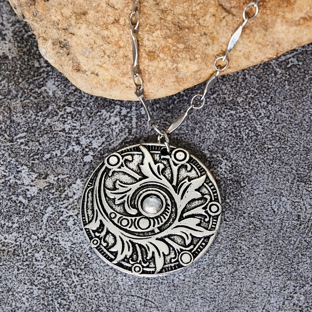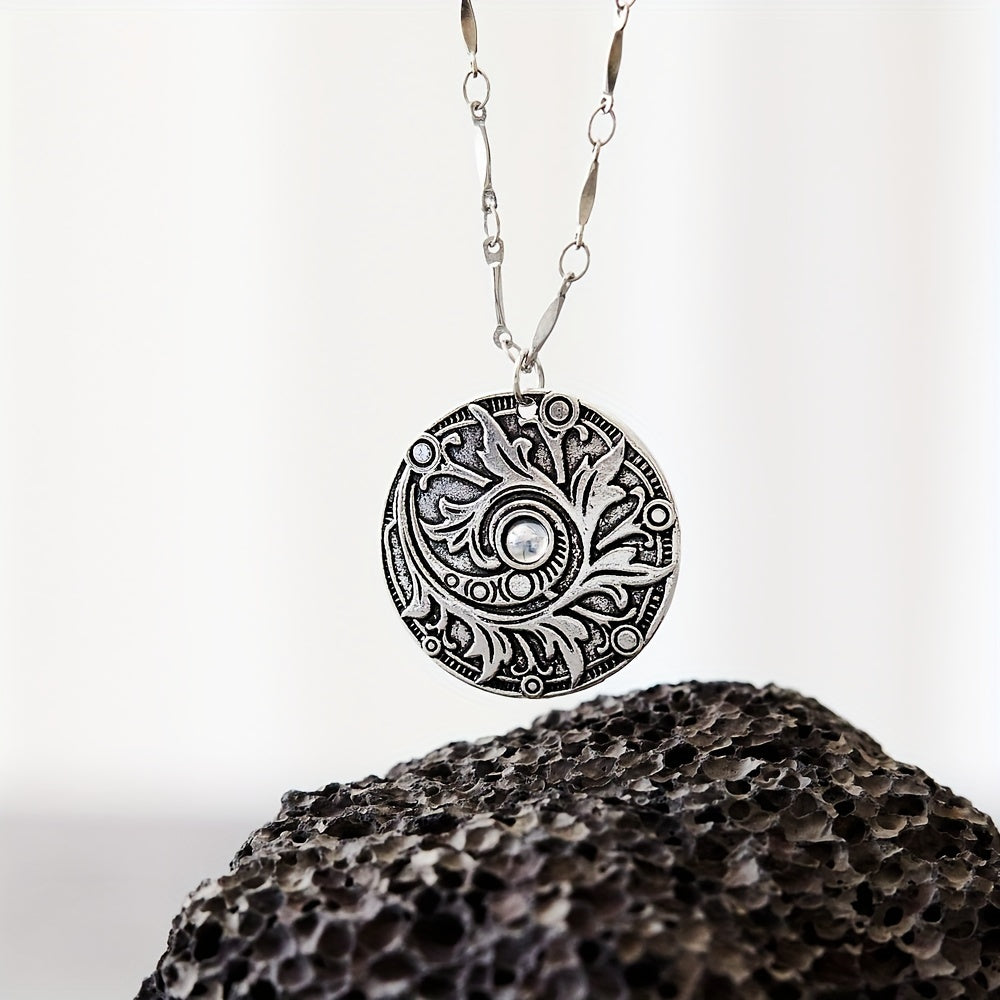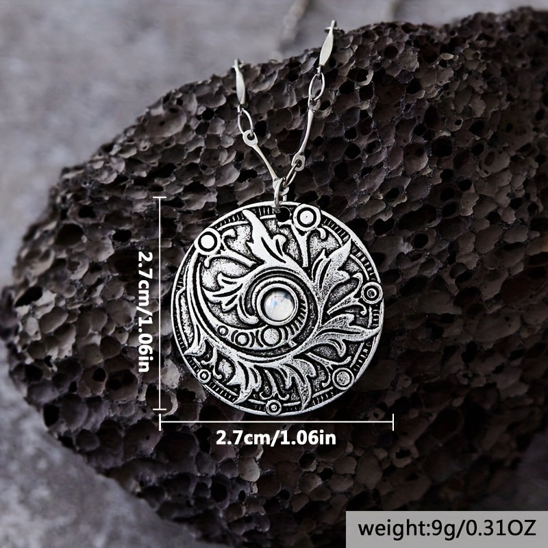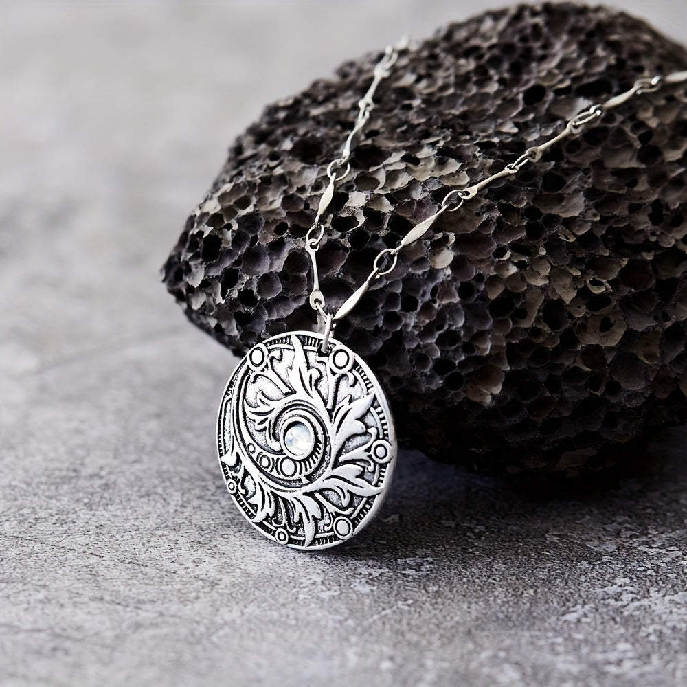 This gothic necklace features a silver boho round plant pattern pendant with gemstone inlay for a unique and stylish look.