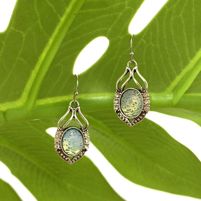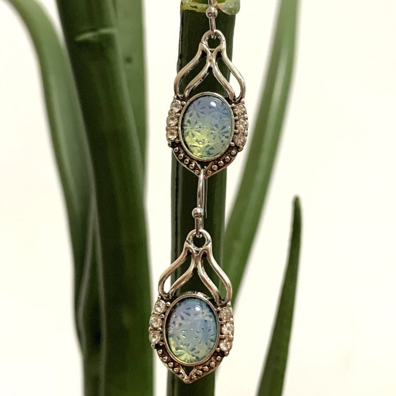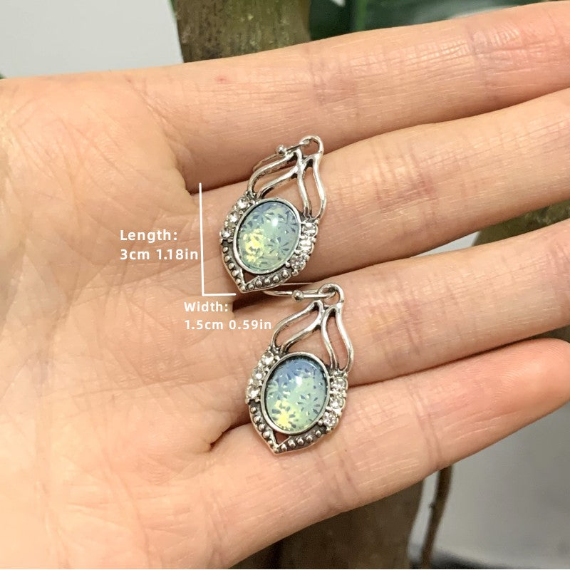 These elegant earrings feature a snowflake pattern design with sea moonstone, perfect for adding a touch of charm to your outfit.