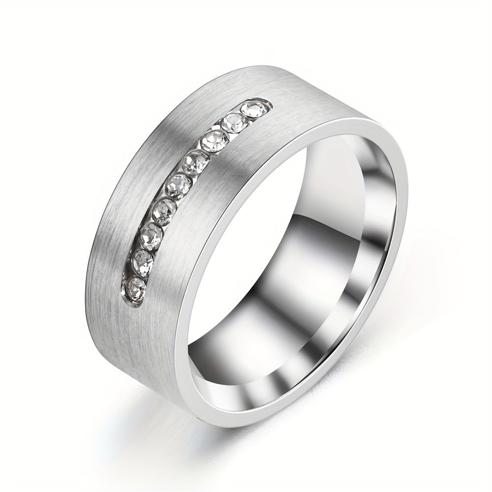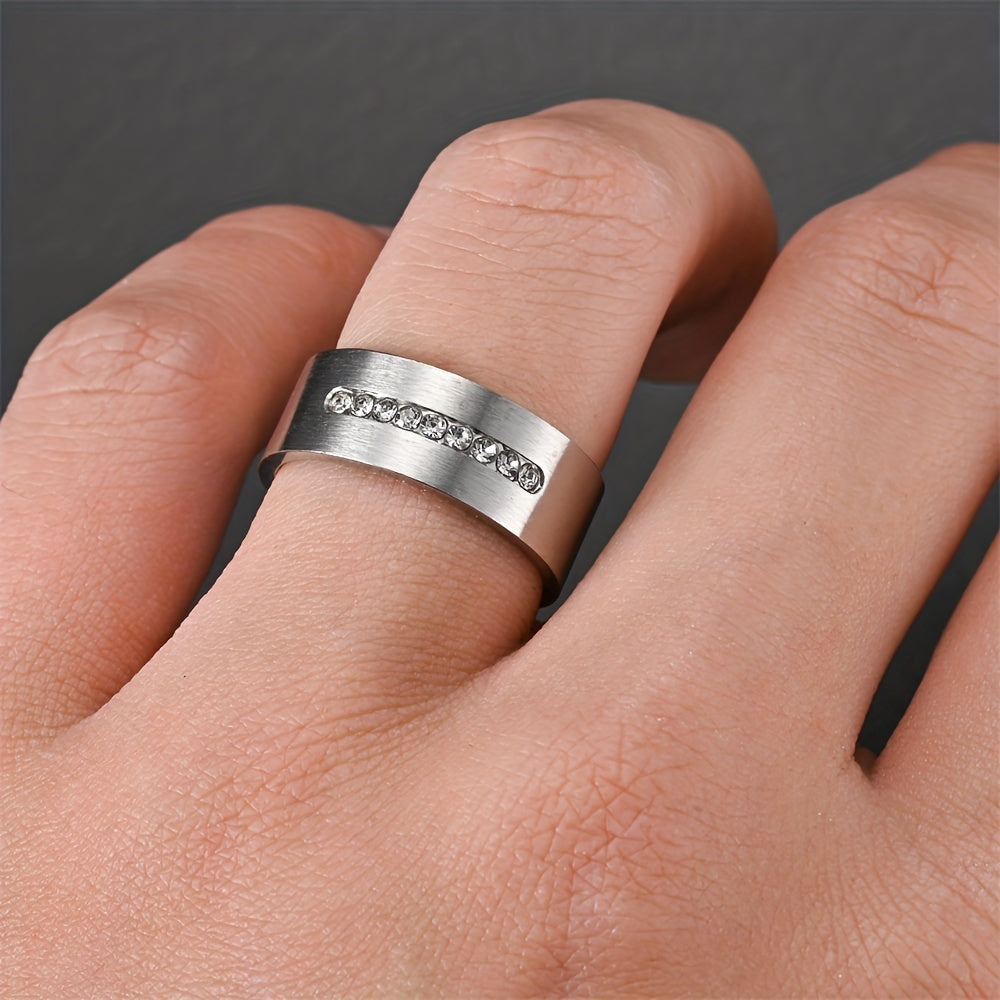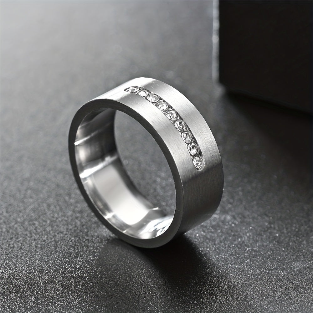 This stylish men's ring features a stainless steel band with artificial diamond accents. Perfect for weddings, holidays, or special occasions.