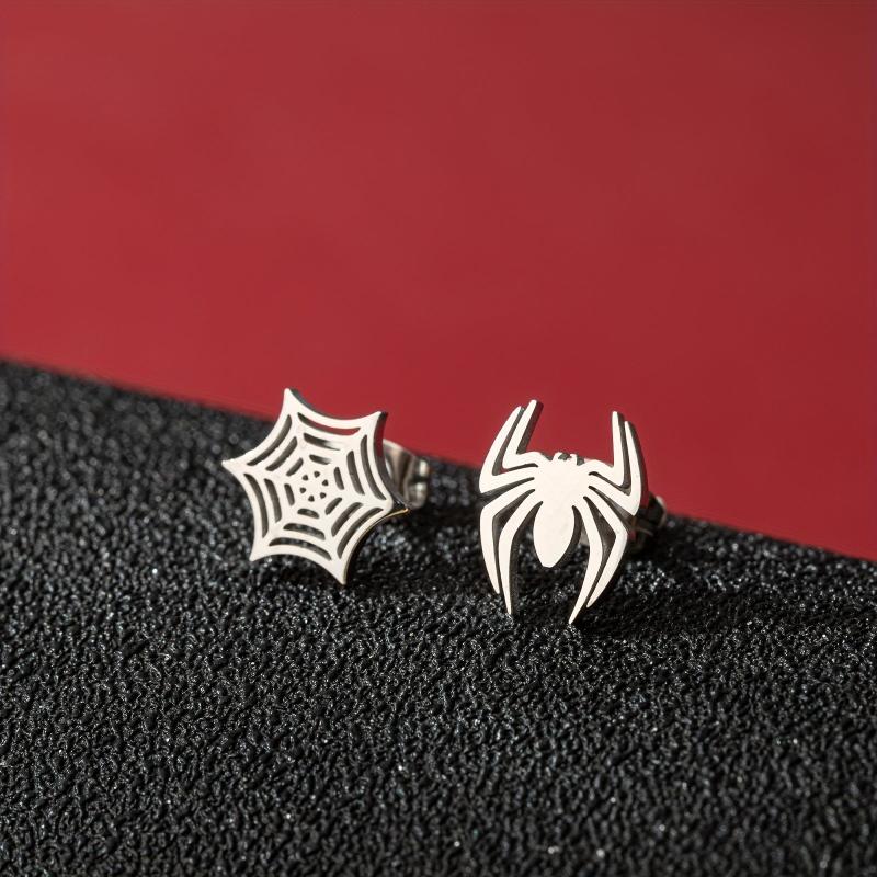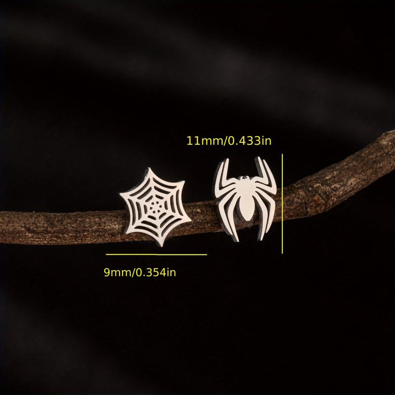 Enhance your style with these unique spider and web stud earrings made of stainless steel. Perfect for adding a touch of edge to your look.