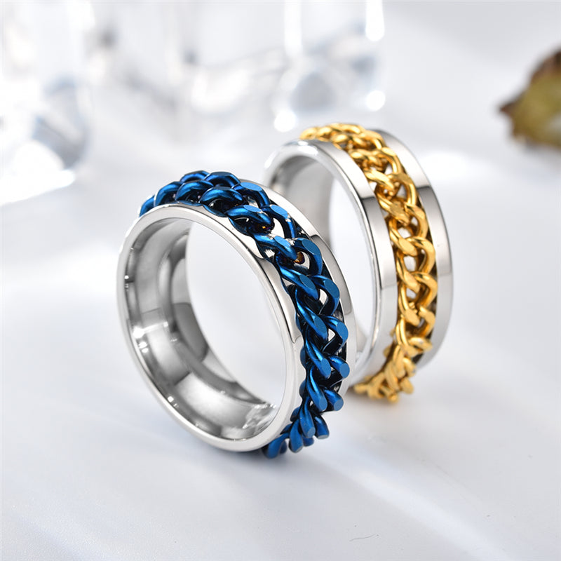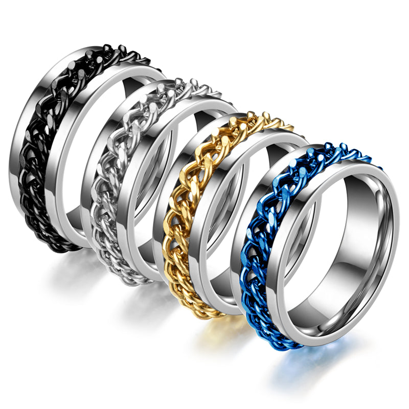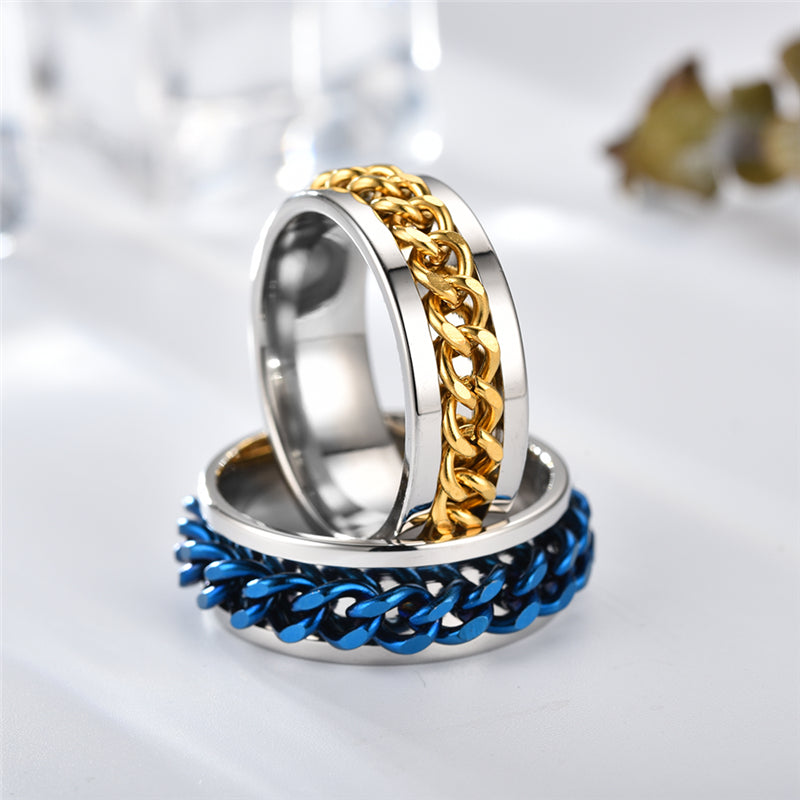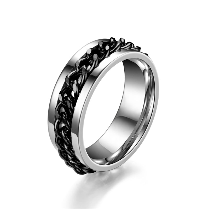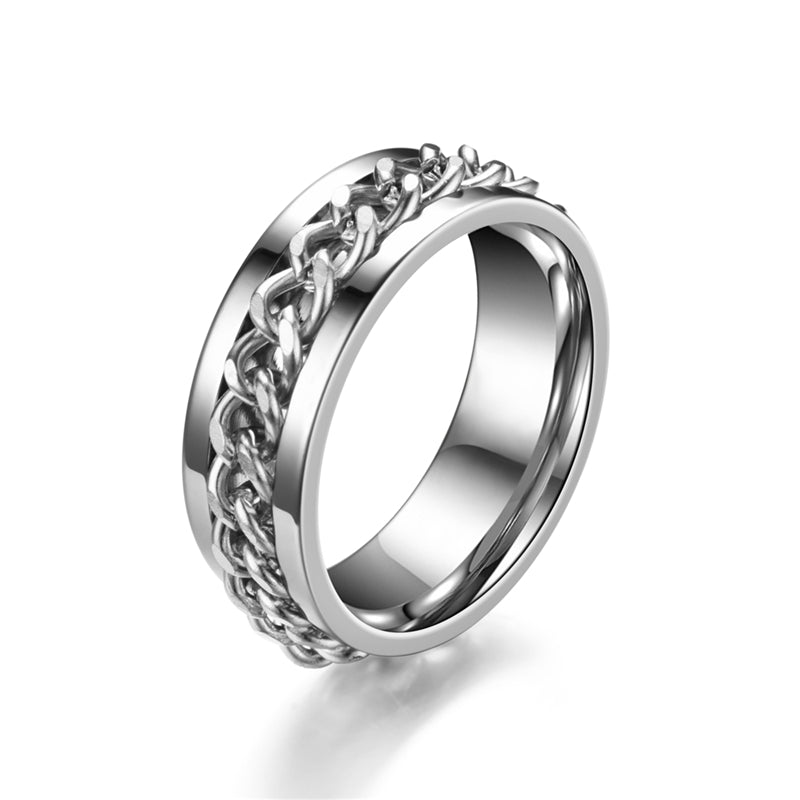 Add a stylish touch to your party outfit with this stainless steel turning chain ring.