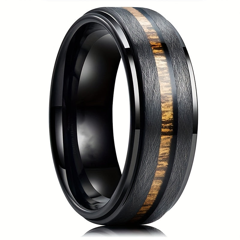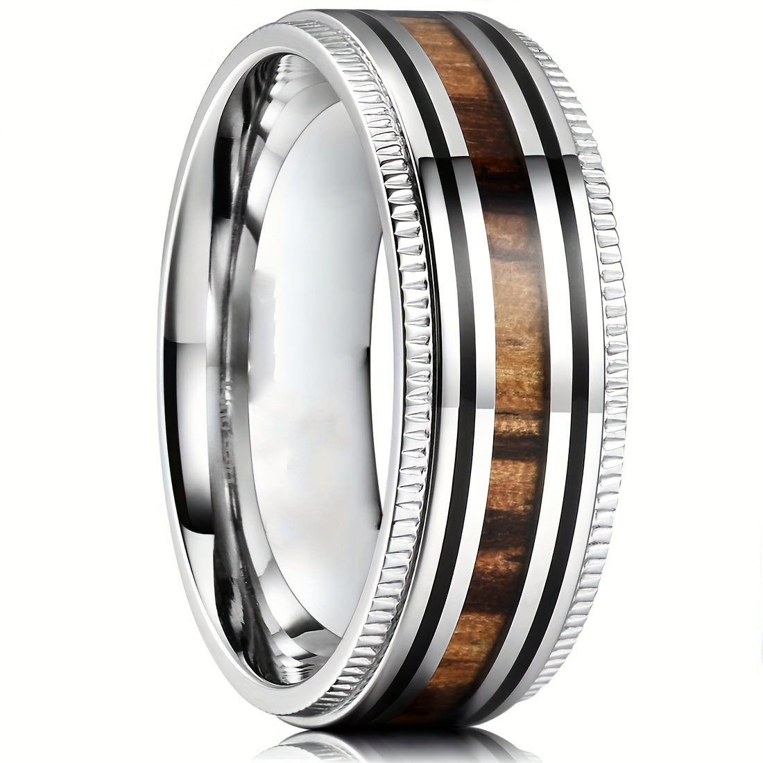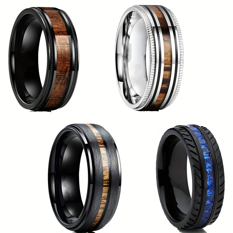 Add a touch of style with this unique stainless steel ring featuring a wooden grain design. Available in 4 styles, this ring is perfect for the modern man.