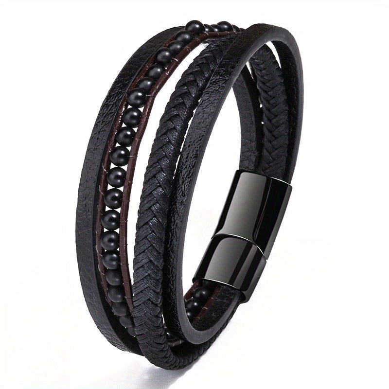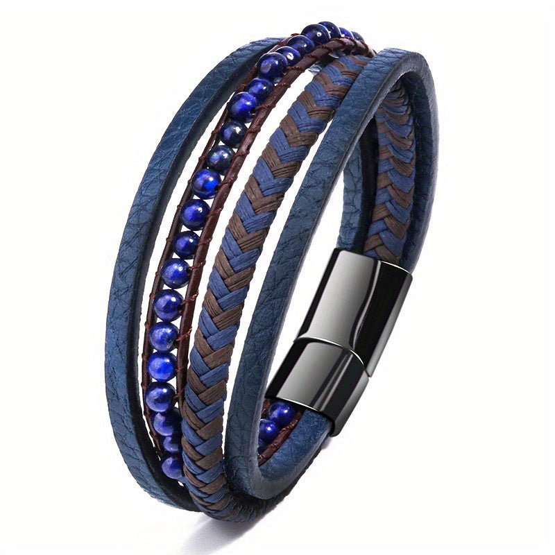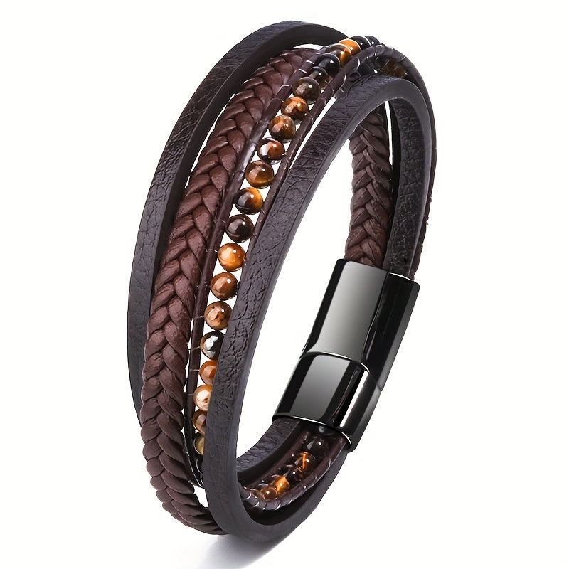 Elevate your style with this woven natural stone leather bracelet featuring a stainless steel buckle. Perfect for adding a touch of rugged sophistication to any outfit.