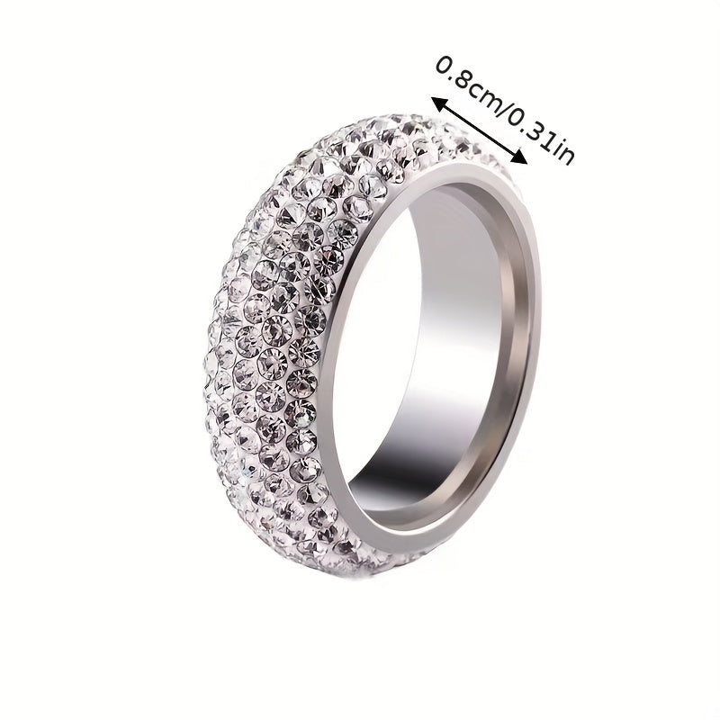 This stylish men's ring is made of titanium steel and features five rows of artificial diamonds in a curved design.