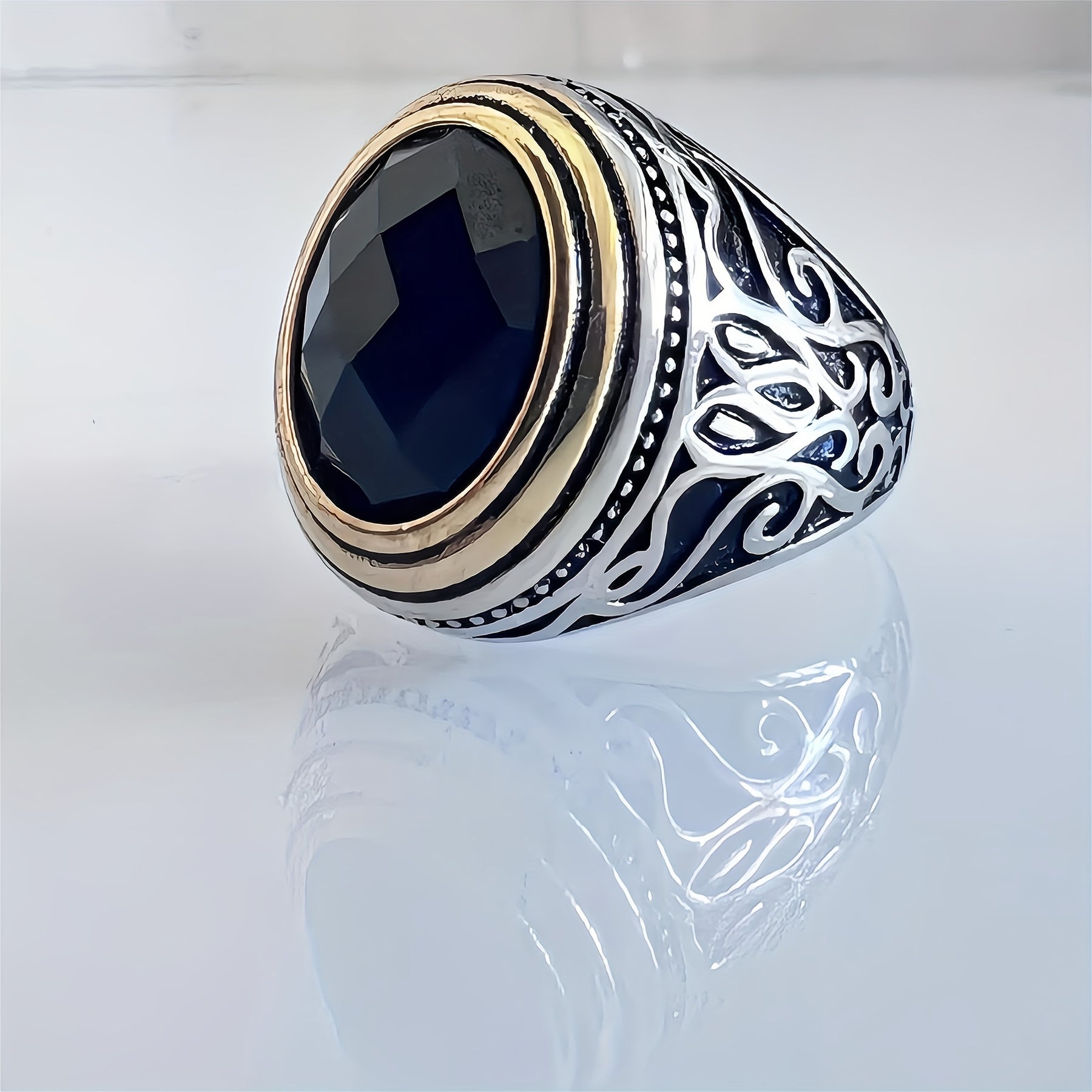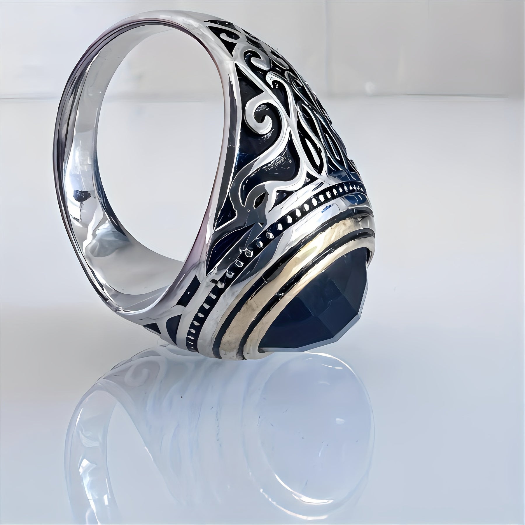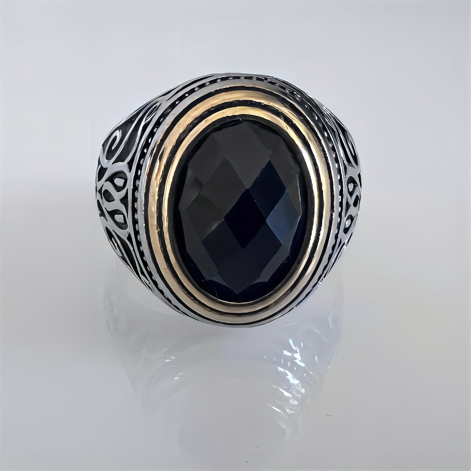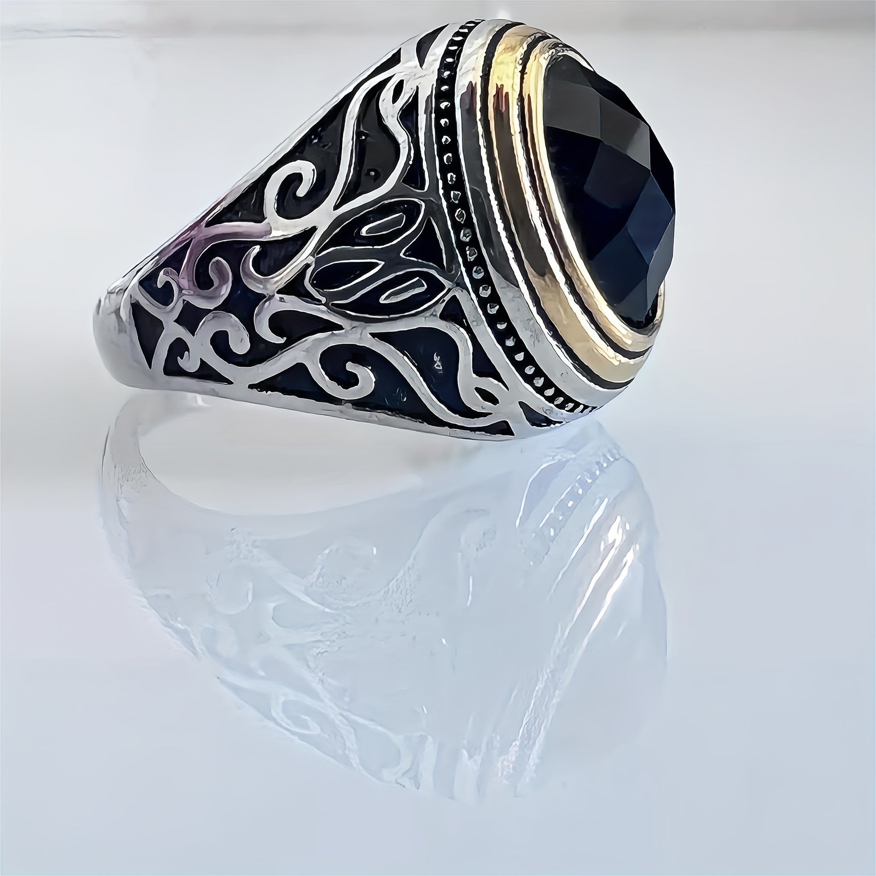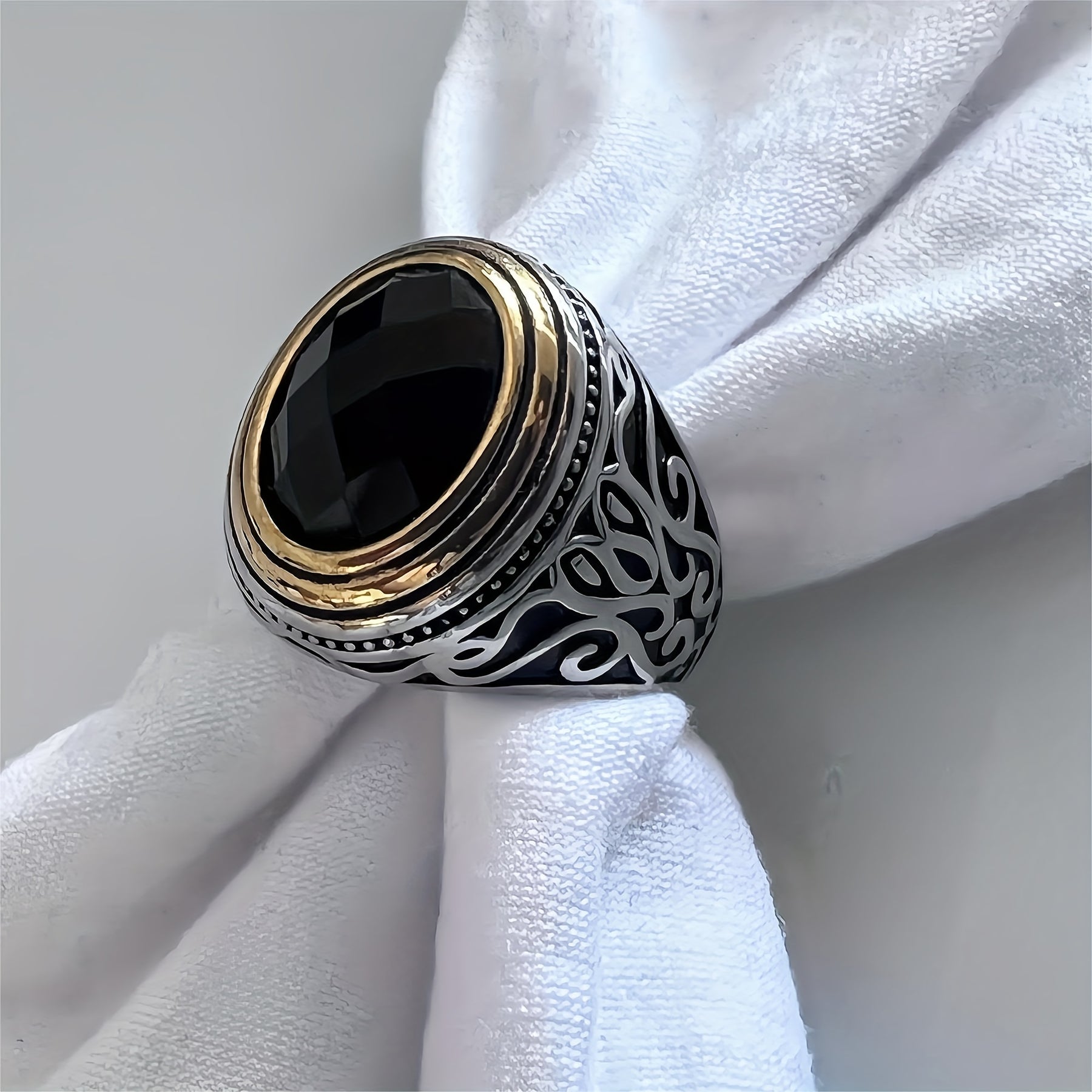 This men's vintage ring features an agate glass stone set in stainless steel with intricate carvings. A unique and stylish accessory for any occasion.